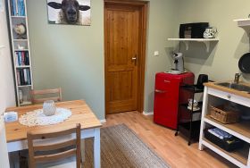 Liebevoll eingerichtetes Apartment (27 qm) für 2 Personen mit einem Wohn-Schlafbereich und Duschbad. Die kleine Küche bietet Ihnen neben einem Zwei-Platten-Herd einen Kühlschrank, eine Kaffeemaschine, einen Wasserkocher und Geschirr für zwei Personen. Bettwäsche und Handtücher werden gestellt.