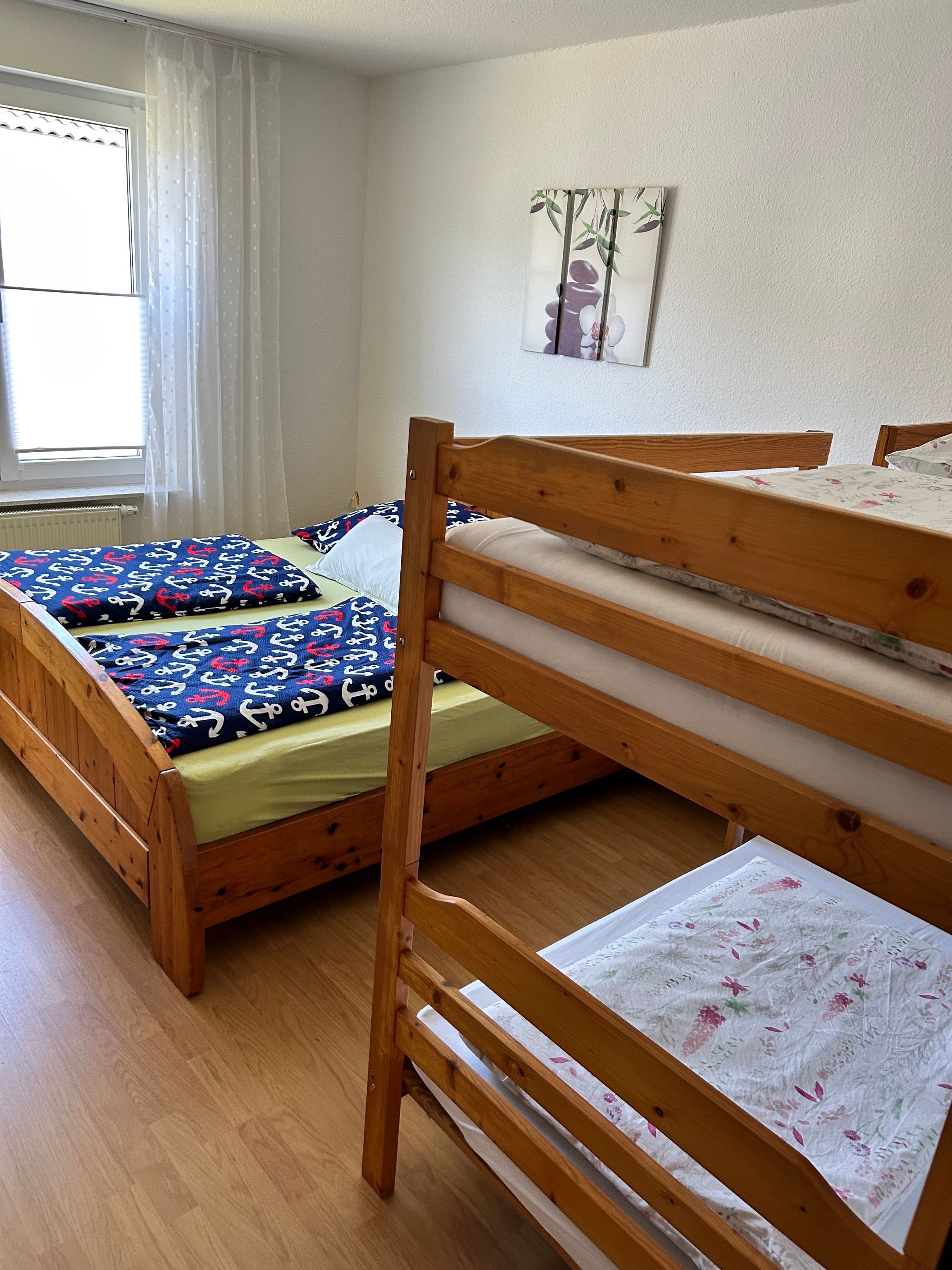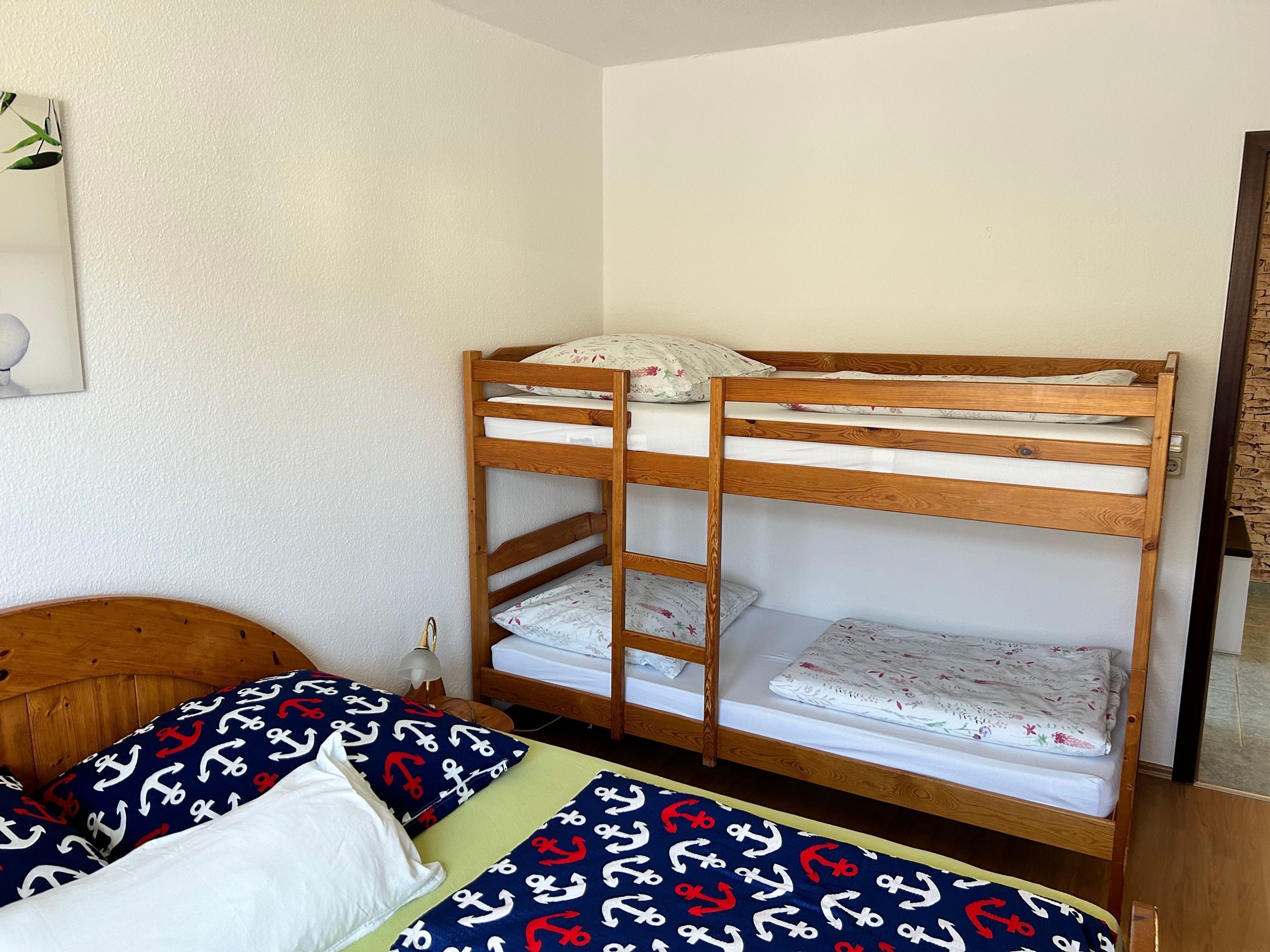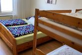 Unsere Ferienwohnung befindet sich im Erdgeschoss. Sie besteht aus einem Wohnzimmer mit TV, einem Schlafzimmer mit Doppelbett und einem Etagenbett, einem Badezimmer mit Dusche/WC und einer komplett eingerichteten Küche mit Sitzecke. Zusätzlich gibt es eine Terrasse und einen Kamin. PKW-Stellplatz ist vorhanden.