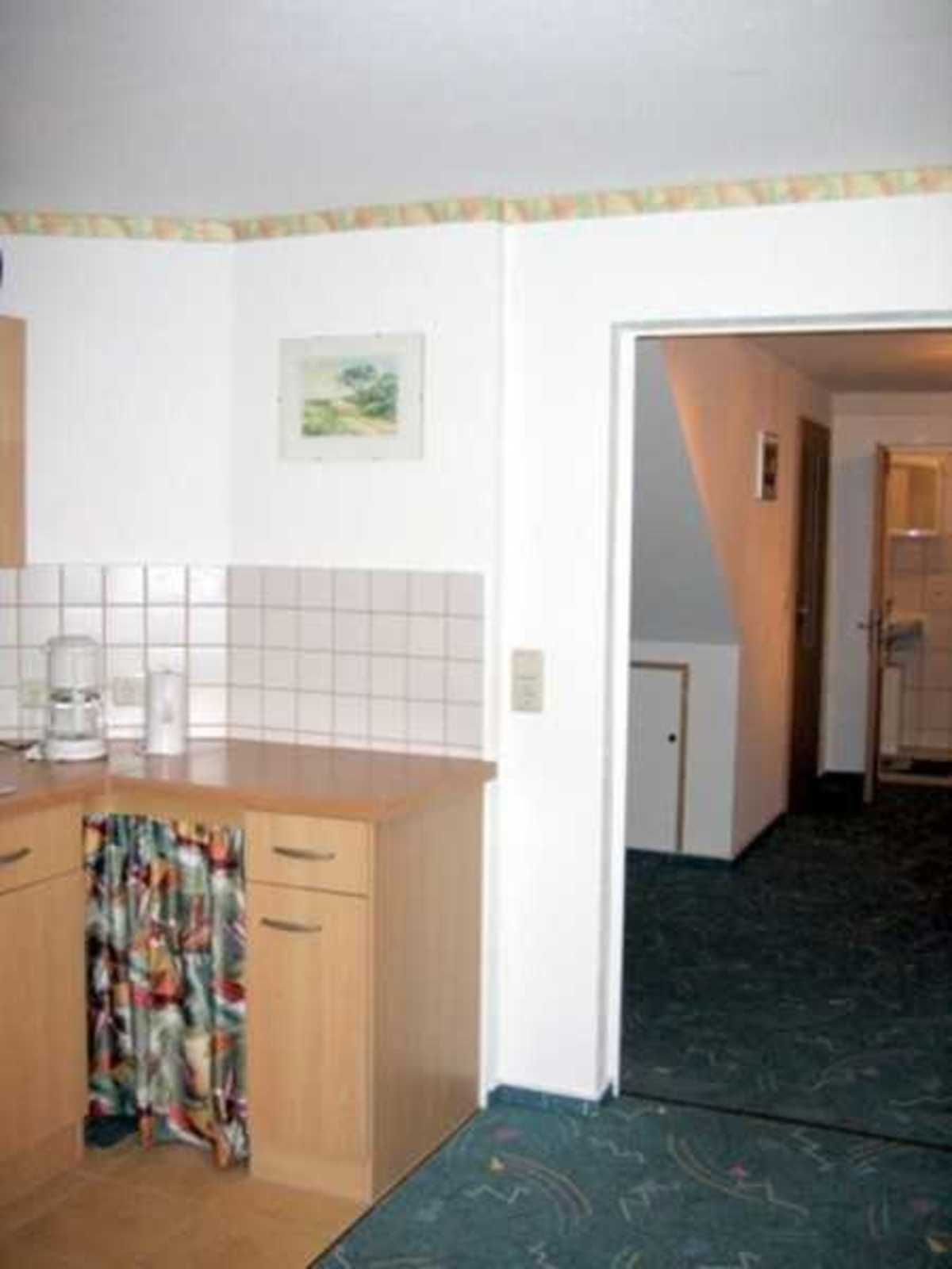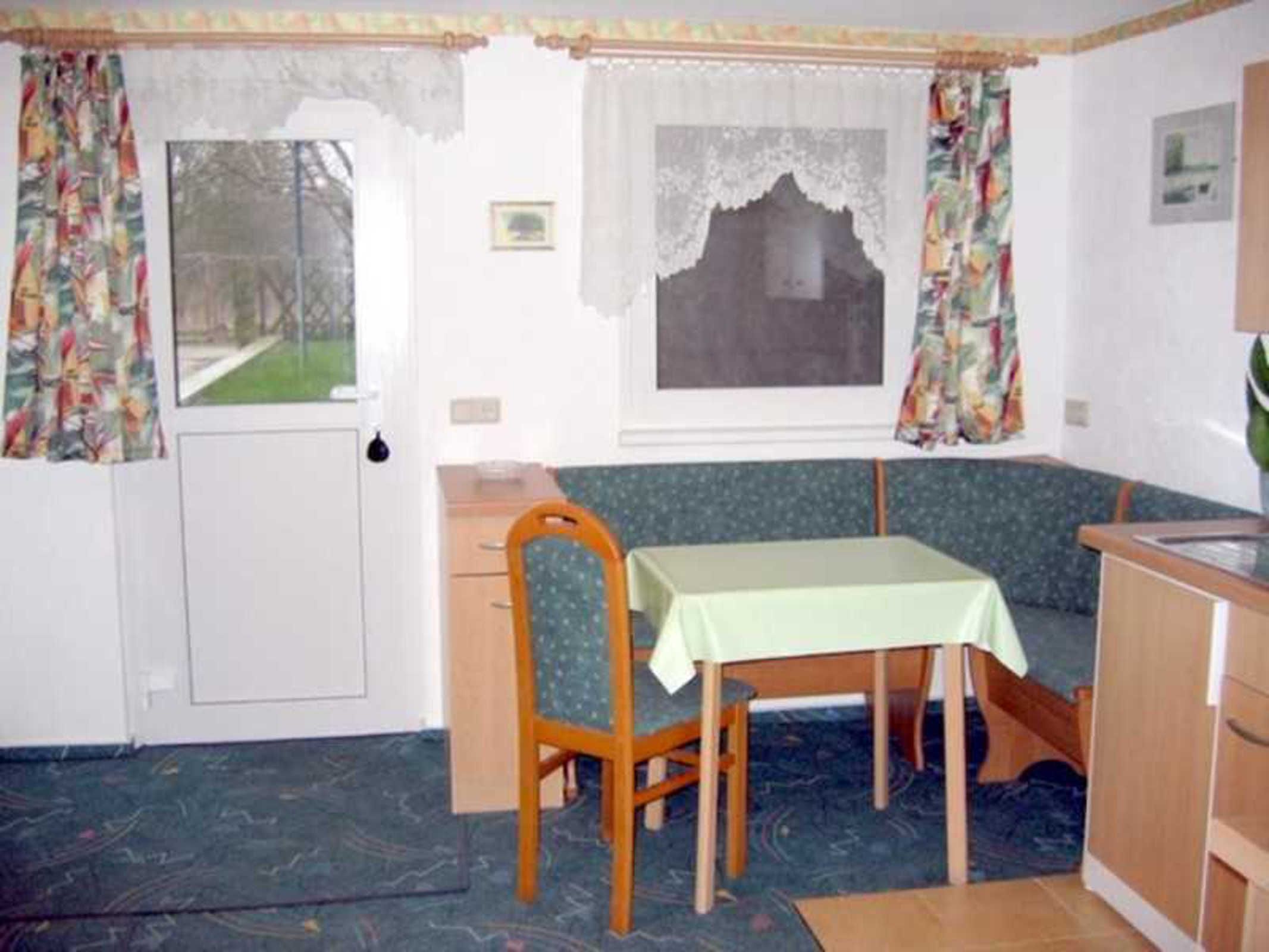 • 1 Wohnküche im Eingangsbereich mit Essecke sowie Kaffeemaschine, Wasserkocher, Toaster