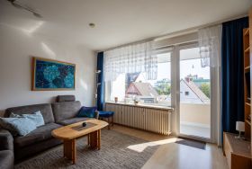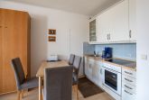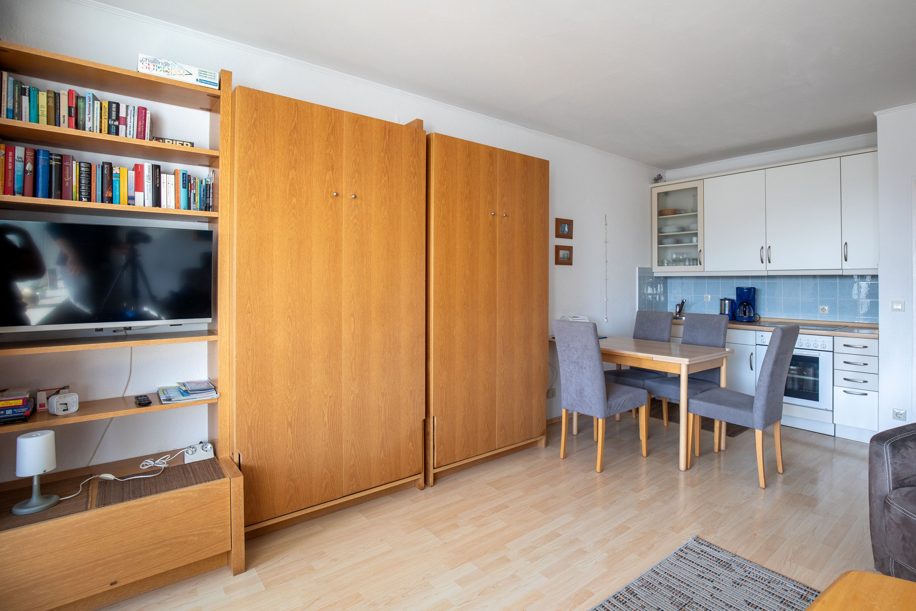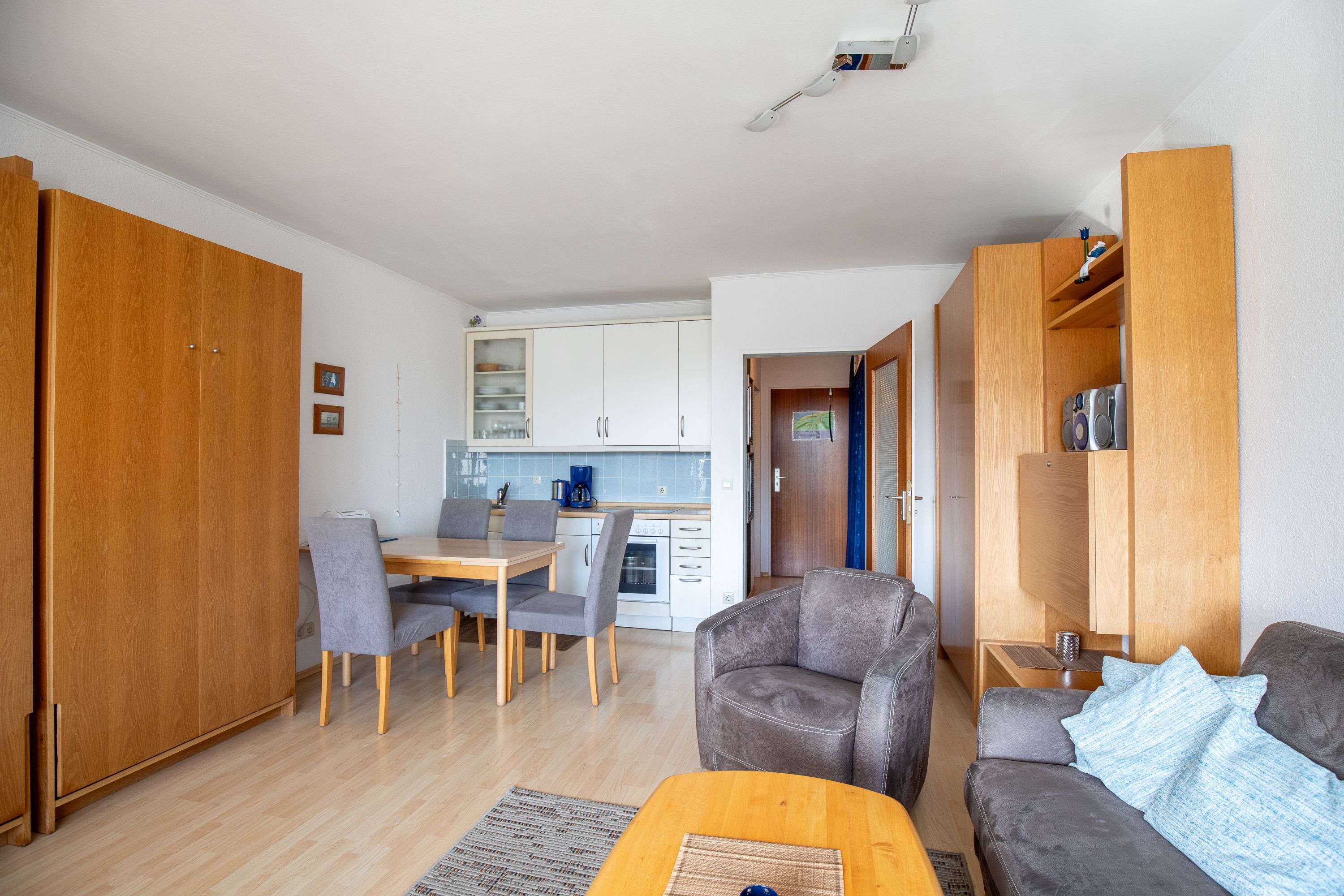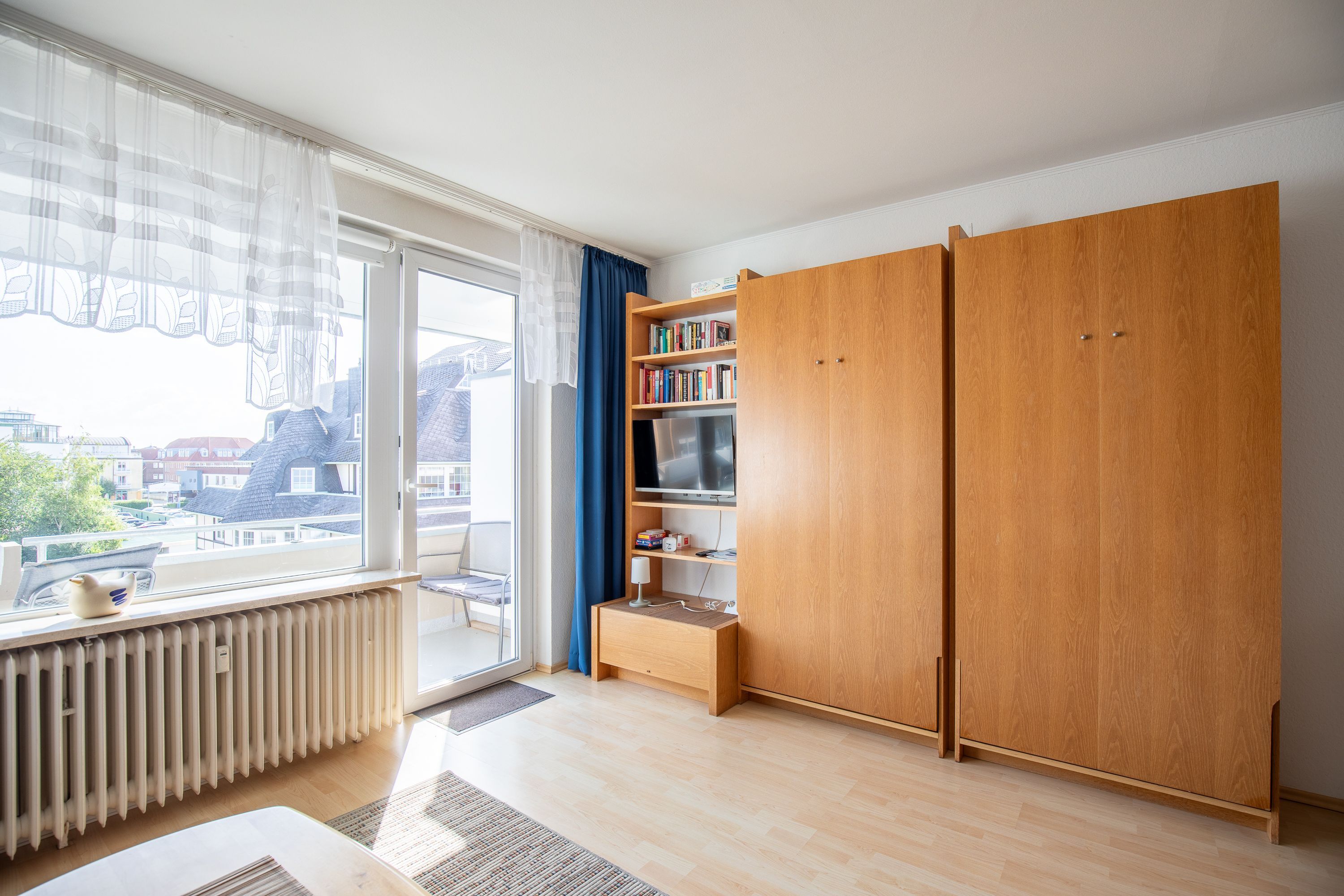 Die Ferienwohnung (2. Obergeschoss) mit einer Größe von ca. 32 m² Wohnfläche ist komplett bis zu 2 Personen ausgestattet. 1 Wohnzimmer mit Essplatz, 1 Flachbildfernseher, Sofa und Sessel, Küche mit Kühlschrank und Gefrierfach, Cerankochfeld, Backofen, Kaffeemaschine, Wasserkocher und Toaster, Kleiderschrank, Flur (mit Etagenbett), Bad mit Dusche und WC, Balkon mit Blick zur Nordsee und dem Strand, Balkonmöbel, Nichtraucherwohnung, keine Haustiere, PKW-Stellplatz am Haus.