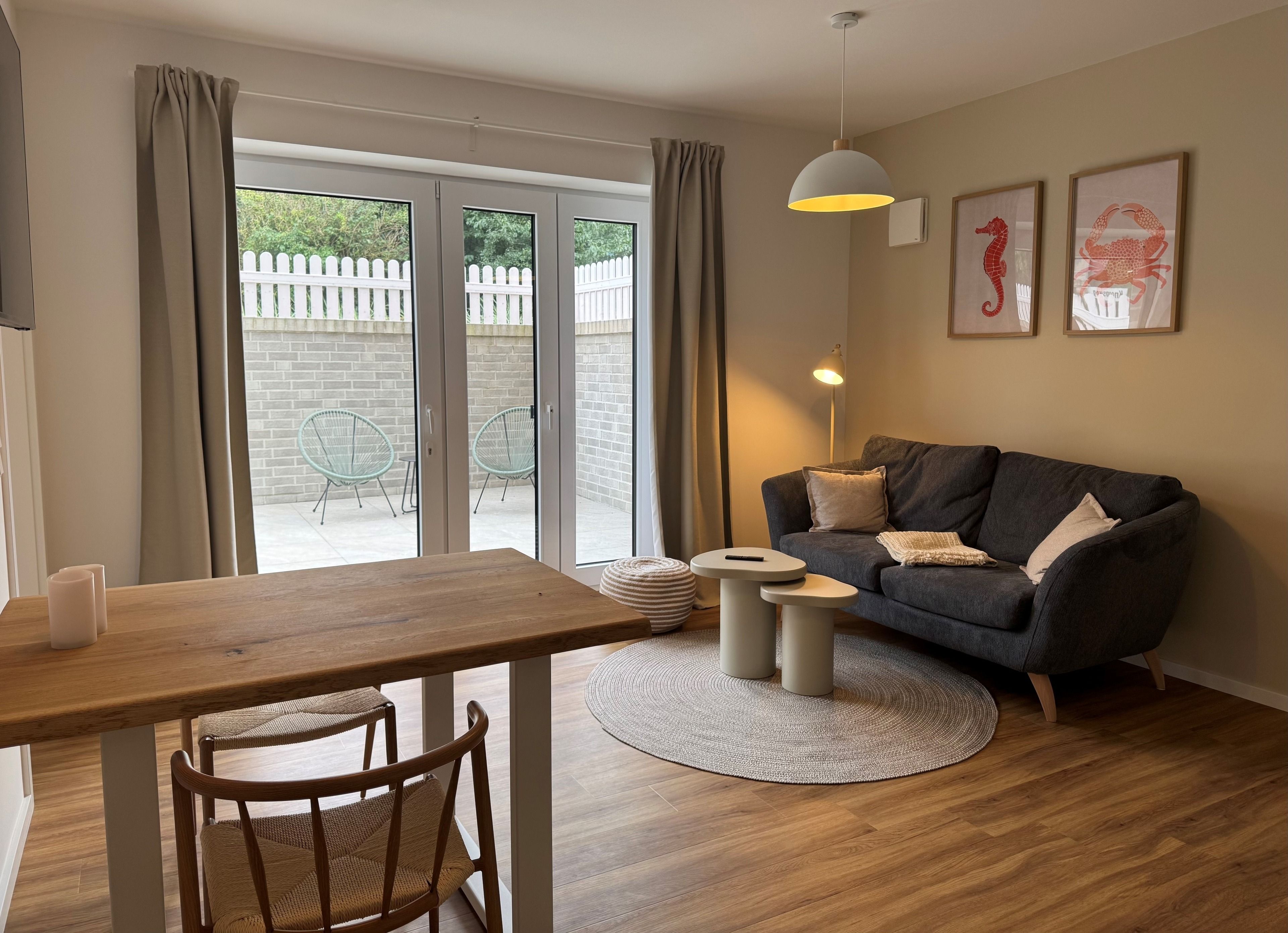 Der offene Wohn- und Essbereich ist geschmackvoll in Sandtönen gehalten. Der große Fernseher sorgt für entspannte Abende; ganz gleich, ob Sie ihn vom Sofa oder vom Esstisch aus nutzen möchten. Die gut ausgestattete Küche lädt dazu ein, auch im Urlaub unkompliziert zu kochen.
