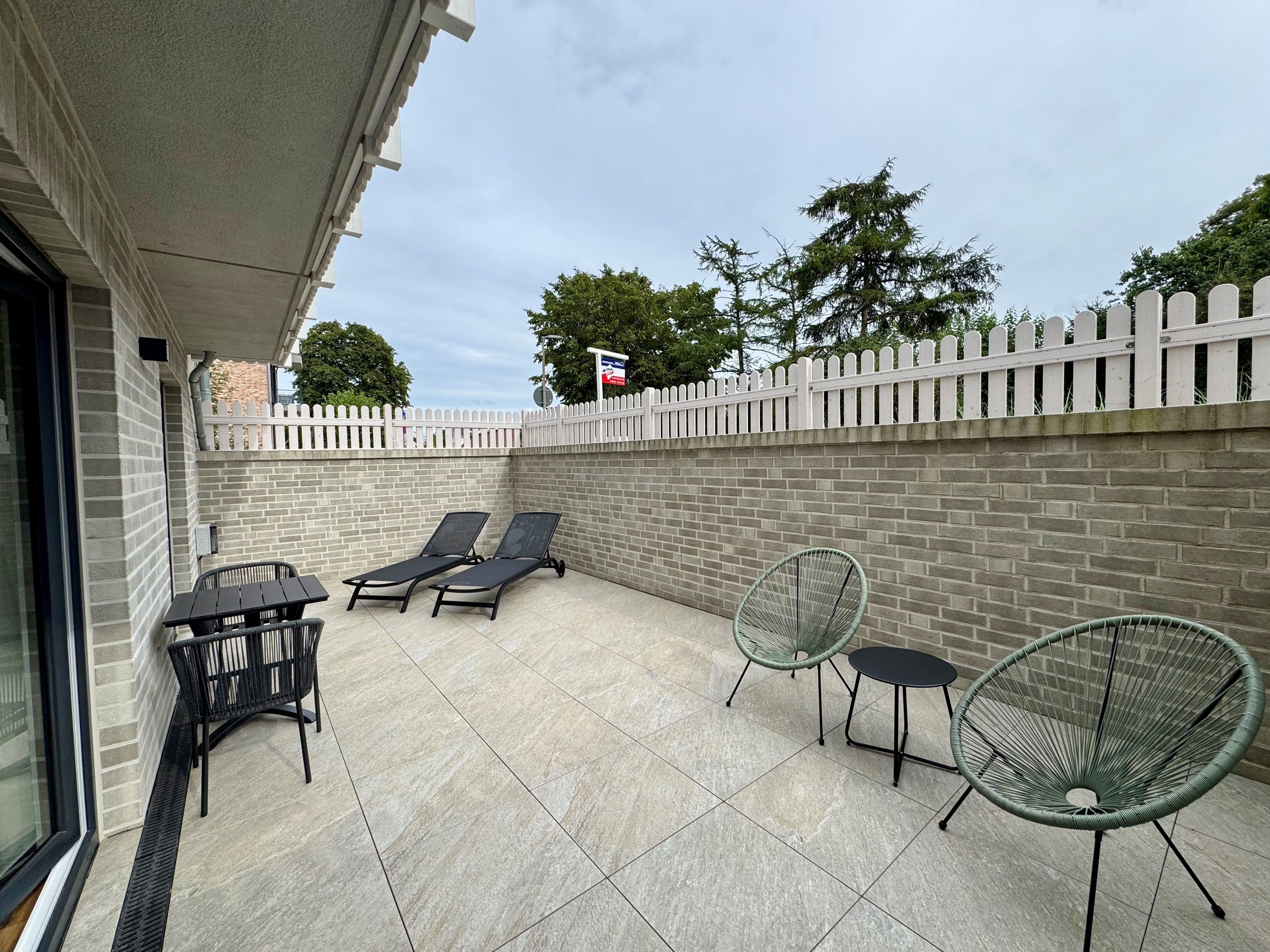 Vom Wohnzimmer aus gelangen Sie auf Ihre große Terrasse. Hier stehen 2 Sonnenliegen und ein Tisch mit 2 Stühlen für Sie bereit.