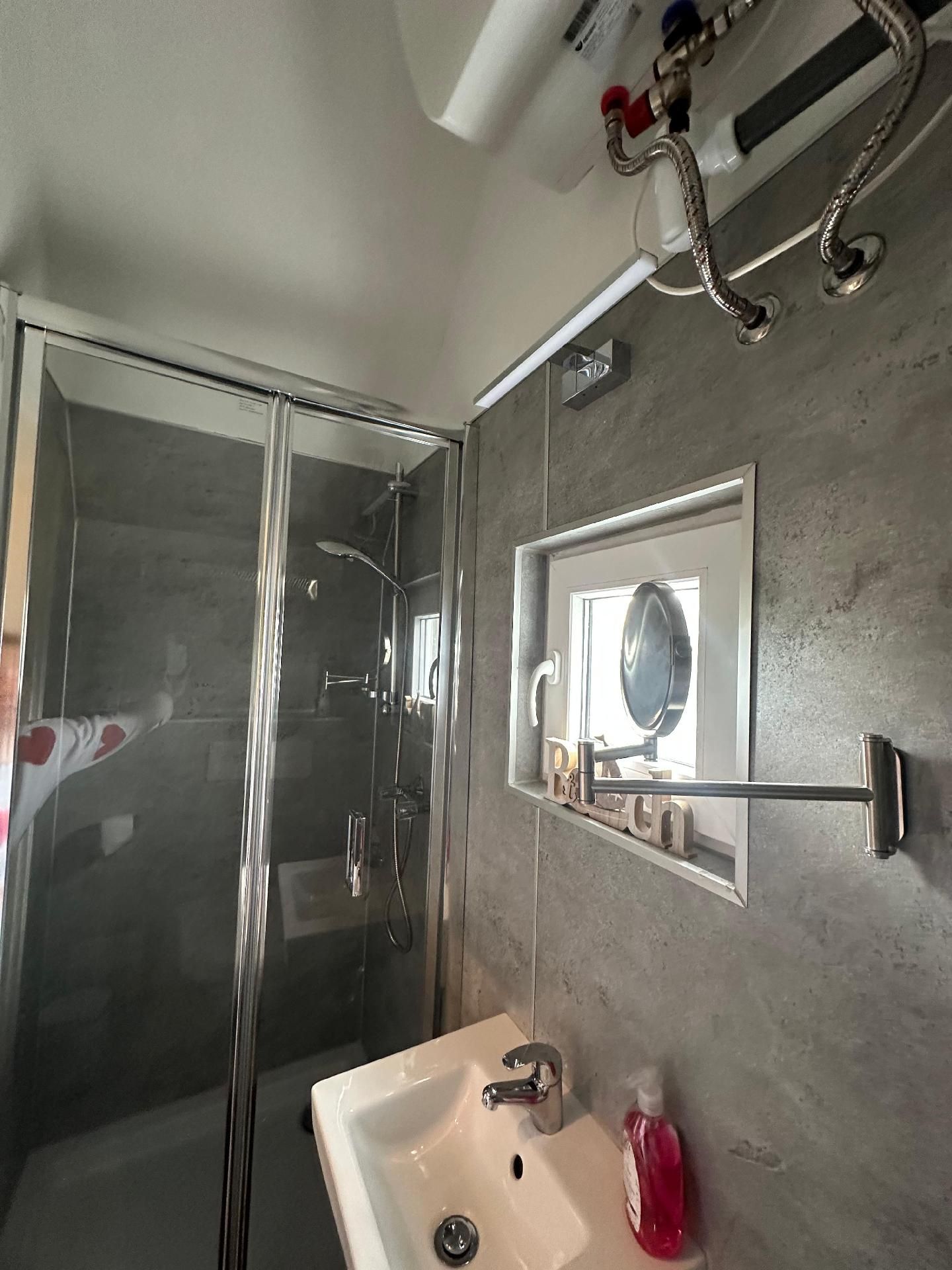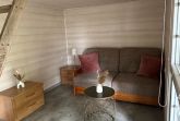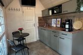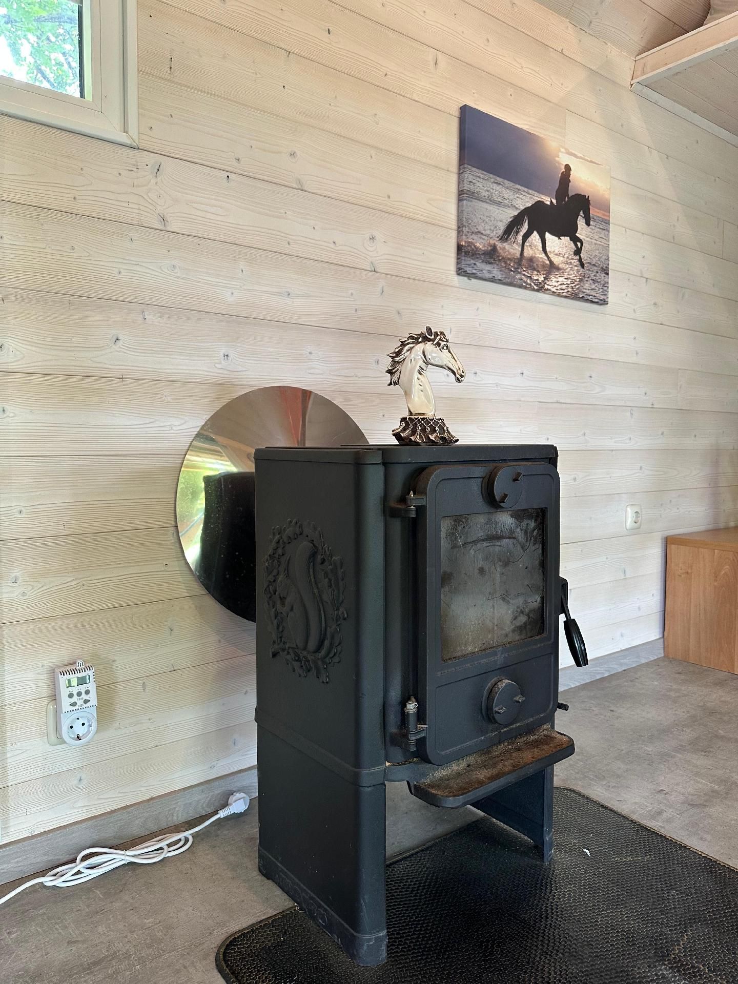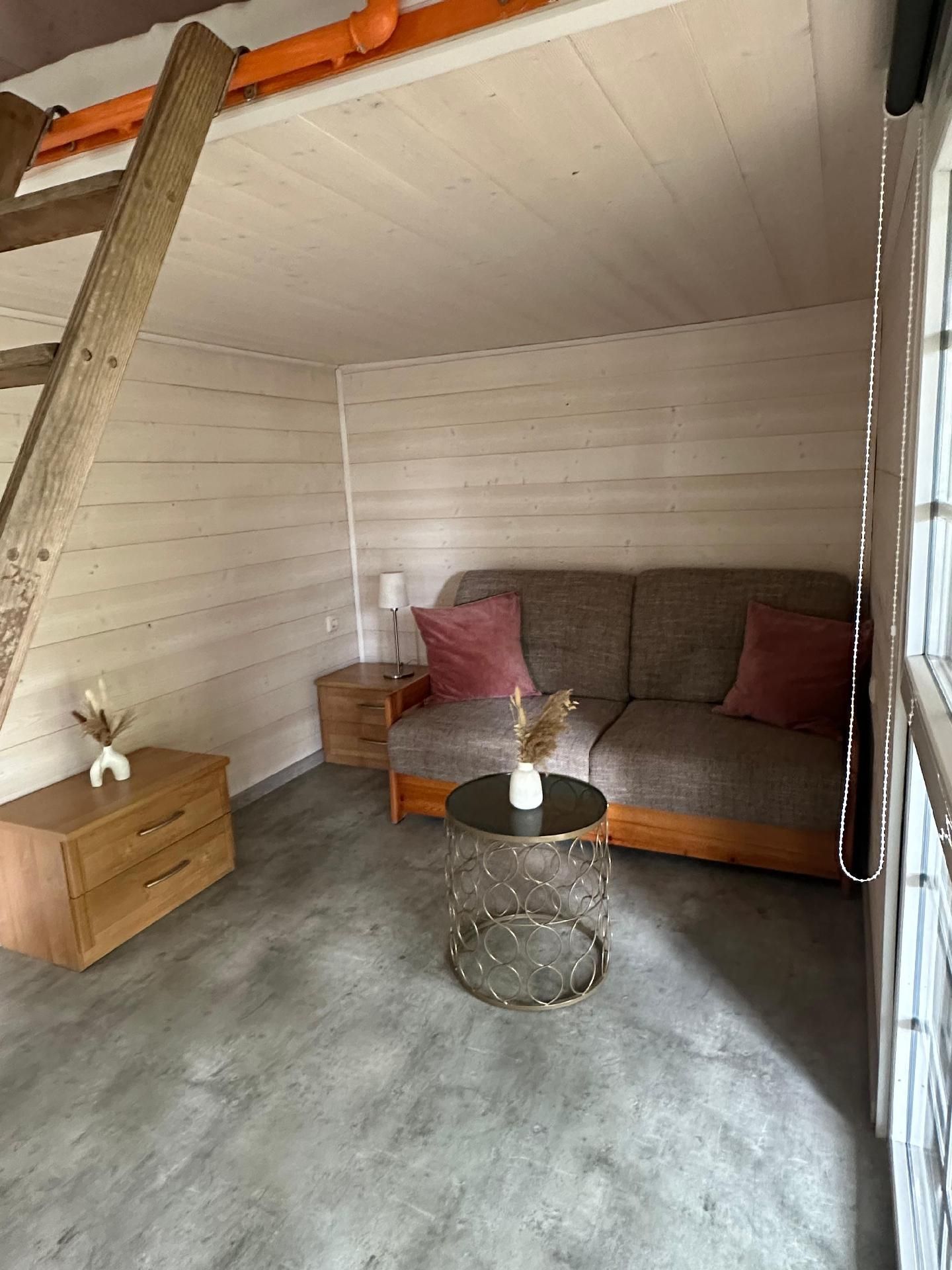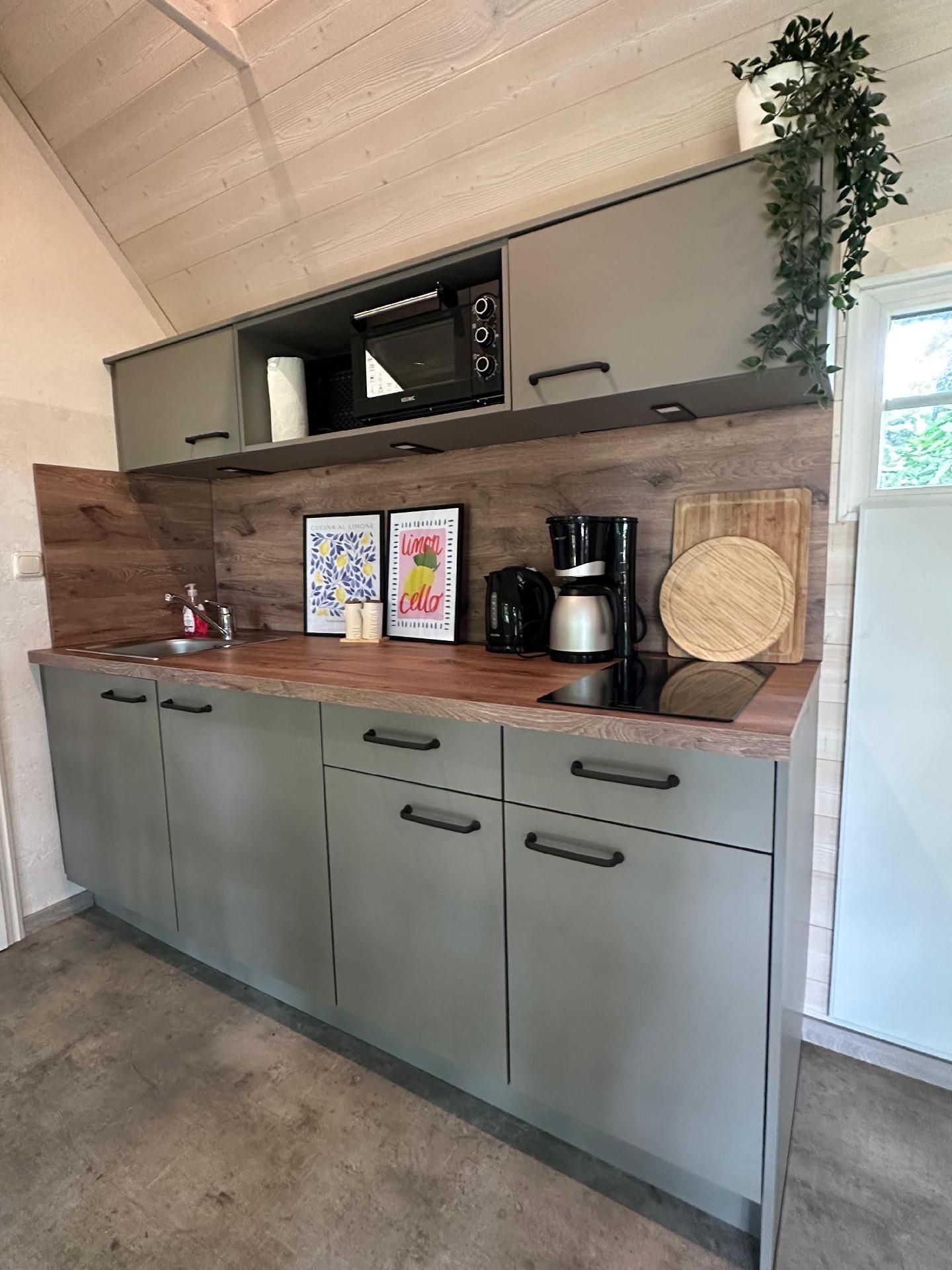 Innerhalb des Mobilheims erwarten Sie praktisch angeordnete Einrichtungselemente und Geräte, die Ihren Aufenthalt angenehm gestalten. Trotz des offenen Studioformats, das ein fabelhaftes Raumgefühl bietet, gibt es hier genügend Komfort und Funktionalität. Zur Ausstattung gehören ein Smart-TV, eine Filter-Kaffeemaschine für Ihren morgendlichen Kaffee, ein Wasserkocher und ein praktischer Minibackofen, ideal für kleine Mahlzeiten. An kühleren Abenden verleiht der gemütliche Kamin dem Raum eine extra Portion Wärme und Gemütlichkeit.