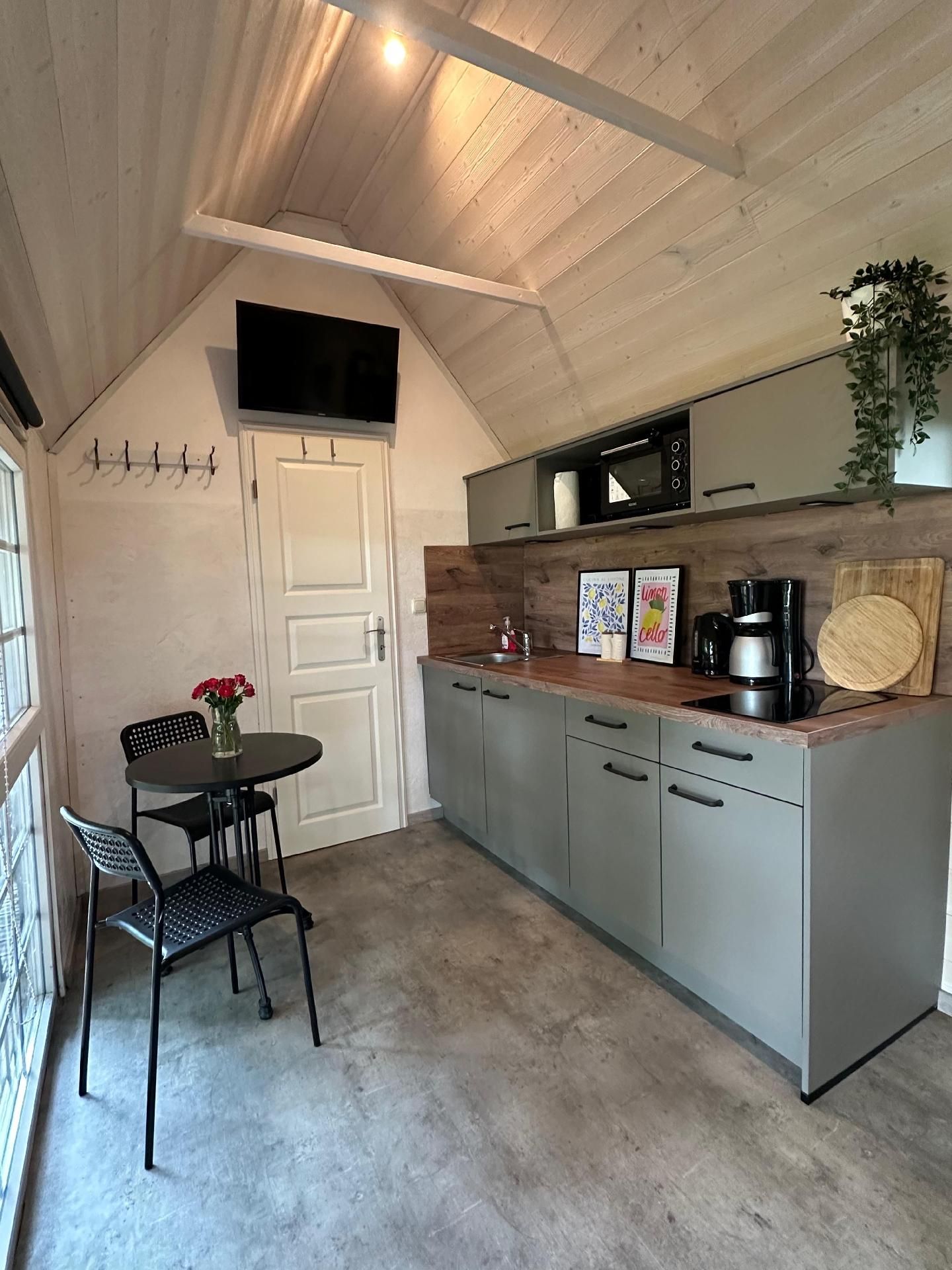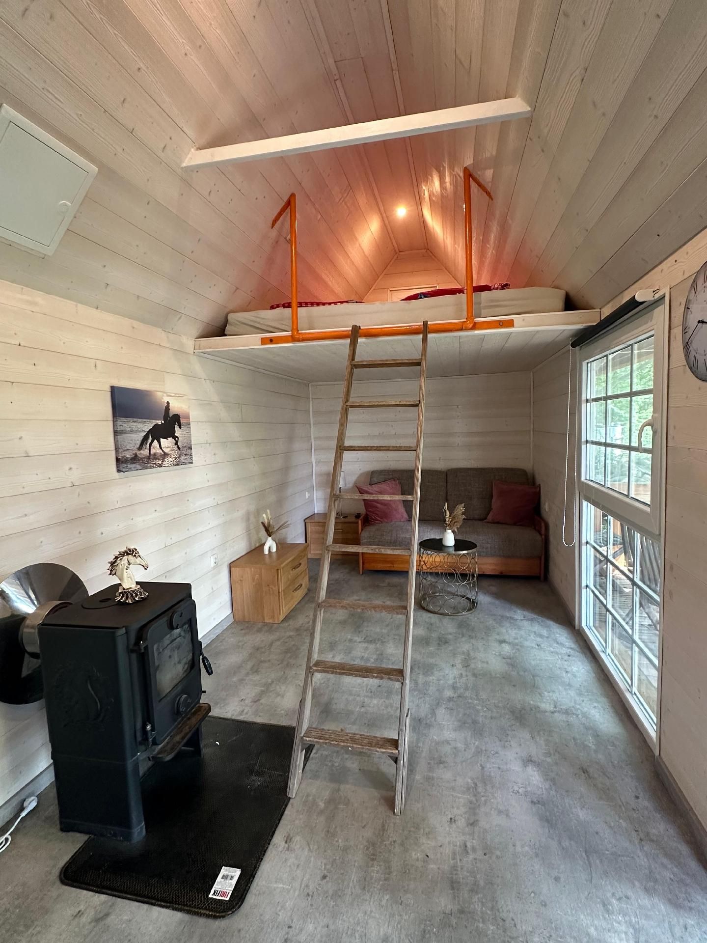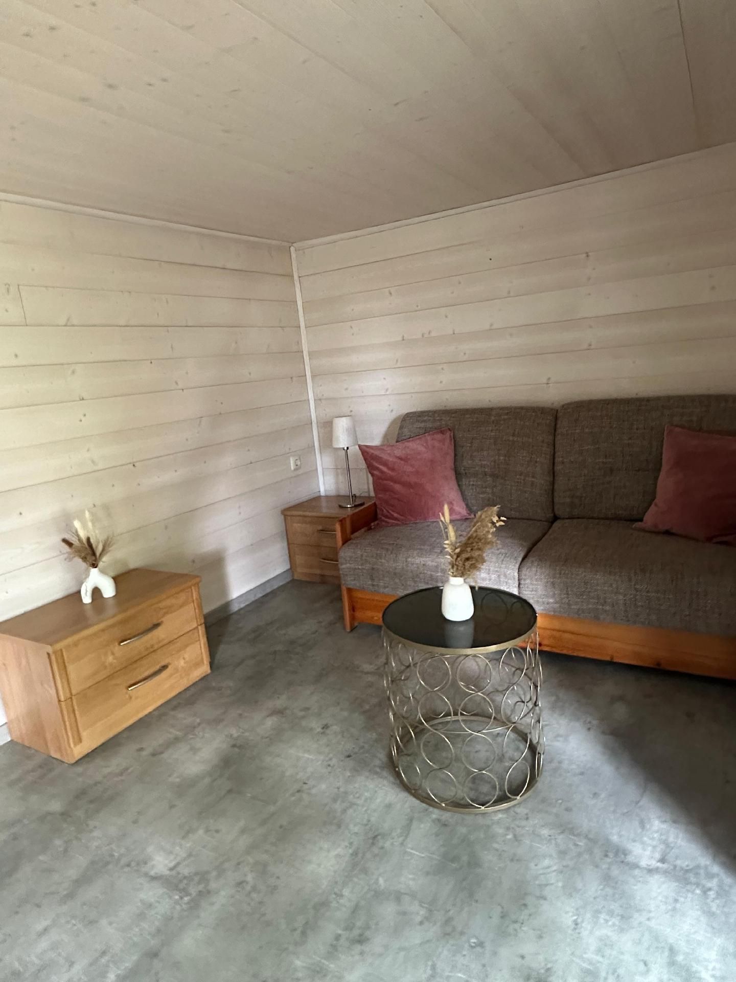 Innerhalb des Mobilheims erwarten Sie praktisch angeordnete Einrichtungselemente und Geräte, die Ihren Aufenthalt angenehm gestalten. Trotz des offenen Studioformats, das ein fabelhaftes Raumgefühl bietet, gibt es hier genügend Komfort und Funktionalität. Zur Ausstattung gehören ein Smart-TV, eine Filter-Kaffeemaschine für Ihren morgendlichen Kaffee, ein Wasserkocher und ein praktischer Minibackofen, ideal für kleine Mahlzeiten. An kühleren Abenden verleiht der gemütliche Kamin dem Raum eine extra Portion Wärme und Gemütlichkeit.