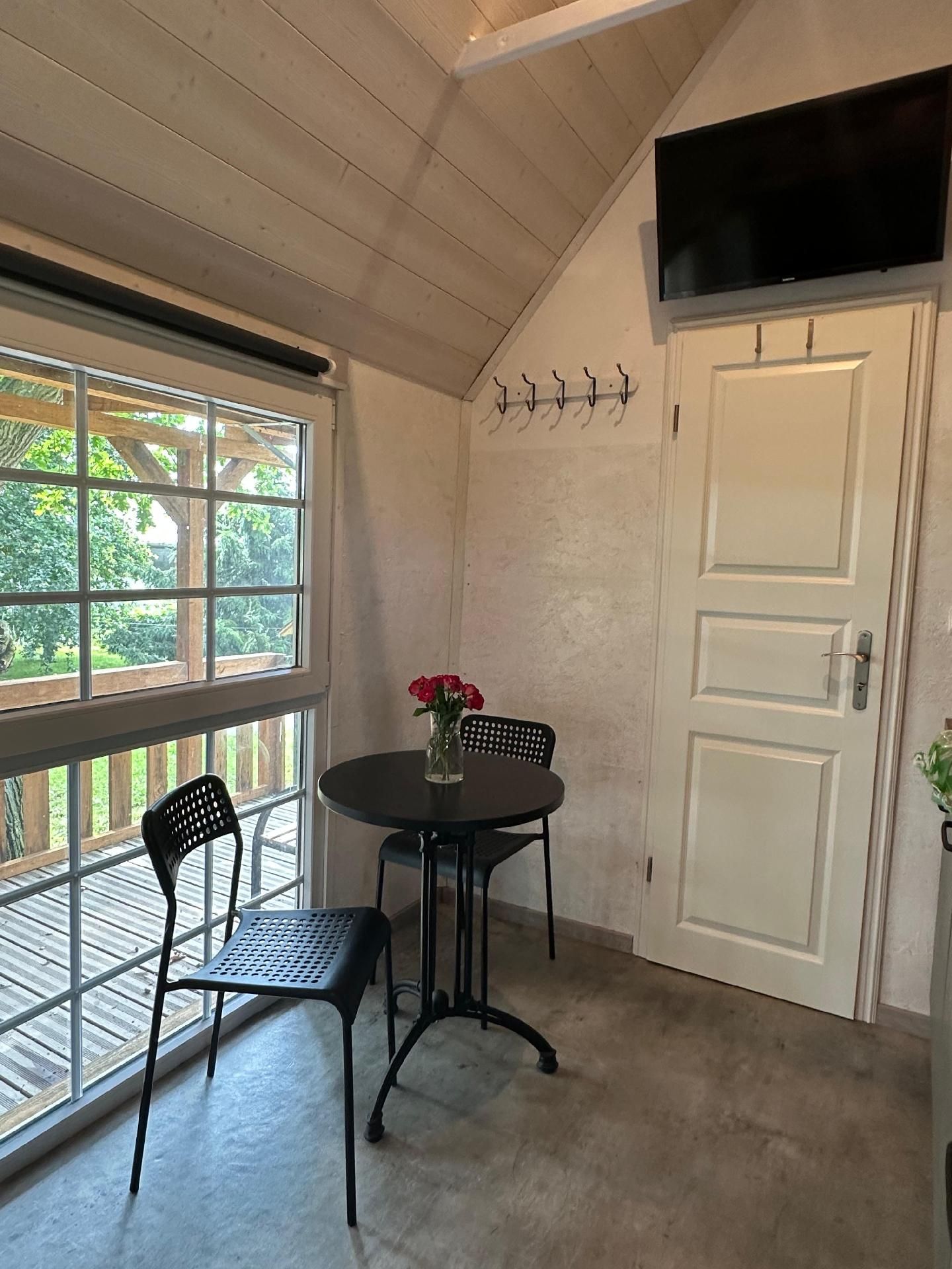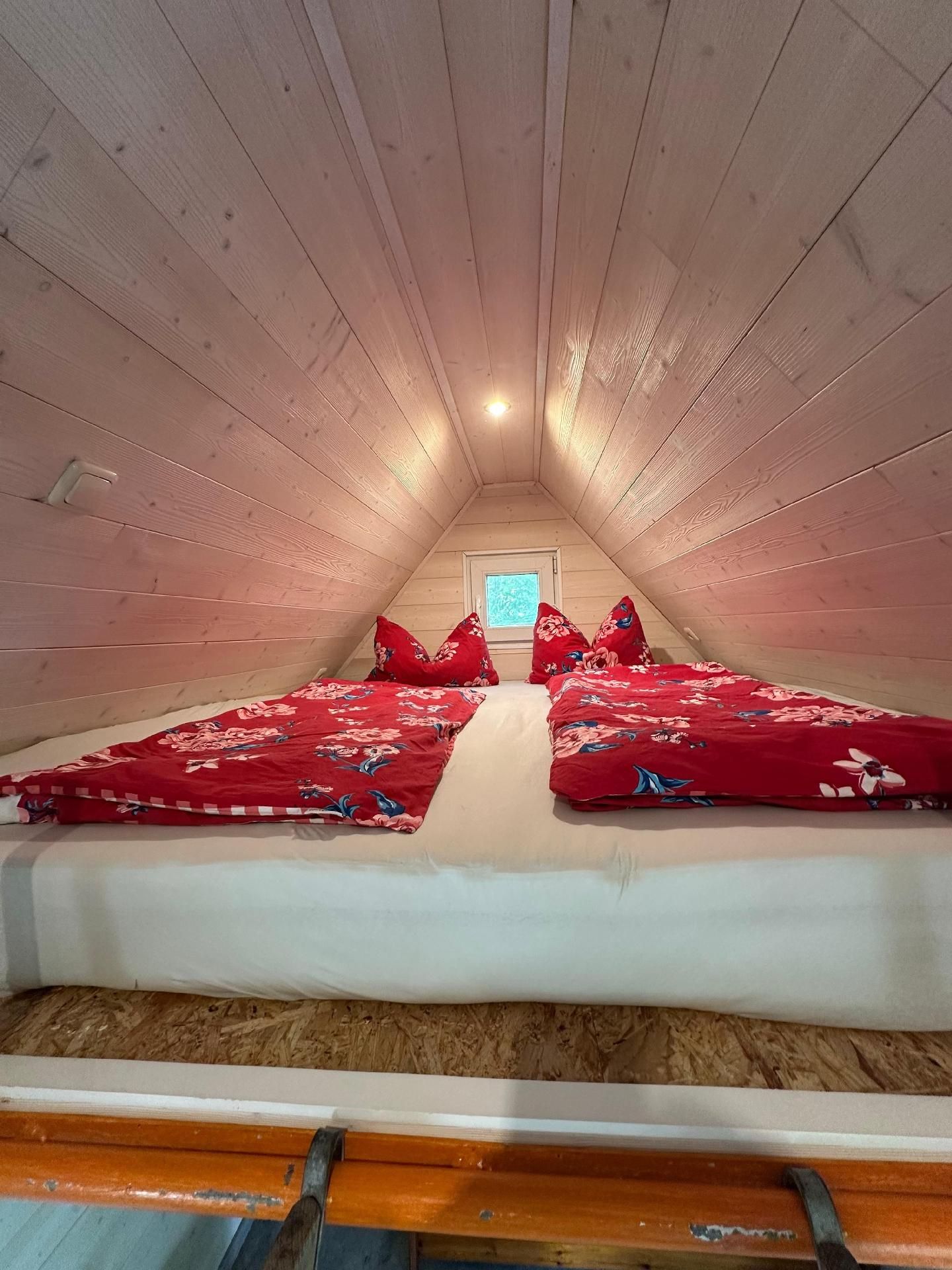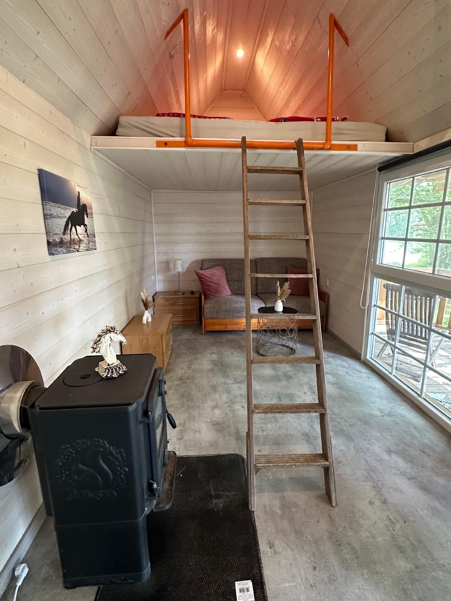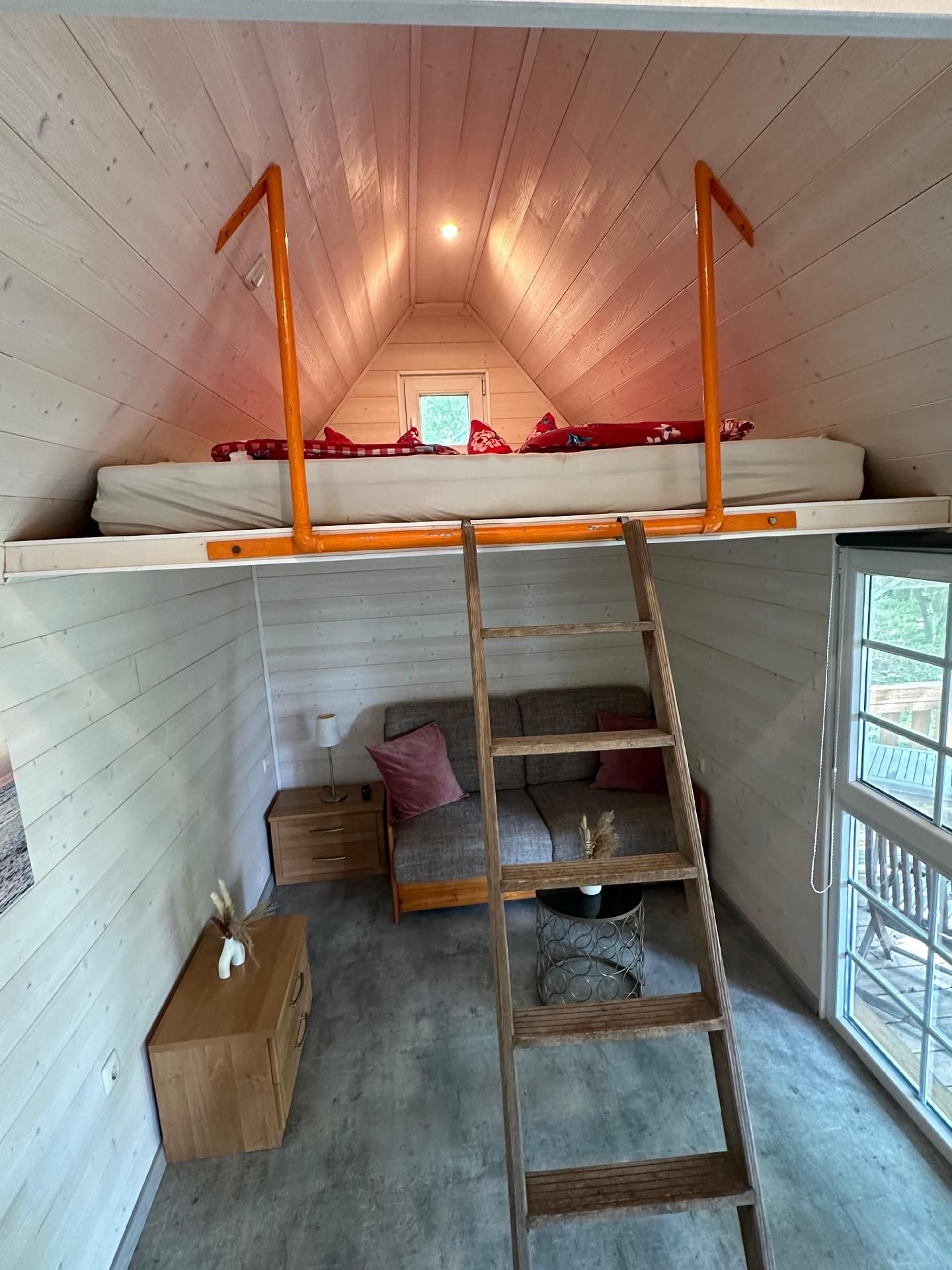 Innerhalb des Mobilheims erwarten Sie praktisch angeordnete Einrichtungselemente und Geräte, die Ihren Aufenthalt angenehm gestalten. Trotz des offenen Studioformats, das ein fabelhaftes Raumgefühl bietet, gibt es hier genügend Komfort und Funktionalität. Zur Ausstattung gehören ein Smart-TV, eine Filter-Kaffeemaschine für Ihren morgendlichen Kaffee, ein Wasserkocher und ein praktischer Minibackofen, ideal für kleine Mahlzeiten. An kühleren Abenden verleiht der gemütliche Kamin dem Raum eine extra Portion Wärme und Gemütlichkeit.
