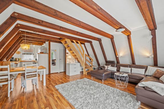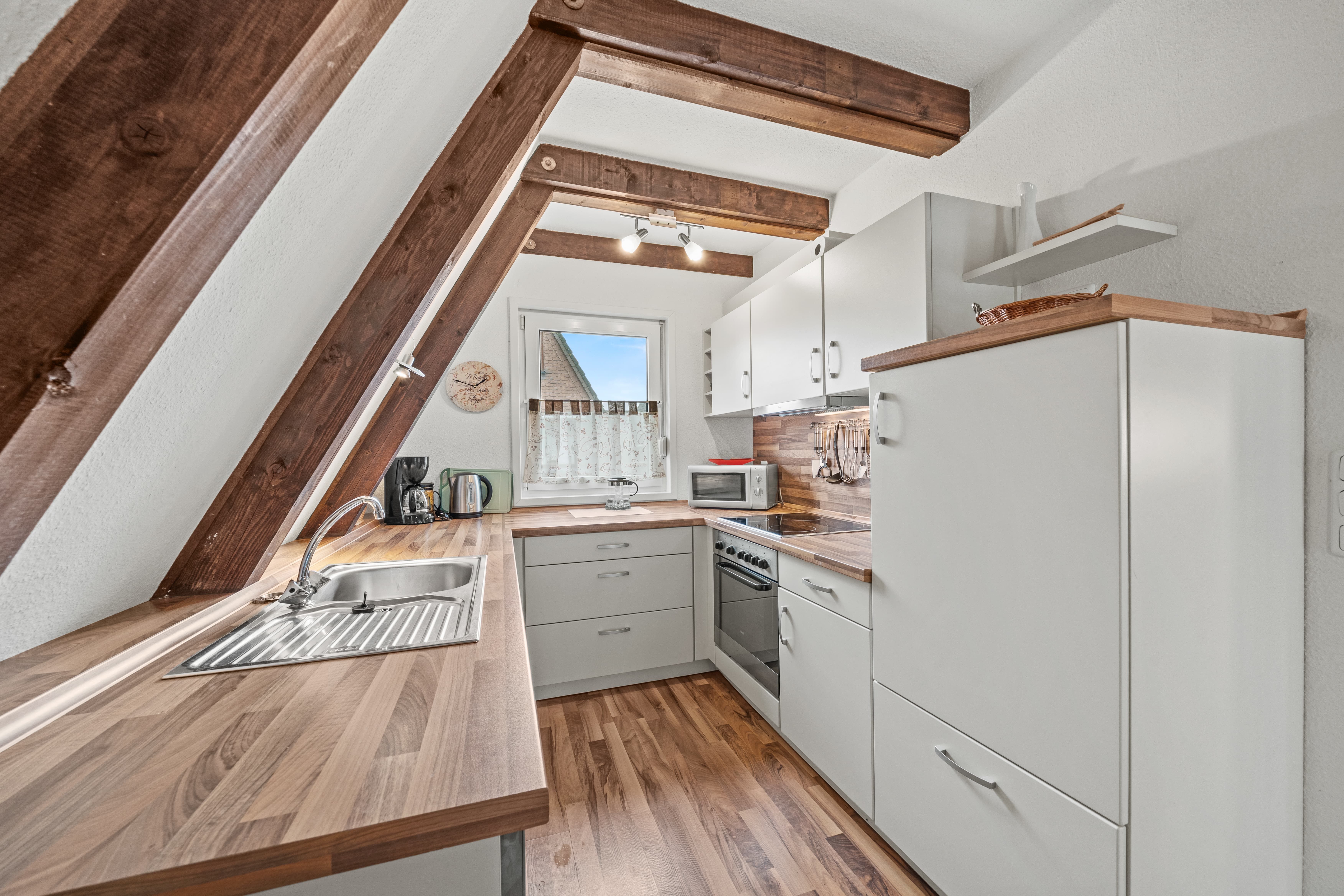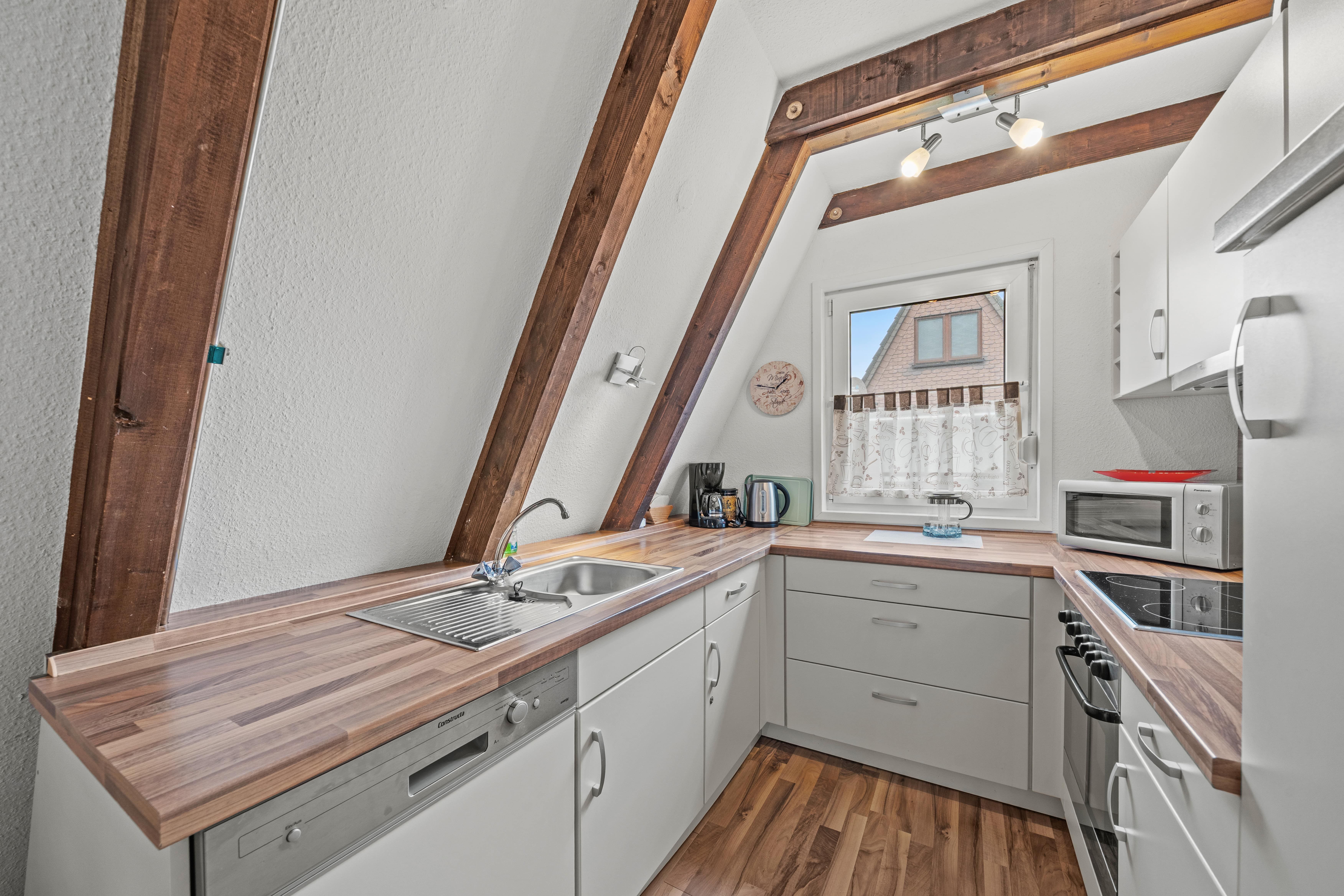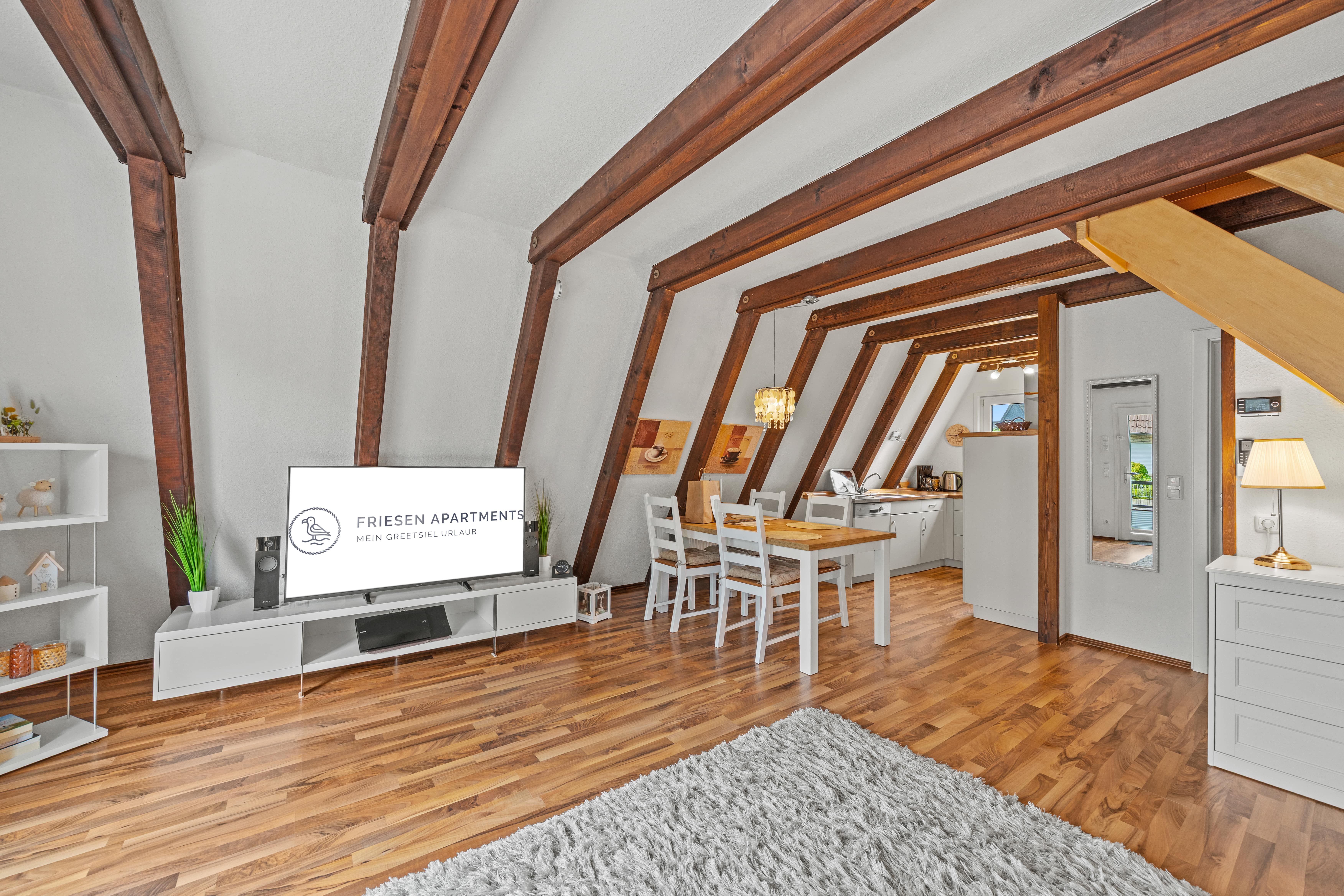 Nur einen Katzensprung vom Deich entfernt, heißt Sie unser Ferienhaus Johanns Huus in Greetsiel herzlich willkommen. Unser charmantes Nurdachhaus im typischen ostfriesischen Stil bietet auf zwei Etagen alles, was Sie für einen entspannten Nordseeurlaub brauchen. Im Erdgeschoss erwartet Sie ein lichtdurchfluteter Wohn- und Essbereich mit Sofalandschaft, Essbereich und einer voll ausgestatteten Küchenzeile. Die freigelegten Holzbalken verleihen dem Haus einen warmen, gemütlichen Charme und schaffen eine behagliche Atmosphäre. Vom Wohnraum aus gelangen Sie direkt auf die Terrasse, die Zugang zum Garten bietet. Außerdem befindet sich im Erdgeschoss das großzügige Tageslichtbad mit Badewanne und Dusche. Im Obergeschoss finden Sie zwei helle Schlafzimmer mit Doppelbetten, die durch die charakteristische Holzdecke ebenfalls eine wohnliches Gefühl bieten. Neben einem reservierten Parkplatz verfügt das Haus ebenfalls über einen Abstellraum im Garten. Dank der guten Lage wohnen Sie hier ruhig aber dennoch nah zum Deich, sodass der Hafen nach einem kurzen Spaziergang schnell erreicht ist.