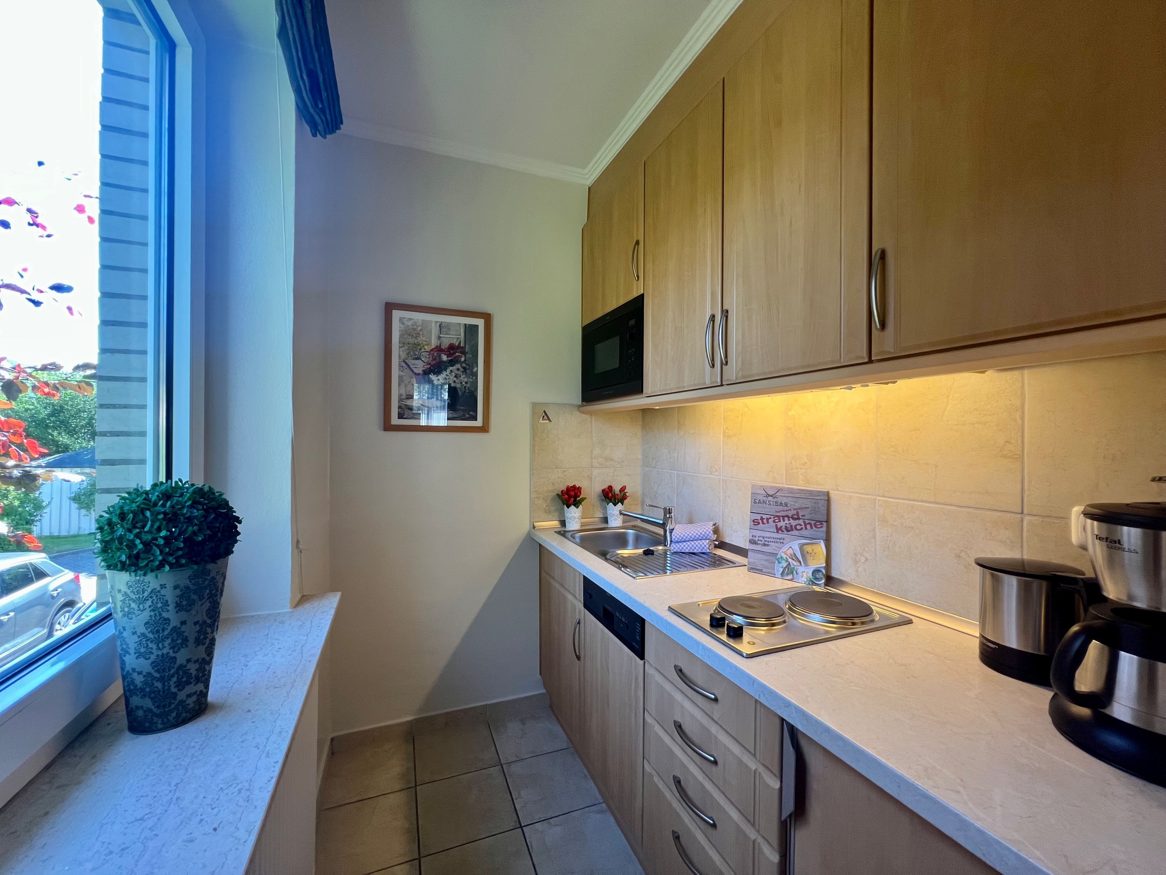 Die separate Küche enthält Herd mit 2 Kochstellen, Mikrowelle, Kühlschrank und Geschirrspüler. Sie ist komplett bestückt mit Geschirr, Bestecken, Töpfen, etc.
