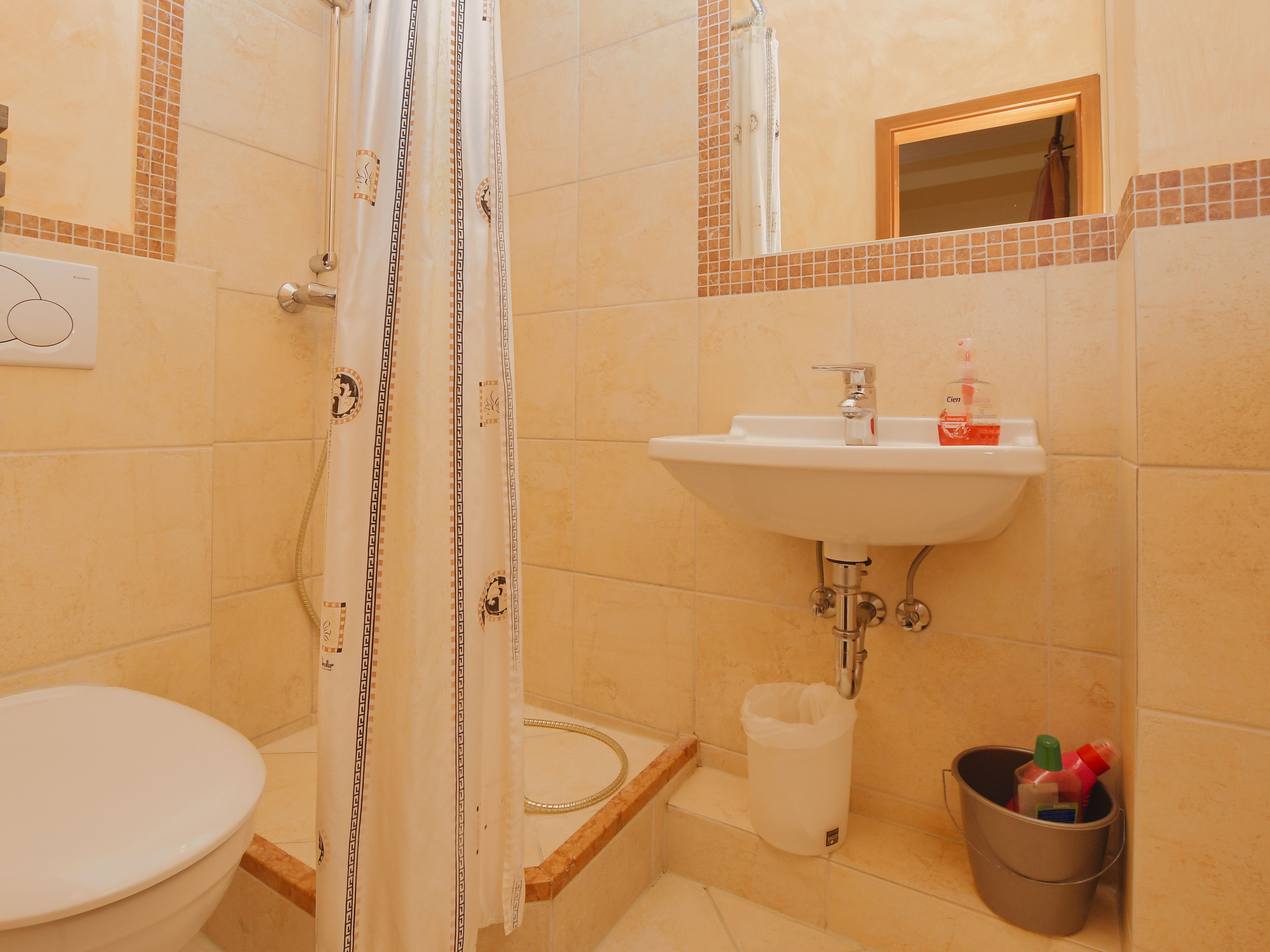 Dusche, WC, Waschtisch mit Spiegel, Ablageflächen, Handtuchtrockner und Radio.