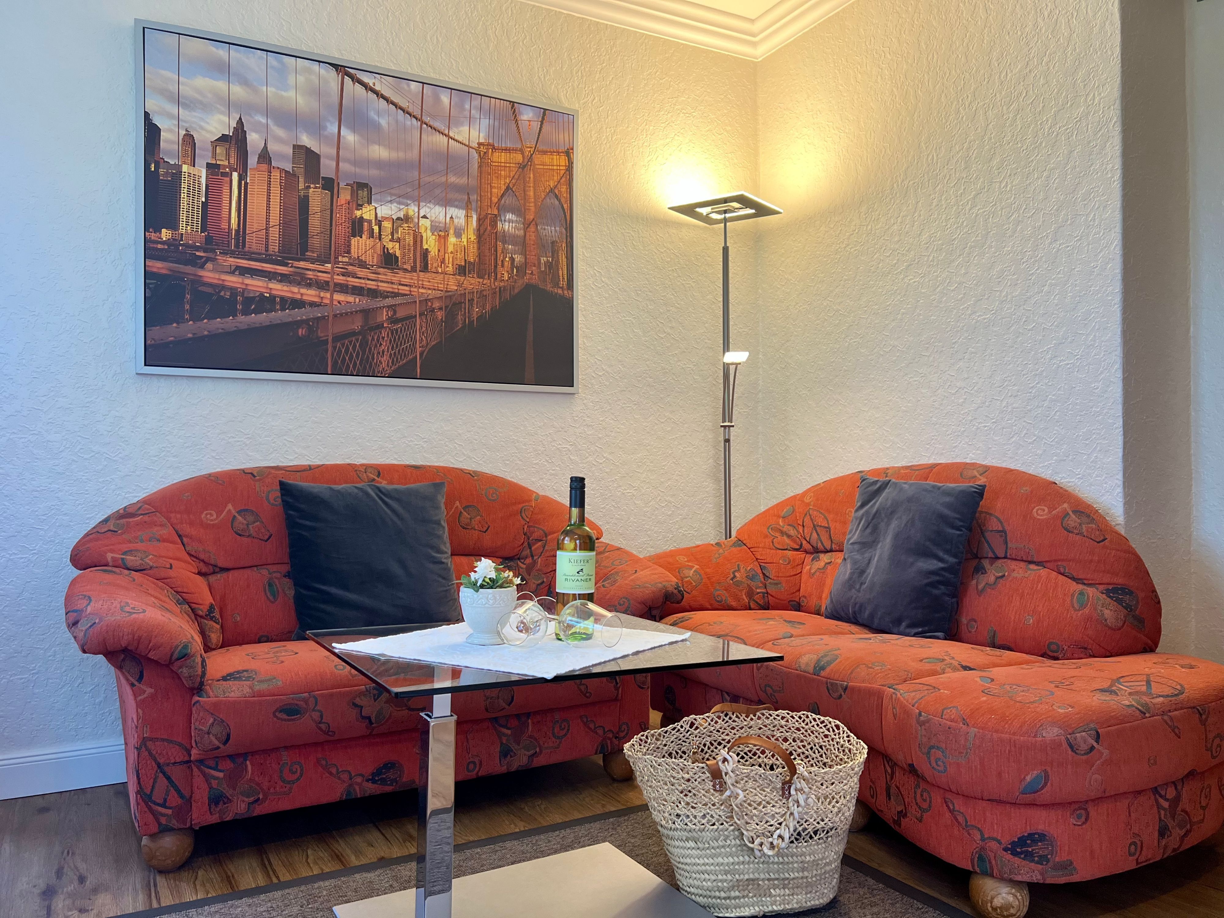 Der Schlafbereich mit Doppelbett kann mit Vorhang vom Wohnbereich abgetrennt werden. Großer Kleiderschrank mit Ganzkörperspiegel. Wohnbereich mit Sitzgruppe aus Couch und Ottomane, Eßplatz am Fenster.