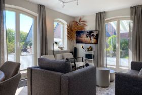 Wohnung 3 (Erdgeschoss): Eine geräumige 3-Zimmer-Wohnung für bis zu 4 Personen, die zusätzlich über eine eigene Terrasse verfügt.