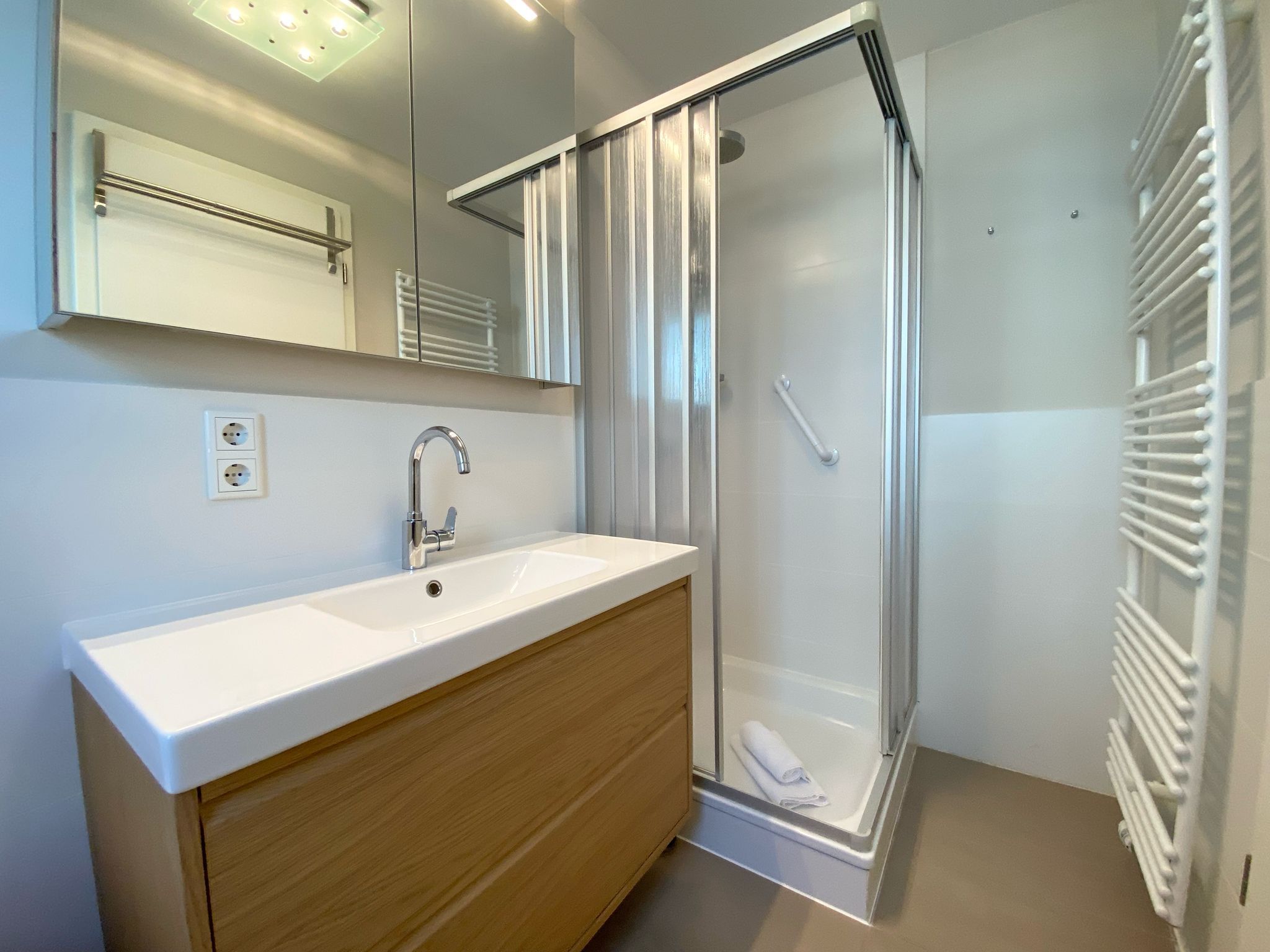 Ein weiteres, großzügigeres Bad im Untergeschoss mit Dusche, separater Badewanne und Föhn.