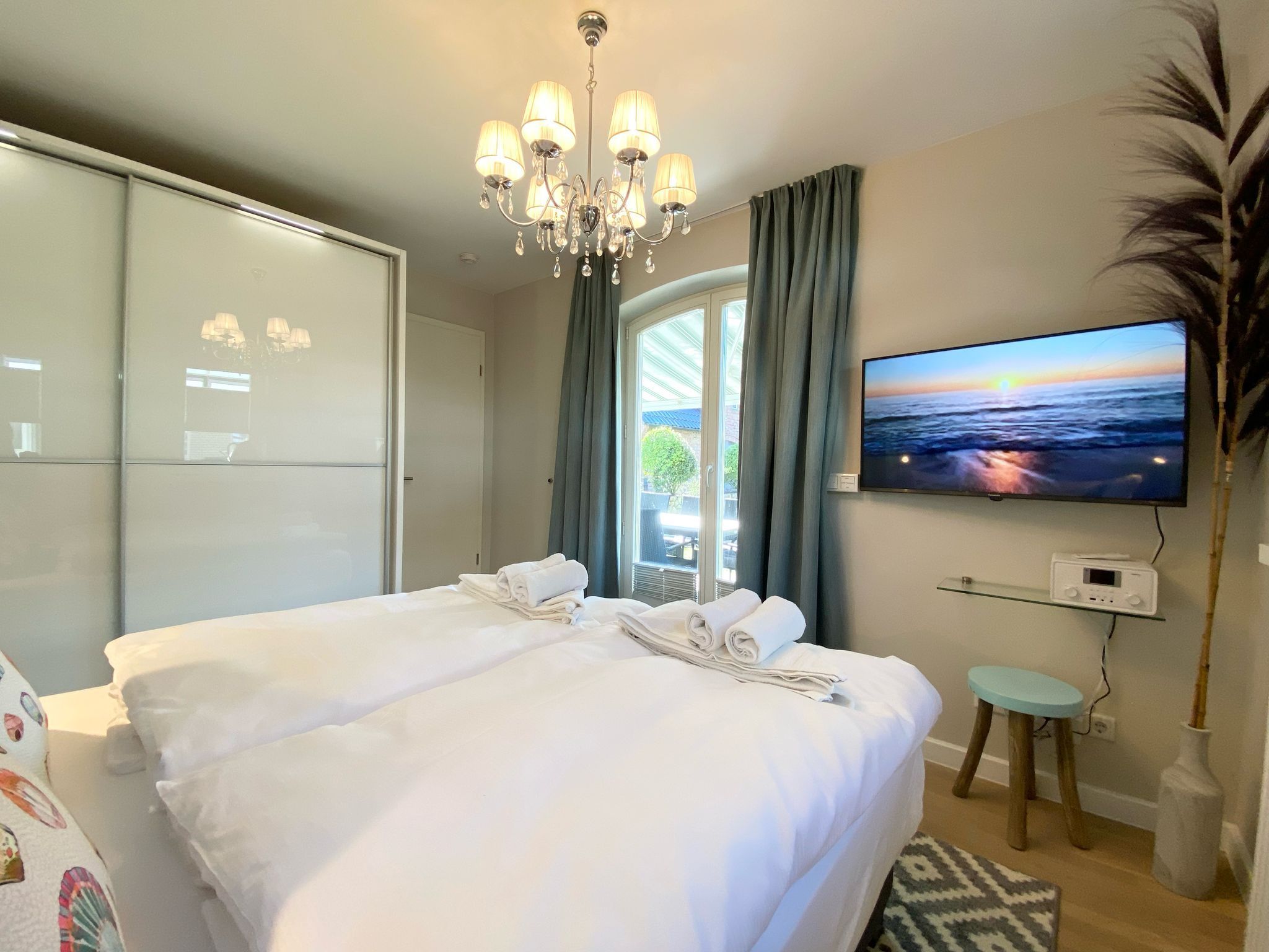 Ein Schlafzimmer im Erdgeschoss mit einem Boxspringbett (160x200 cm), TV und Digital-Radio/Bluetooth.