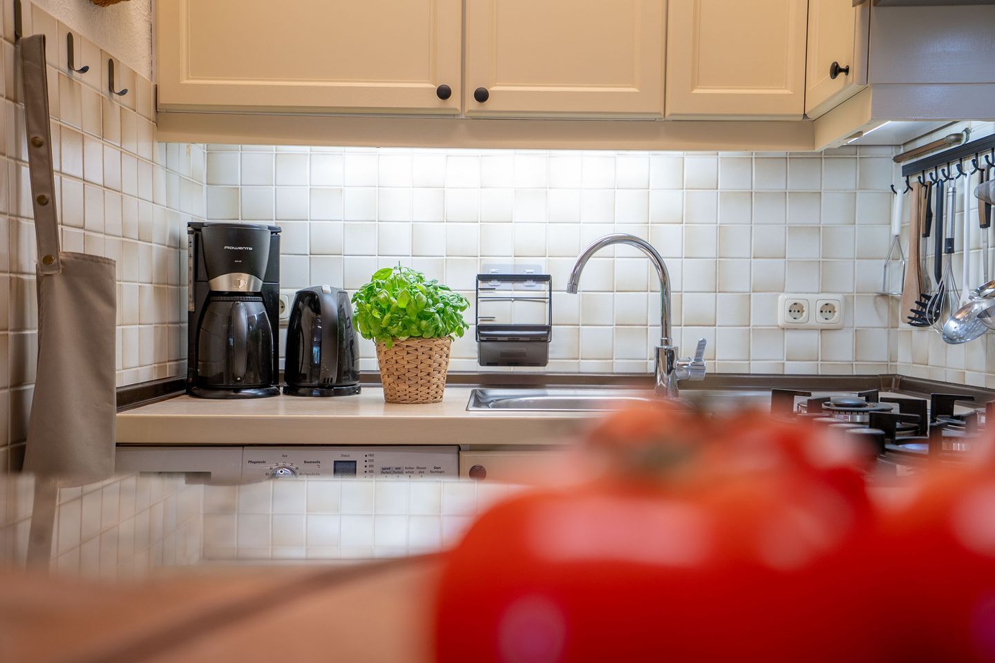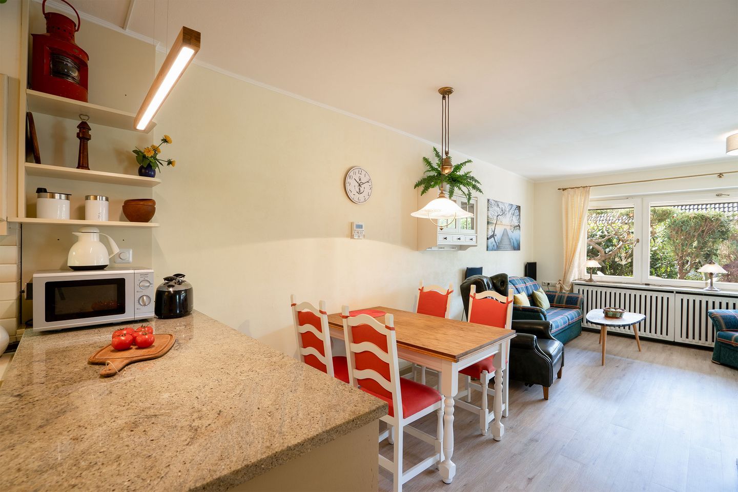 Die gut ausgestattete Küche verfügt über einen Gasherd, Elektrobackofen, Mikrowelle, Kühlschrank mit Gefrierfach sowie Kaffeemaschine, Toaster und Wasserkocher, Waschmaschine. Das Badezimmer bietet eine bodengleiche Dusche und einen Haartrockner. Entspannen Sie auf der Terrasse mit Gartenmöbeln und genießen Sie die frische Luft. Haustiere bzw. Hunde sind nicht erlaubt, PKW Stellplatz vorhanden.