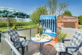 Die großzügige Außenlage ist zum Spielen, z.B. Tischtennis oder Toben auf der Wiese oder zum Ausruhen und Sonnenliegen eingerichtet.