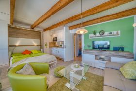 Die gemütliche Wohn-Schlafraum-Kombination mit Zugang zum Balkon mit Meerblick lädt zum Entspannen ein. Im modernen Badezimmer mit Duschkabine, WC und Waschbecken starten Sie erfrischt in den Tag. Die voll ausgestattete Küche verfügt über einen Geschirrspüler, einen Herd und eine Mikrowelle perfekt für die Selbstverpflegung.