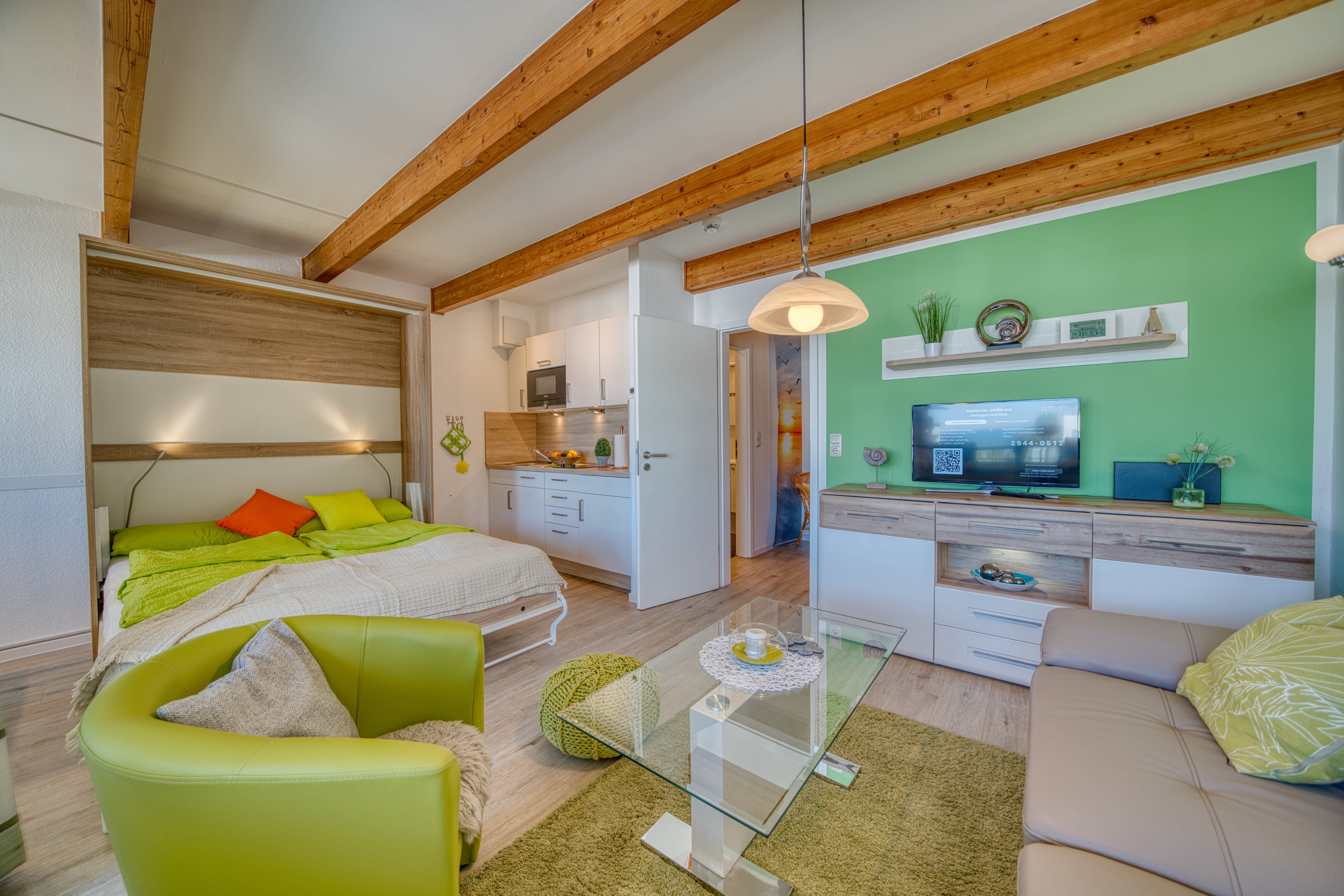 Die gemütliche Wohn-Schlafraum-Kombination mit Zugang zum Balkon mit Meerblick lädt zum Entspannen ein. Im modernen Badezimmer mit Duschkabine, WC und Waschbecken starten Sie erfrischt in den Tag. Die voll ausgestattete Küche verfügt über einen Geschirrspüler, einen Herd und eine Mikrowelle – perfekt für die Selbstverpflegung.