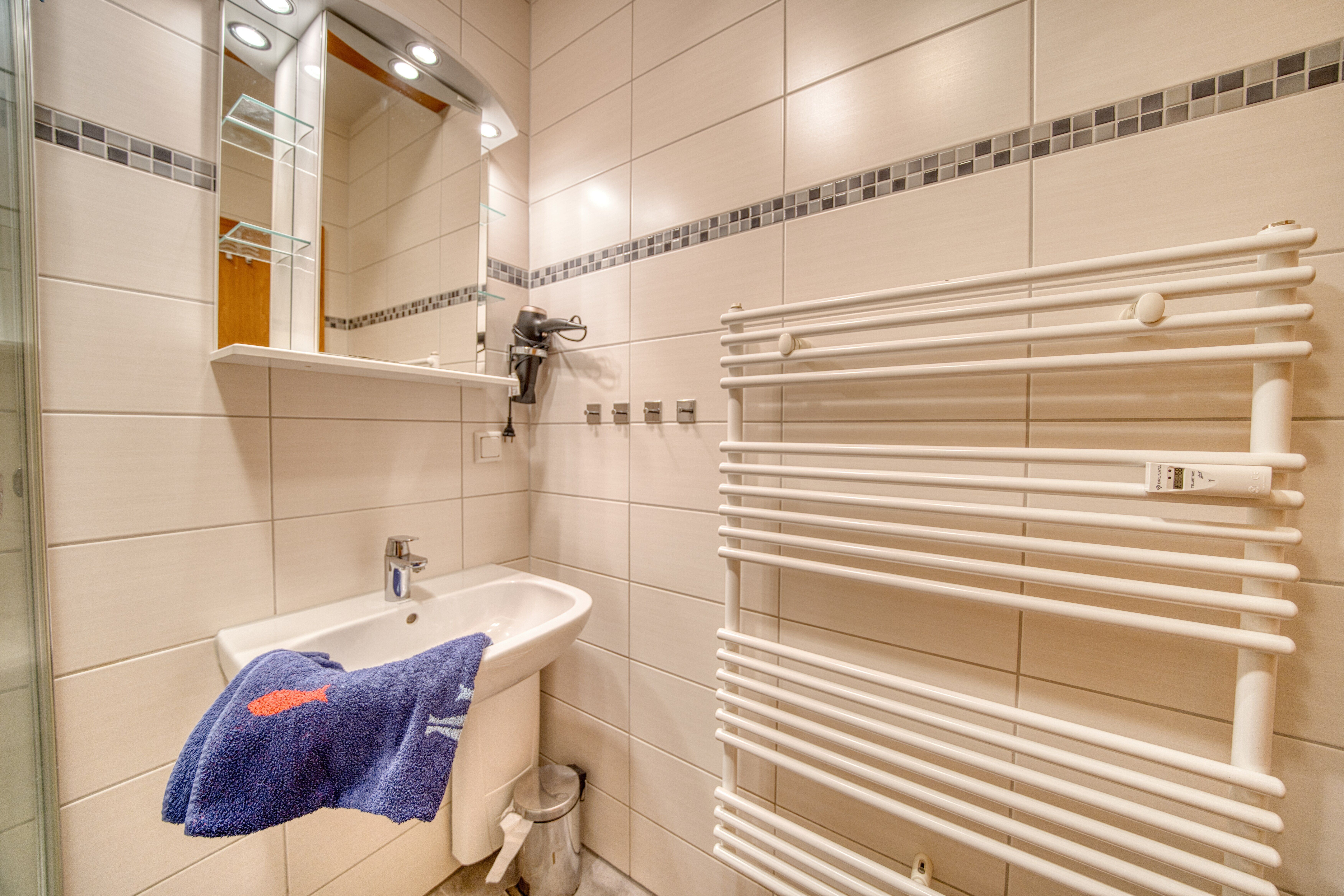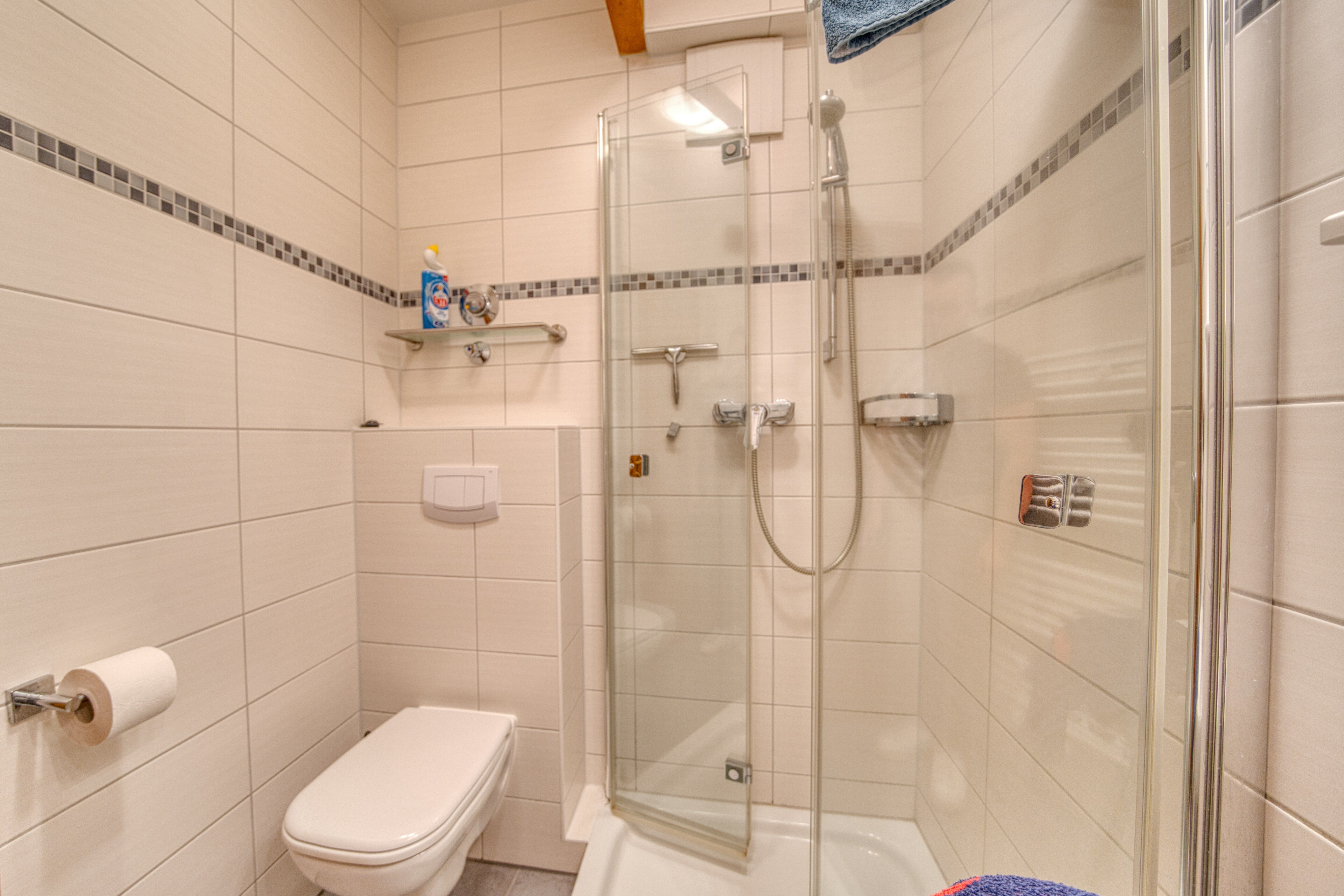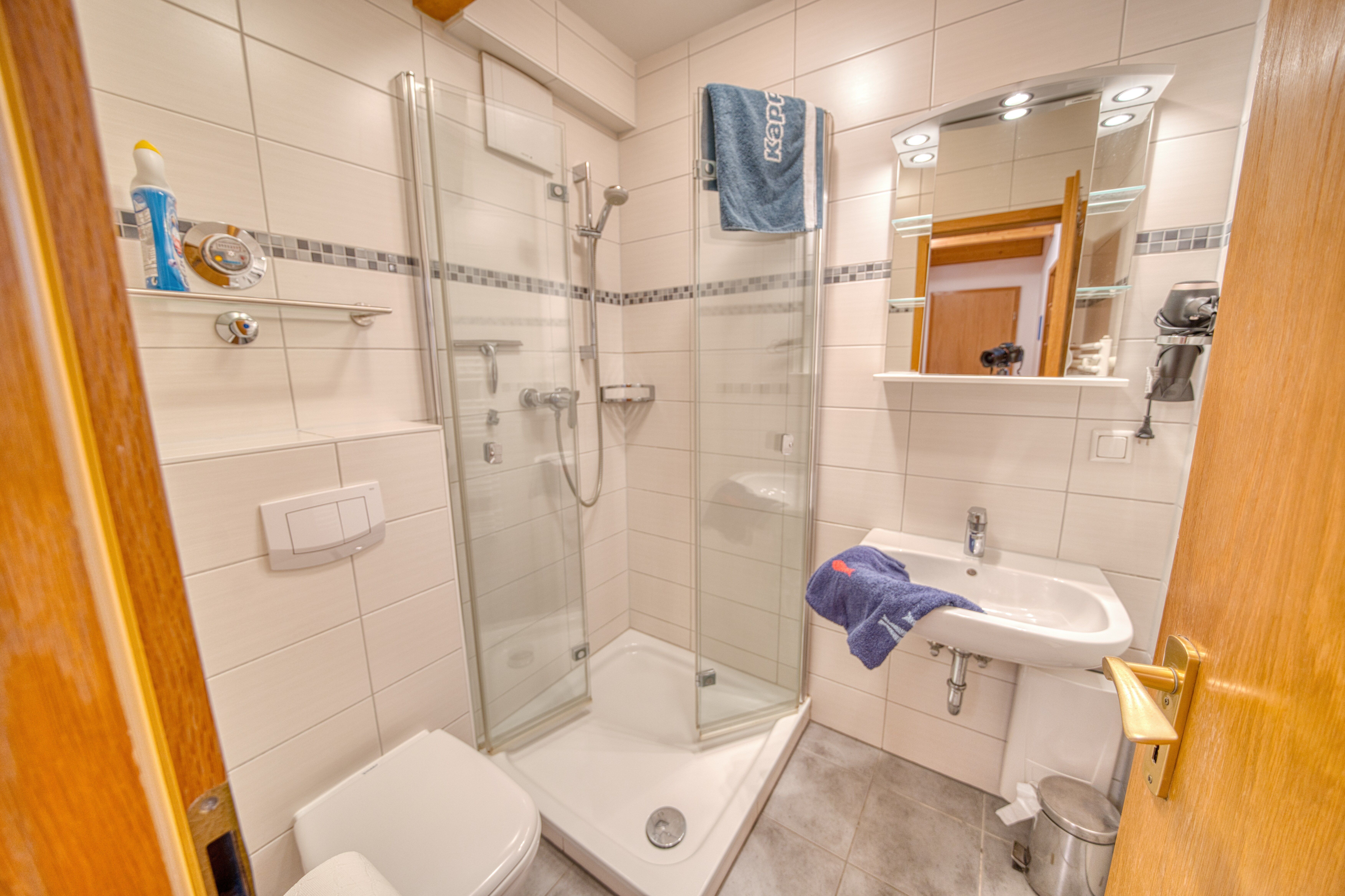 Badezimmer mit Duschkabine, WC und Waschbecken