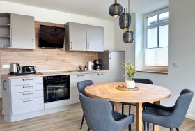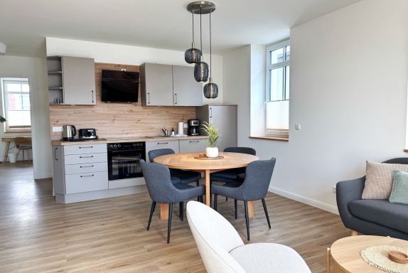 Die ca. 56 m² große Ferienwohnung Hafenmeister Ole liegt im Erdgeschoss eines modernen Neubaus (Baujahr 2025) mit insgesamt fünf Ferienwohnungen. Die helle, freundlich eingerichtete Wohnung verfügt über ein separates Schlafzimmer, ein gemütliches Wohnzimmer mit integrierter, voll ausgestatteter Küchenzeile (inkl. Geschirrspüler, Kühlschrank und Essbereich) sowie ein modernes Bad mit ebenerdiger Dusche.