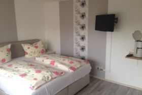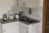 Wohnzimmer mit Doppelbett, Flachbildfernseher, Miniküche mit Kühlschrank, Kaffeemaschine, Wasserkocher, Toaster,
