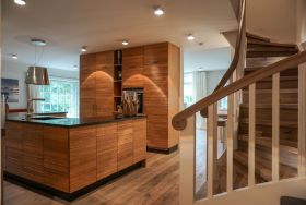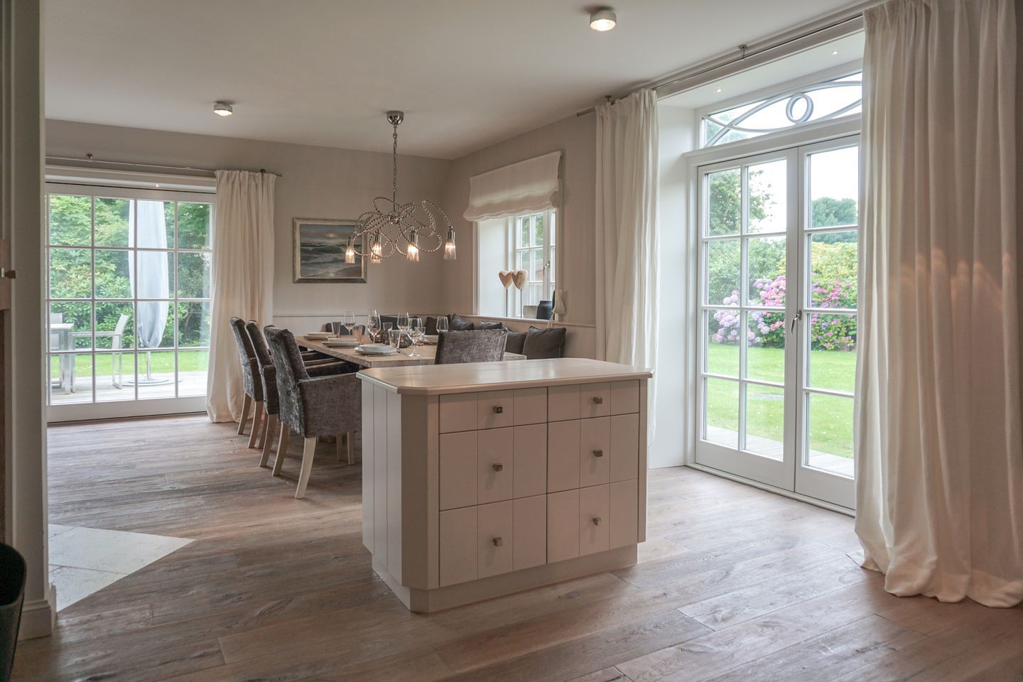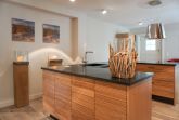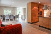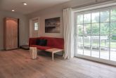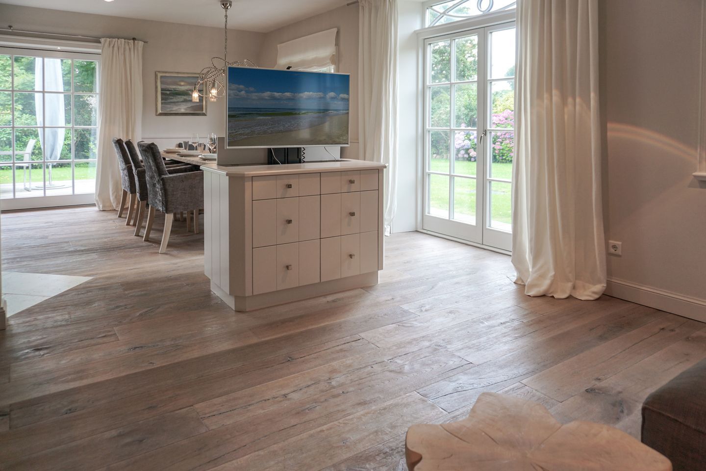 Im Inneren des Hauses verteilen sich fünf Zimmer über drei Etagen. Insgesamt stehen Ihnen vier Schlafzimmer zur Verfügung, davon zwei im Untergeschoss und zwei in der oberen Etage. 3 der vier Schlafzimmer haben das Bad en suite. Alle Schlafzimmer sind mit Dielenboden ausgestattet, der ebenso wie der Fußboden im Wohnzimmer eine warme und einladende Atmosphäre schafft. Die Wohnräume sind großzügig gestaltet und zeichnen sich durch eine hochwertige Möblierung aus. Eine gemütliche, große Sofaecke und ein moderner Kaminofen im Wohnzimmer sorgen auch an kühleren Tagen für Behaglichkeit. Fünf digitale Fernseher ermöglichen Ihnen individuelle Unterhaltung in verschiedenen Räumen.