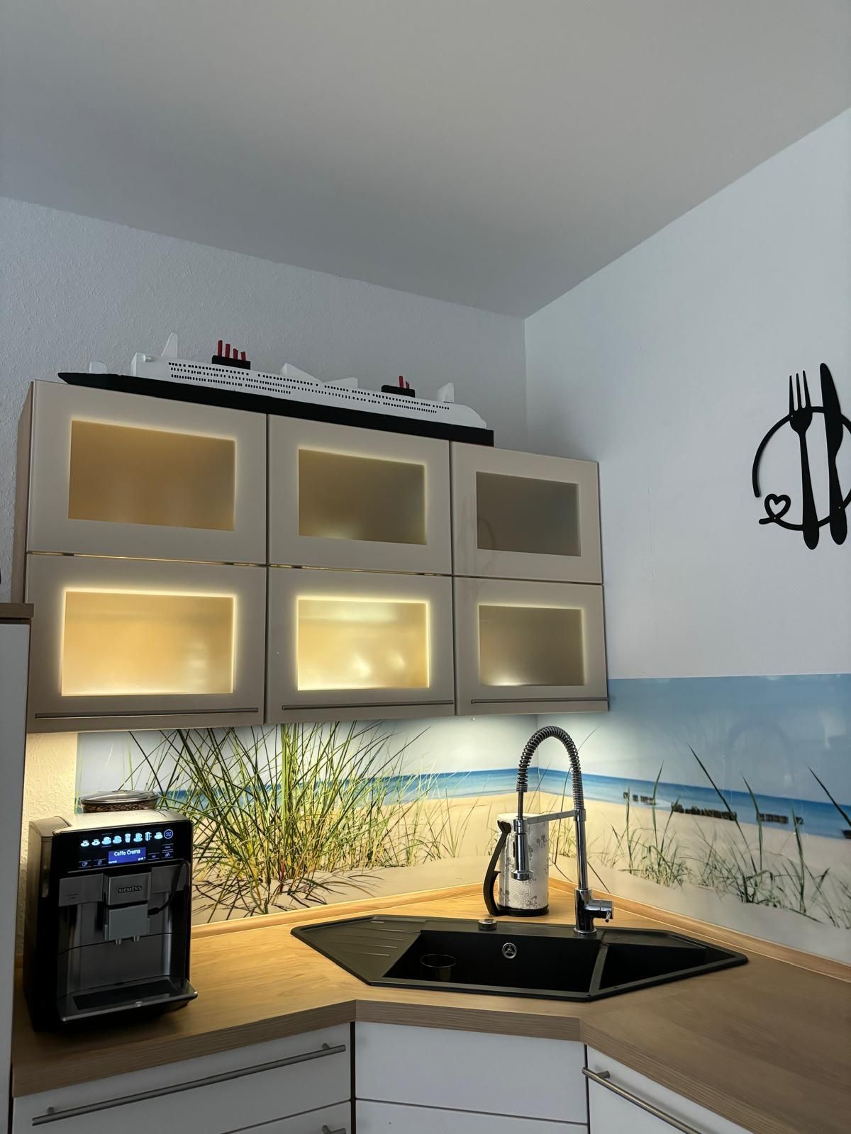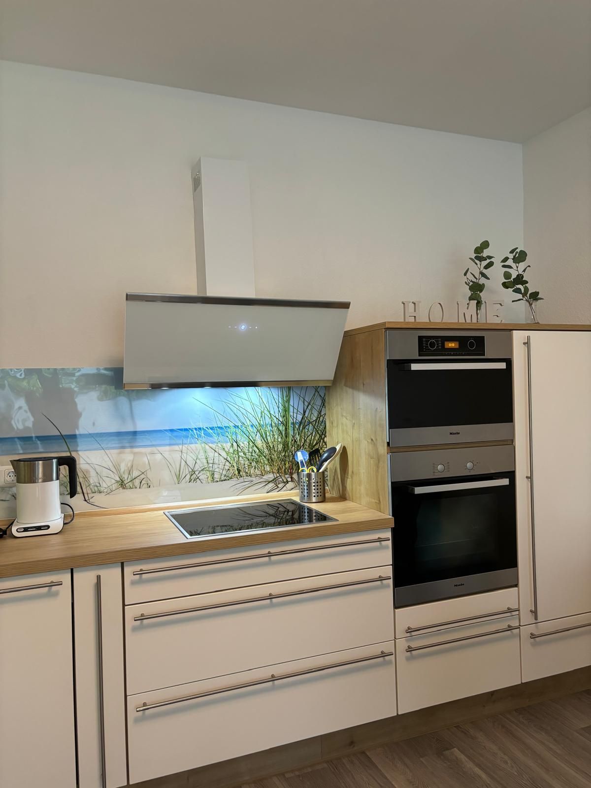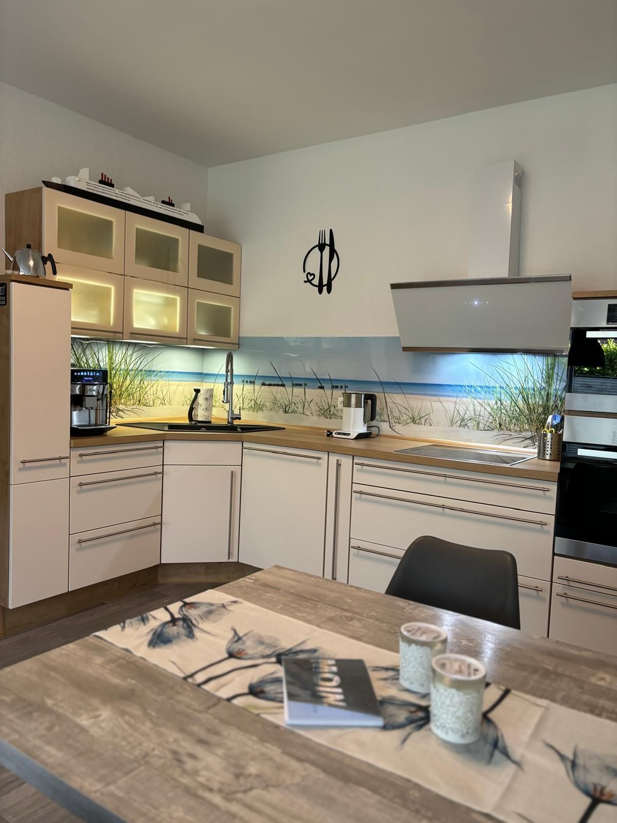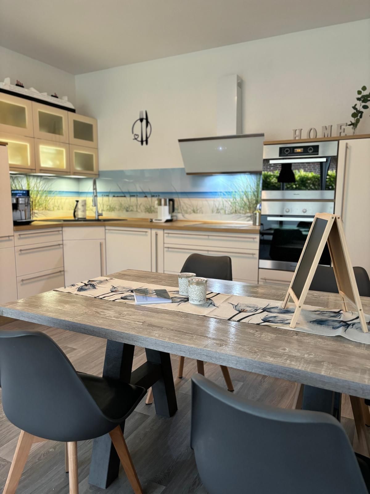 Vollausgestattete Wohnküche mit Kaffeevollautomat, Spülmaschine, Mikrowelle und Dampfgarer für eine gesunde Ernährung auch im Urlaub.