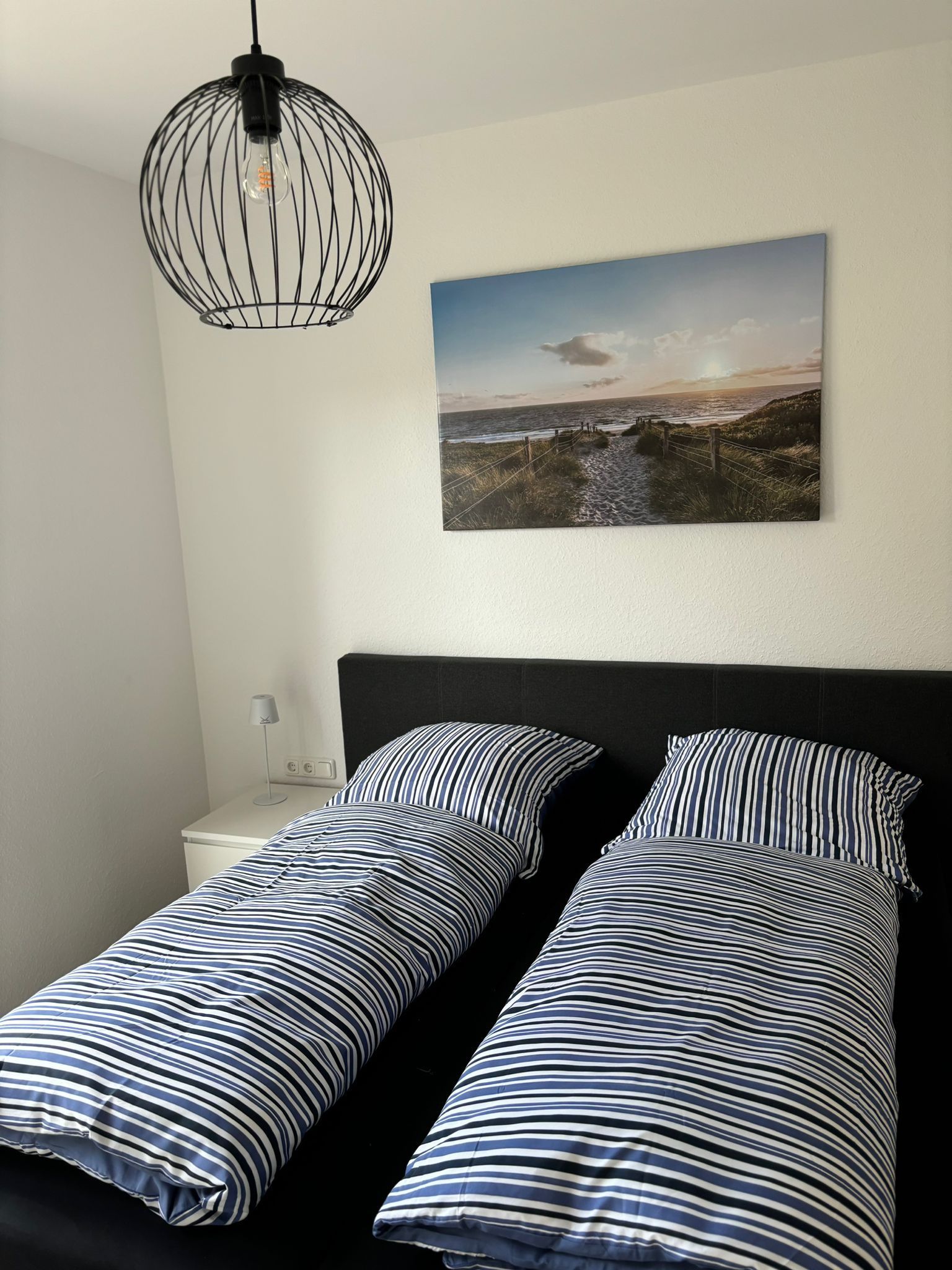 Das Schlafzimmer ist mit einem Boxspringbett mit dem Maßen 180 x 200 mtr. ausgestattet. Hier gibt es bodentiefe Fenster, die mit elektrischen Jalousien verdunkelt werden können.