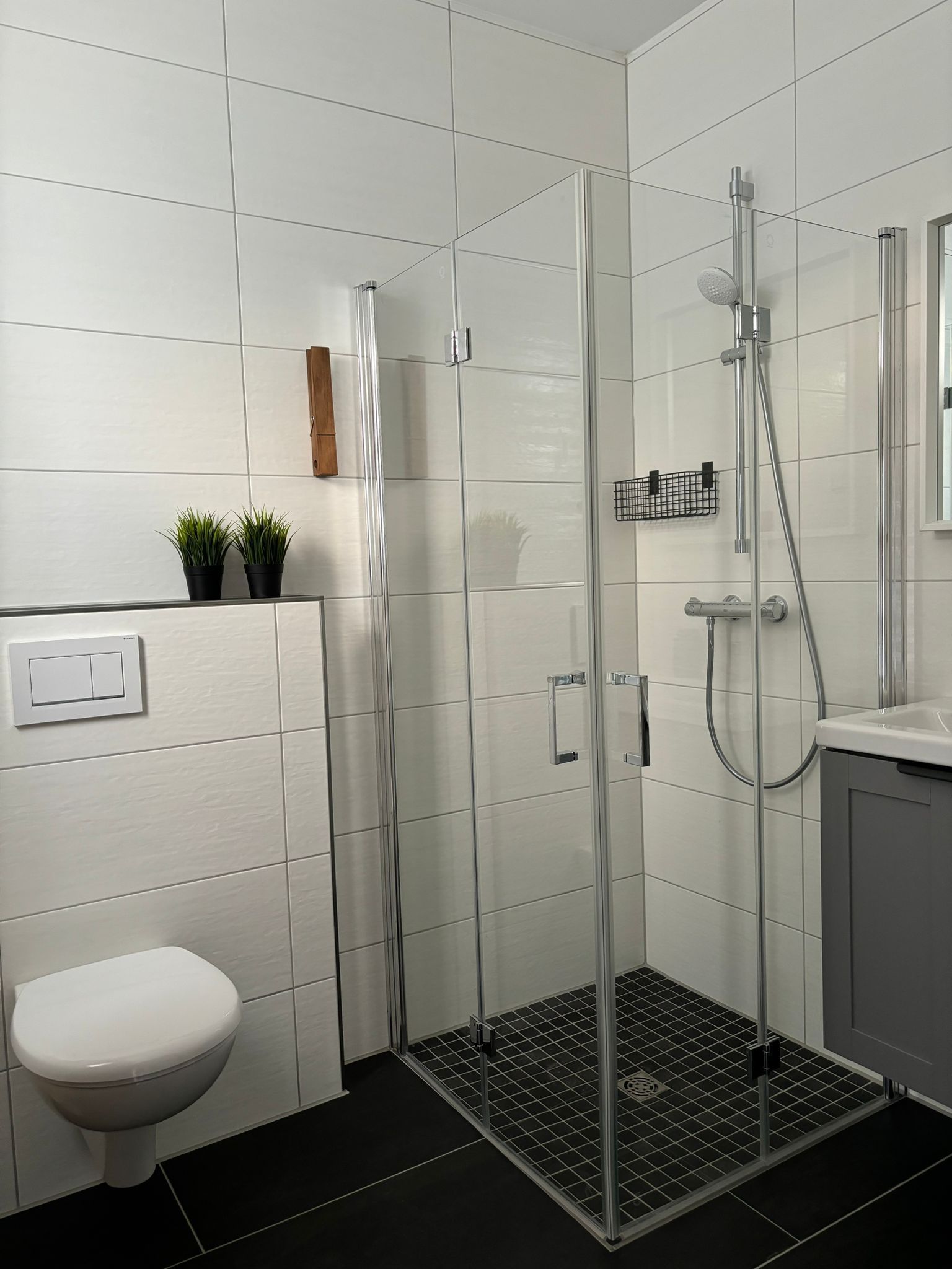 Im Bad ist eine ebenerdige Dusche, ein WC und ein Waschbecken vorhanden.