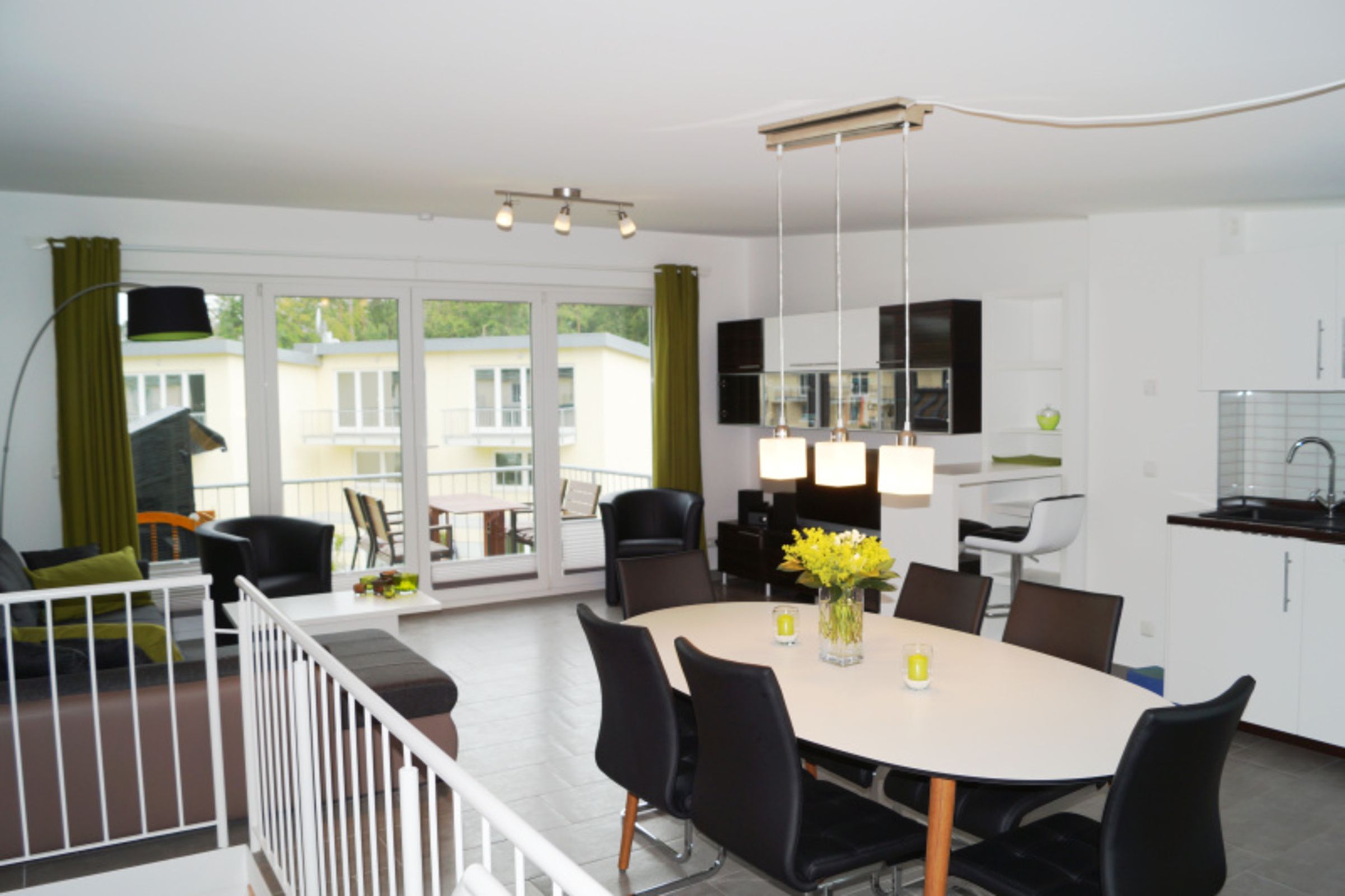 Zu Ihrer Wohnung gehören außerdem ein Balkon mit Balkonmöbeln und einem Strandkorb sowie einem PKW-Parkplatz und einer Fahrradbox.