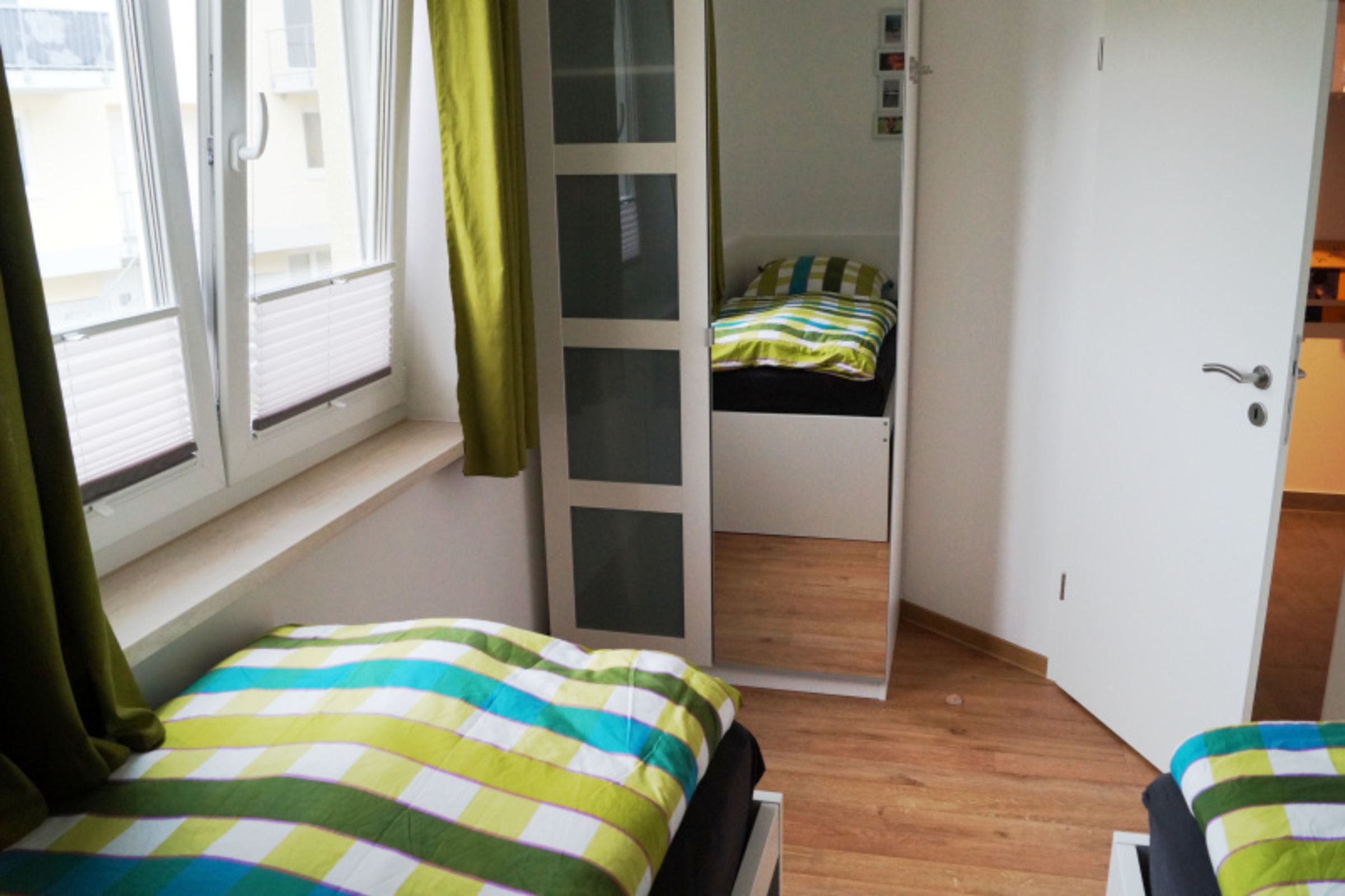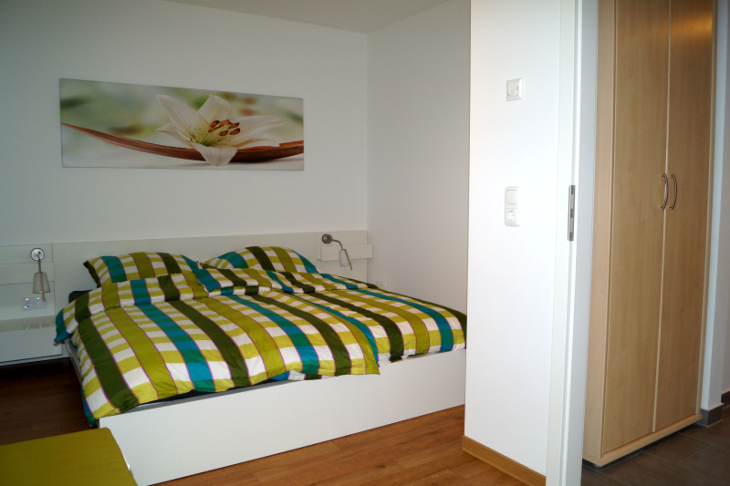 Das Schlafzimmer verfügt über ein Doppelbett und einen Kleiderschrank. In einem weiteren Zimmer stehen 2 Einzelbetten und ein Kleiderschrank.