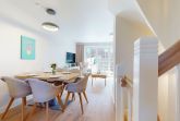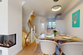Im Erdgeschoss empfängt Sie ein heller Wohn- und Essbereich mit bodentiefen Fenstern, gemütlicher Sofaecke und Gaskamin – ideal für entspannte Stunden. Die offene Küche ist modern ausgestattet mit Induktionsherd, Geschirrspüler, Nespresso-Maschine und einer Backofen-/Mikrowellenkombination. Von hier gelangen Sie direkt auf die sonnige Terrasse mit Gartenmöbeln und eigenem Strandkorb (April bis Oktober) – perfekt für Frühstück an der frischen Luft oder erholsame Nachmittage. Ein Gäste-WC rundet diese Ebene ab.