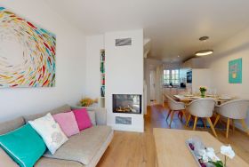 Im Untergeschoss erwartet Sie ein Schlafzimmer mit Doppelbett und Flatscreen-TV sowie Ihre private Sauna und ein modernes Duschbad. Im Obergeschoss befindet sich ein weiteres Doppelzimmer mit Flatscreen-TV und ein stilvolles Badezimmer mit freistehender Badewanne, Dusche und WC. Das Dachgeschoss bietet eine liebevoll gestaltete Nische mit kleinem Doppelbett, Flatscreen-TV und Schreibtisch – ein gemütlicher Rückzugsort für Kinder oder Gäste.