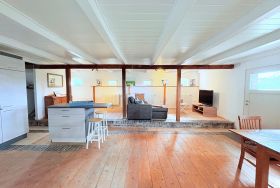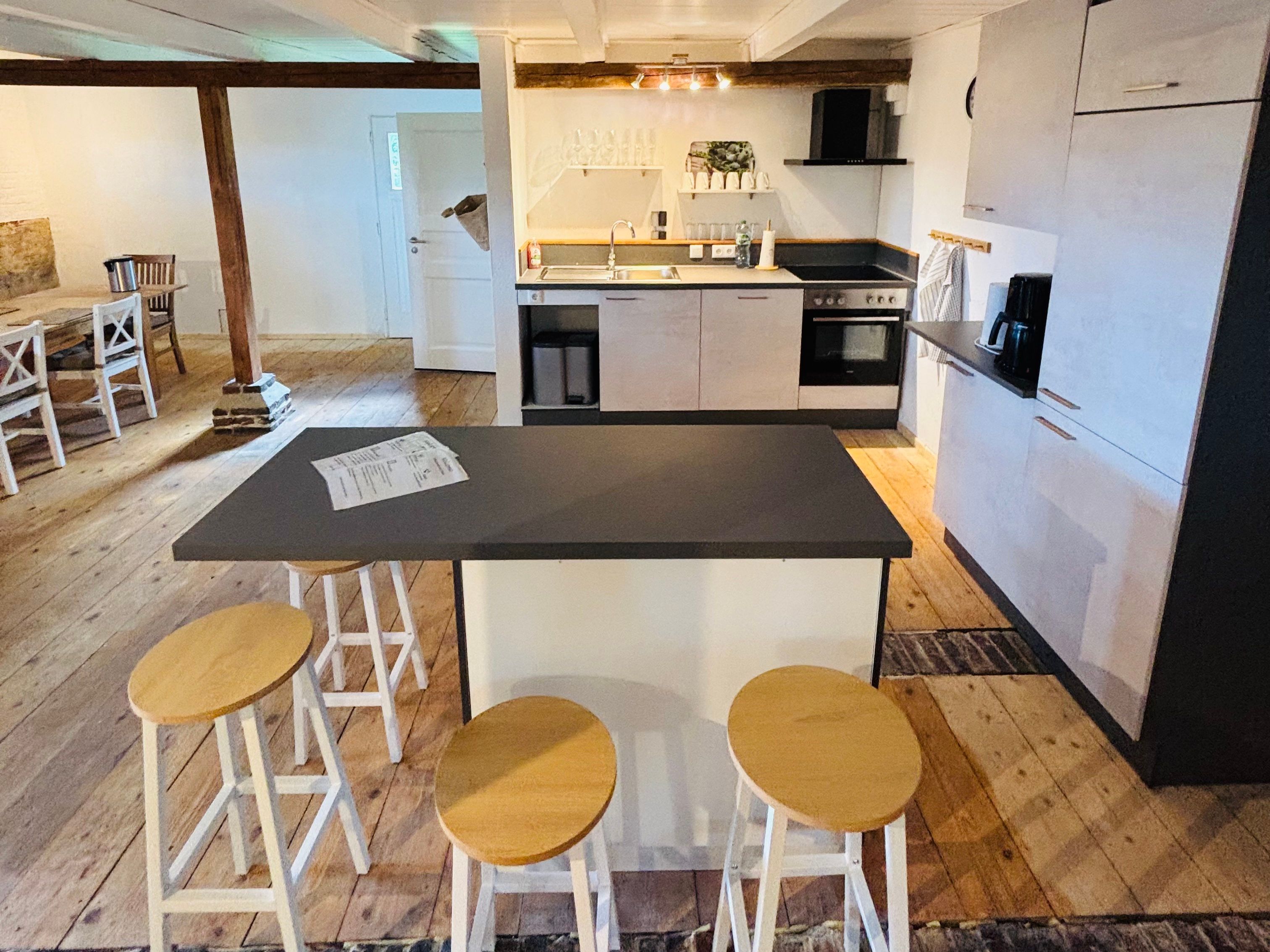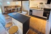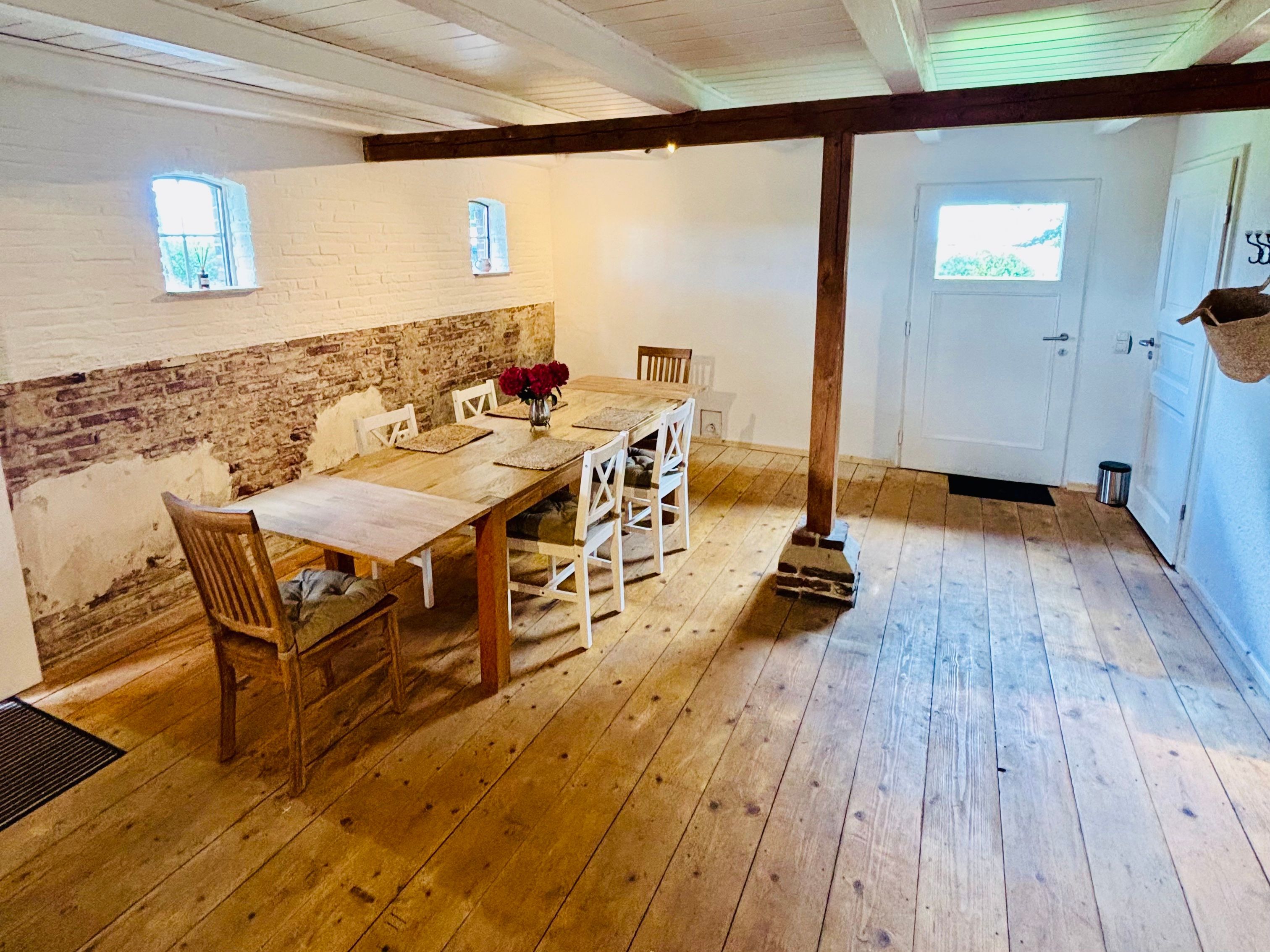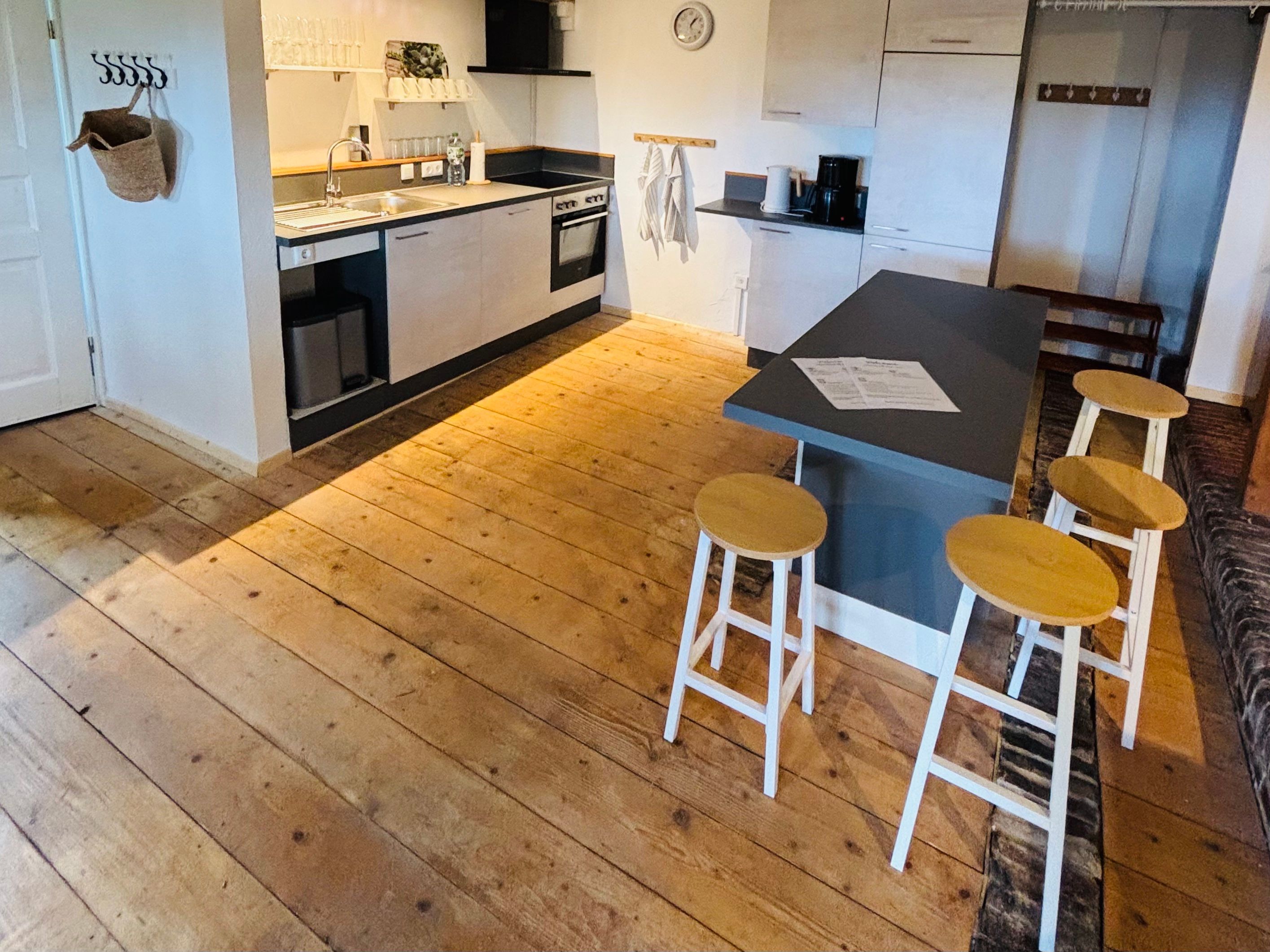 Im Erdgeschoss öffnet sich ein großzügiger, loftartiger Wohnbereich mit voll ausgestatteter, offener Küche, großem Esstisch, gemütlicher Sofaecke mit Fernseher und warmem Holzfußboden. Ebenfalls im Parterre befindet sich ein modernes Badezimmer mit Dusche und WC, das durch seinen stilvollen Klinkerfußboden ein besonderes Highlight setzt.