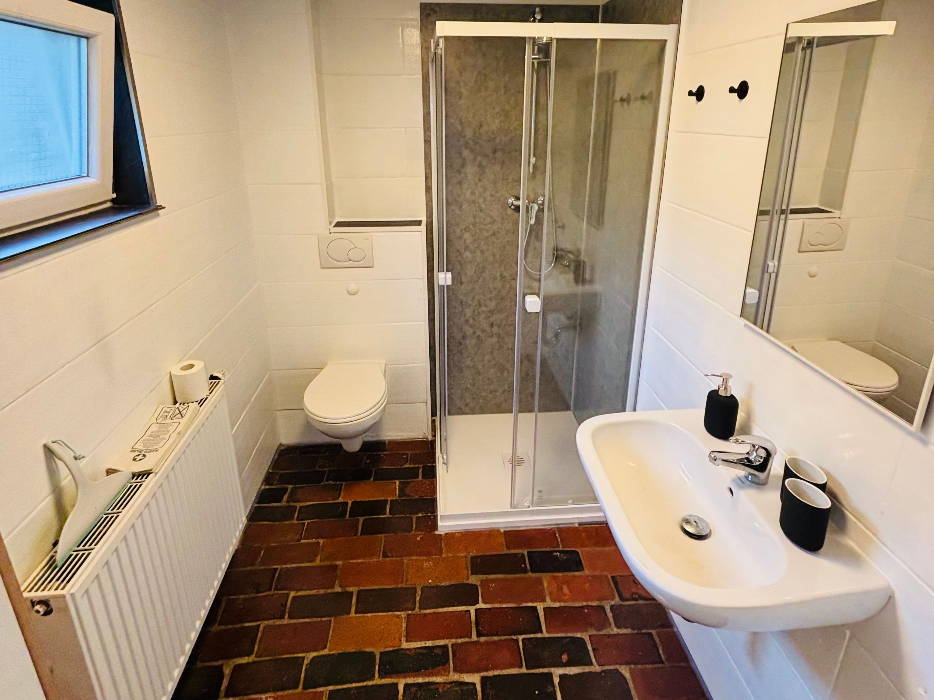• Badezimmer im Erdgeschoss mit Dusche, WC und Klinkerfußboden