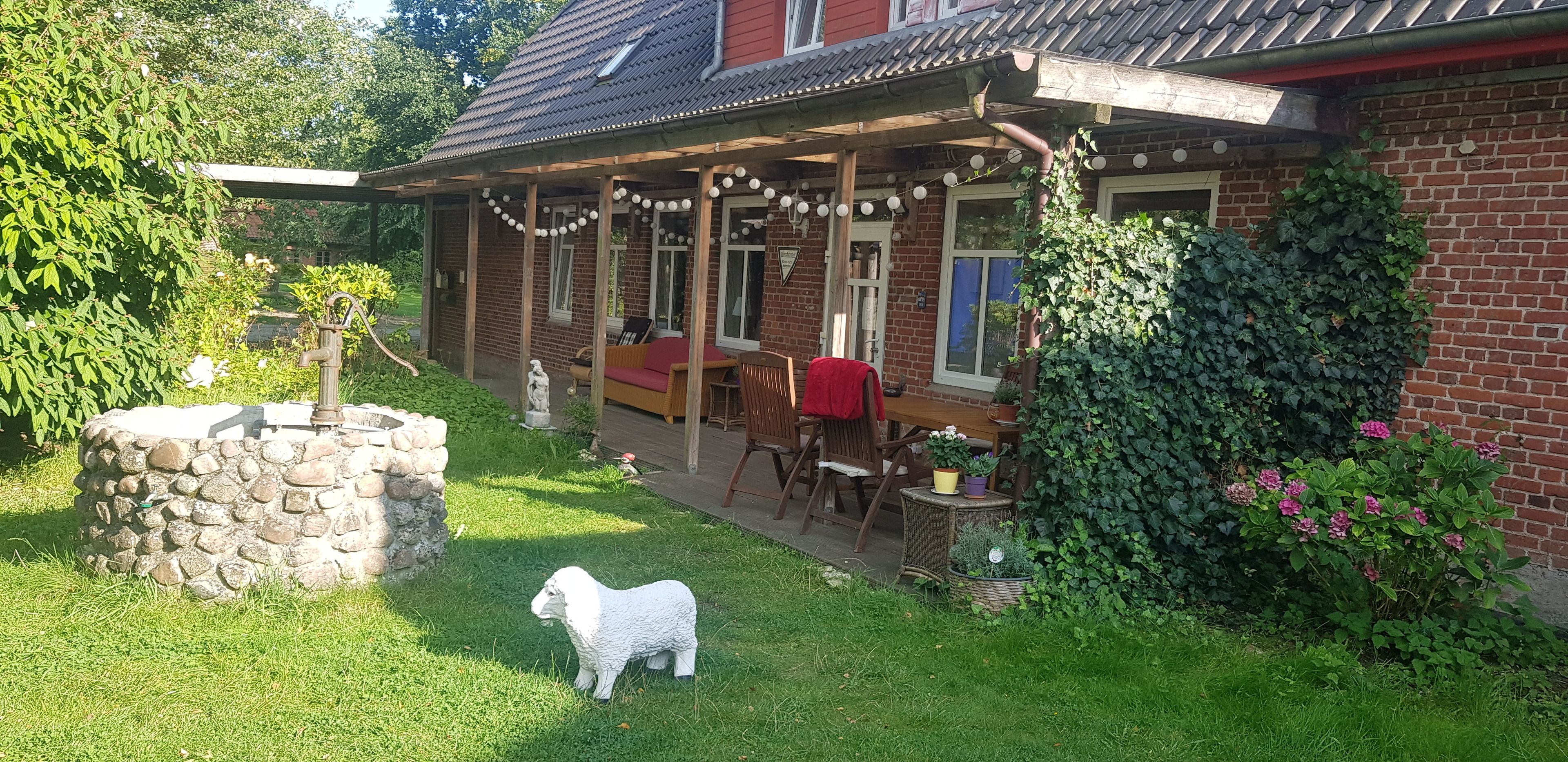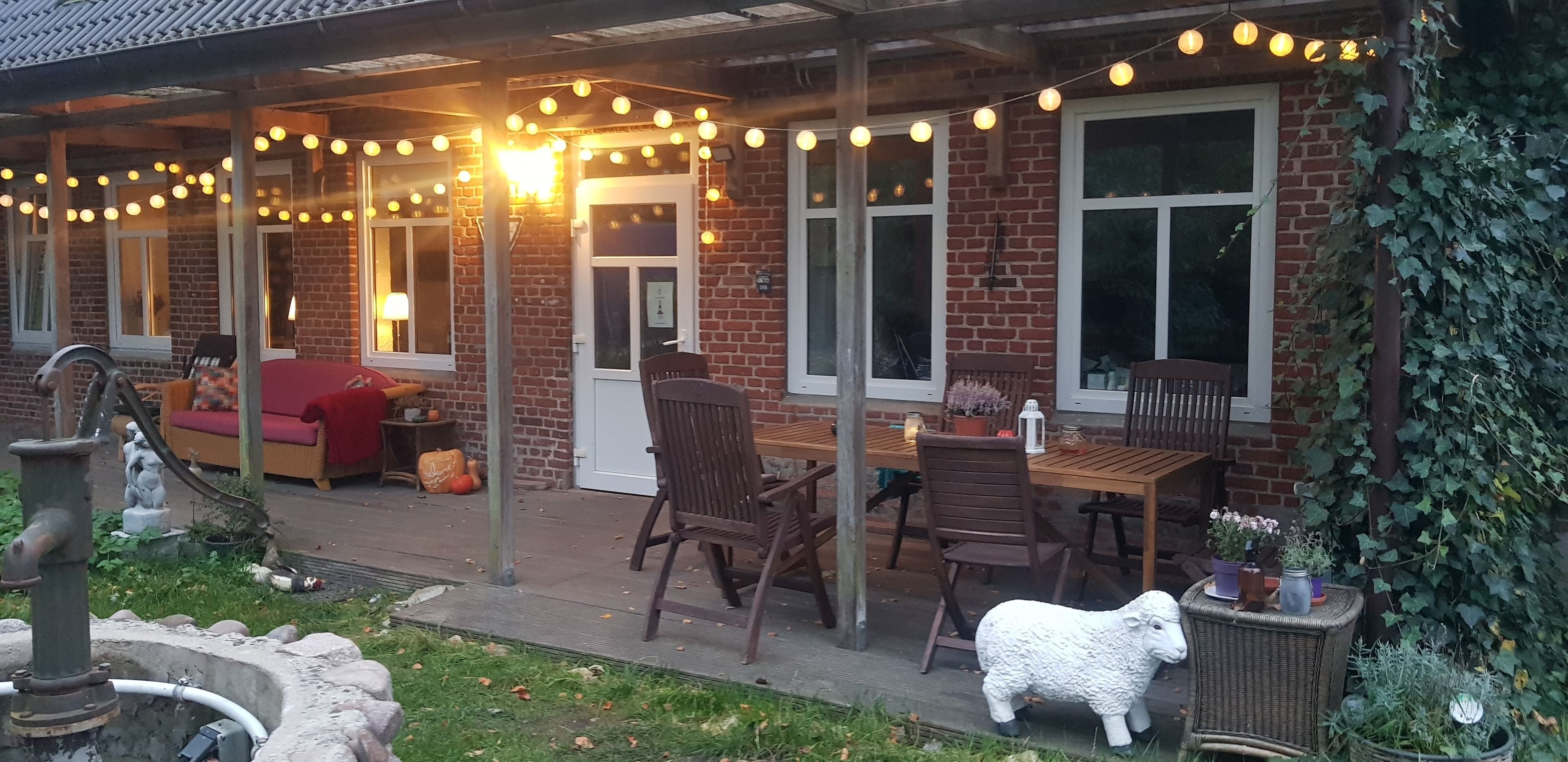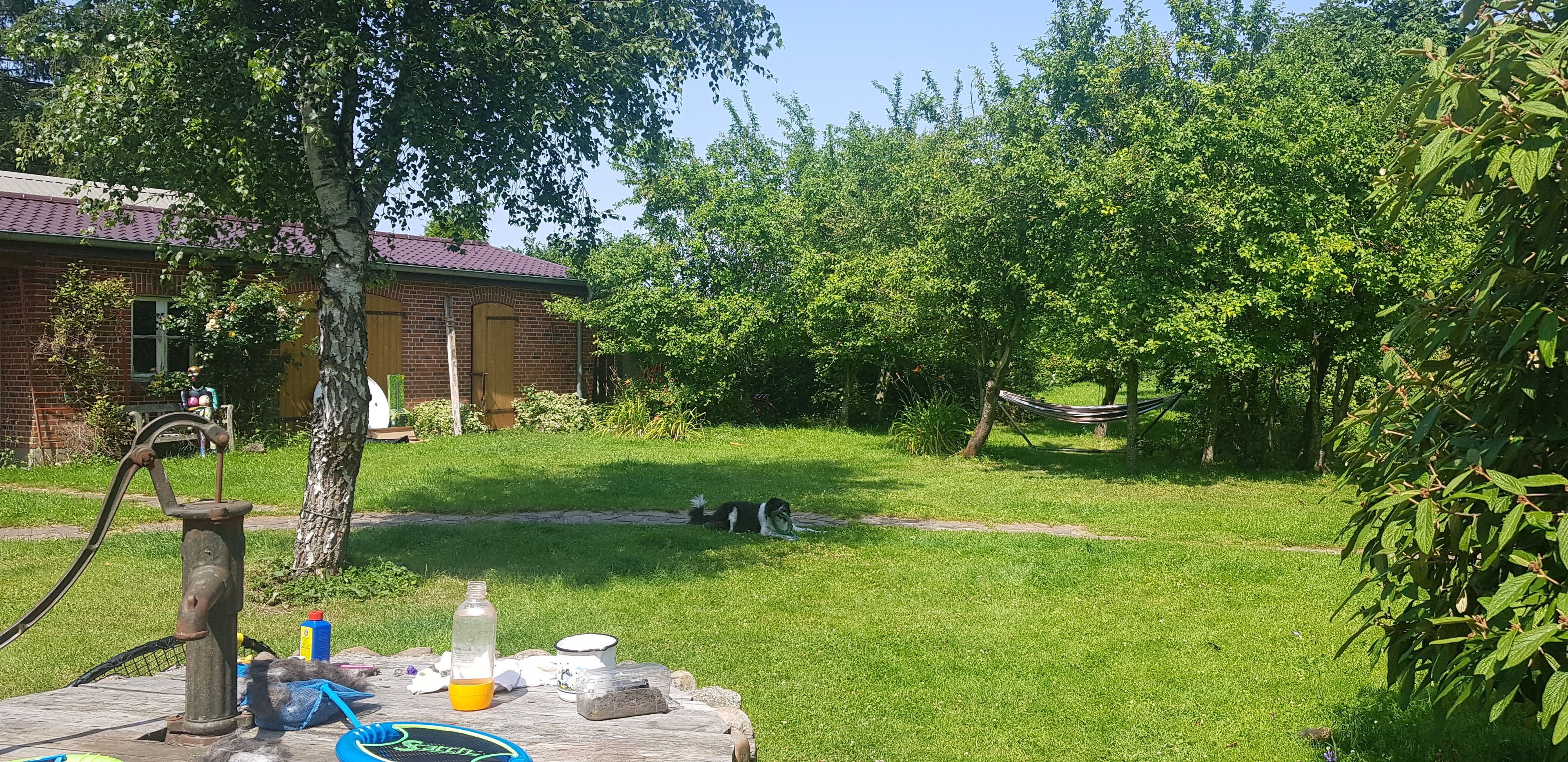Draußen auf der Terrasse befindet sich ein Sofa, sowie ein Tisch mit 6 Stühlen. In der Sonne Frühstücken, oder Abendbrot zu sich nehmen? Kein Problem, dafür sind wir bestens ausgestattet, ob auf der Terrasse oder im Garten, den Sie mit den vorhandenen Liegestühlen auch für Ihre Erholung nutzen können.