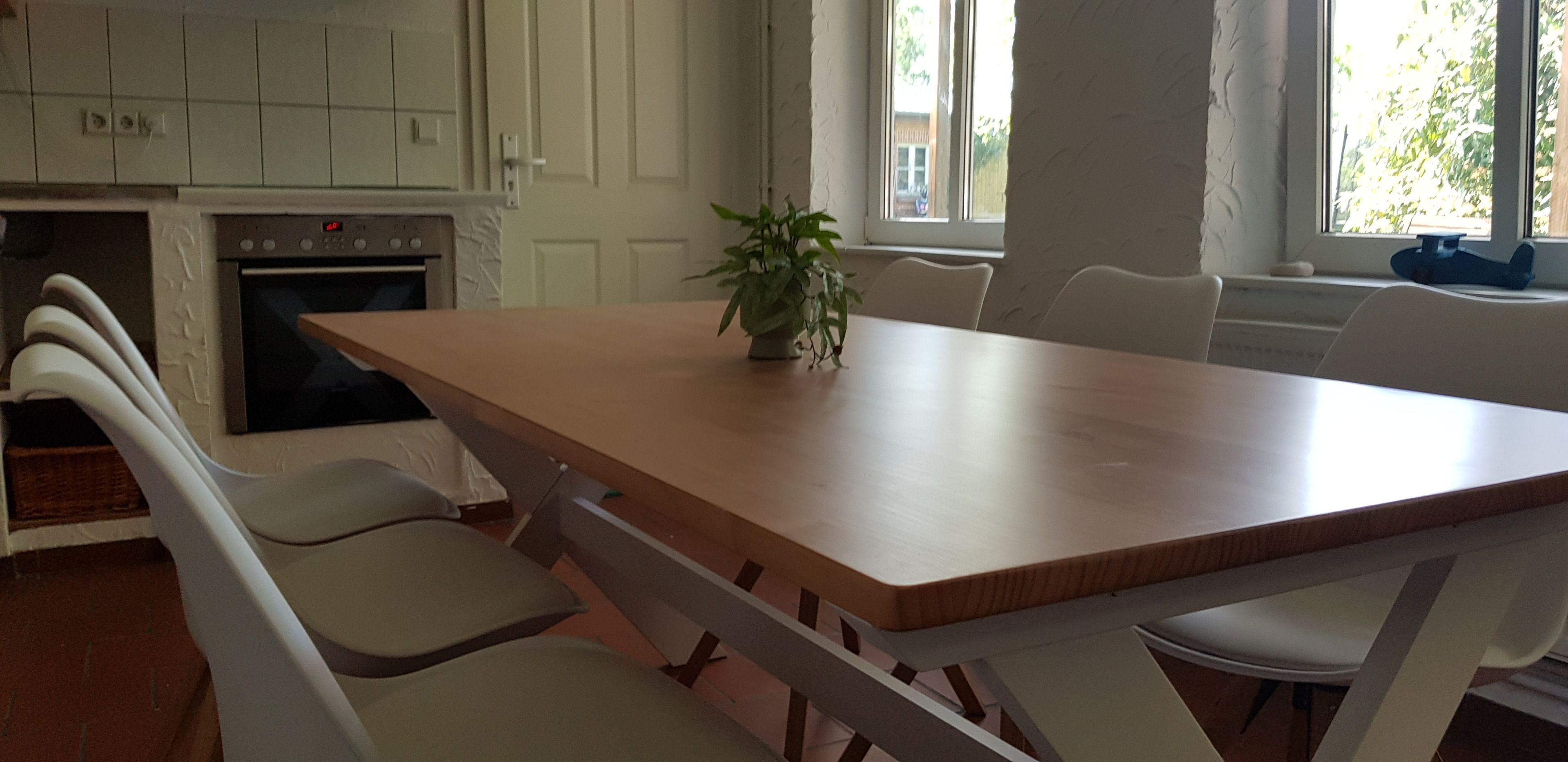 Wenn Sie die Ferienwohnung betreten sehen sie bereits die wunderbar große Küche mit einem Tisch für 6 Personen, der auf bis zu 10 Personen erweitert werden kann. Dort gibt es nicht nur einen Herd mit Backofen, sondern auch eine sehr hübsche Küchenhexe.