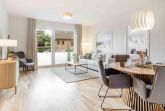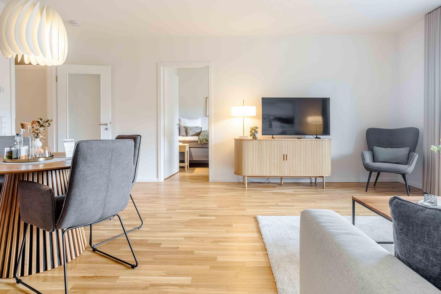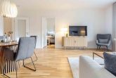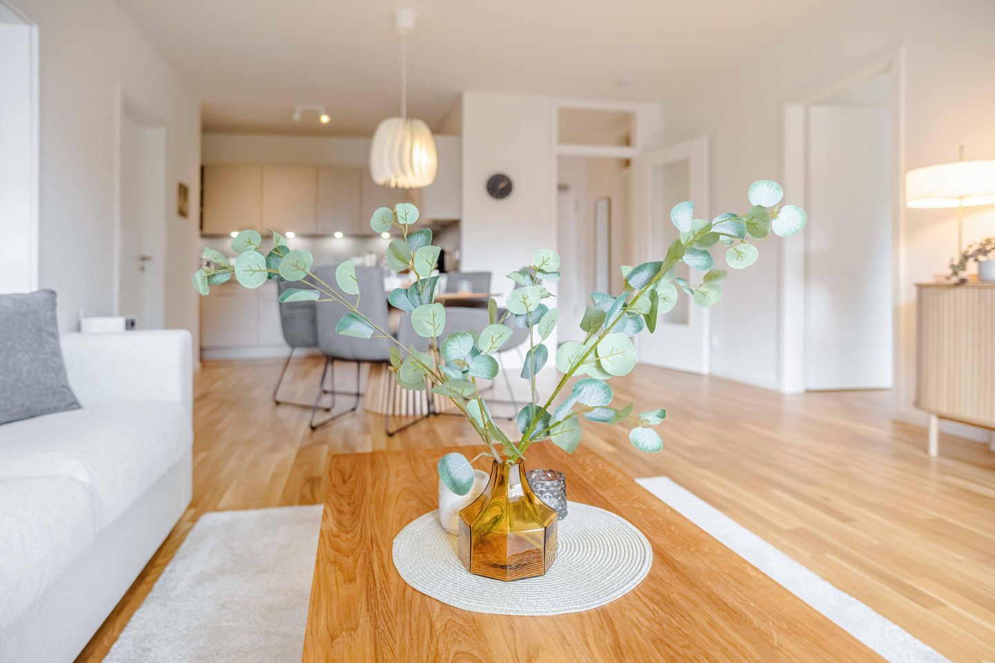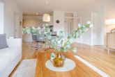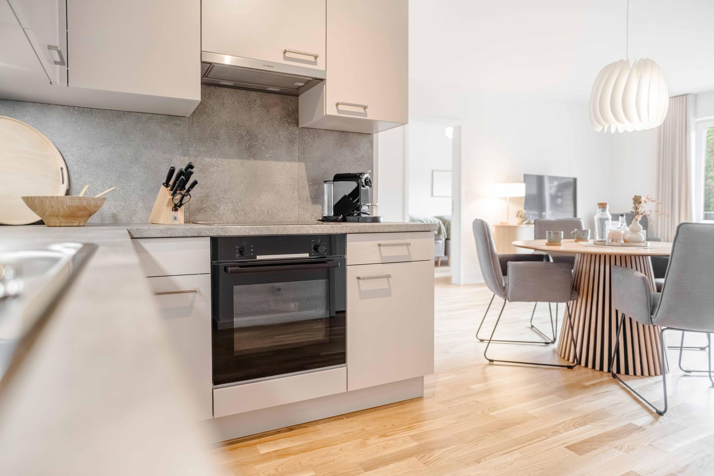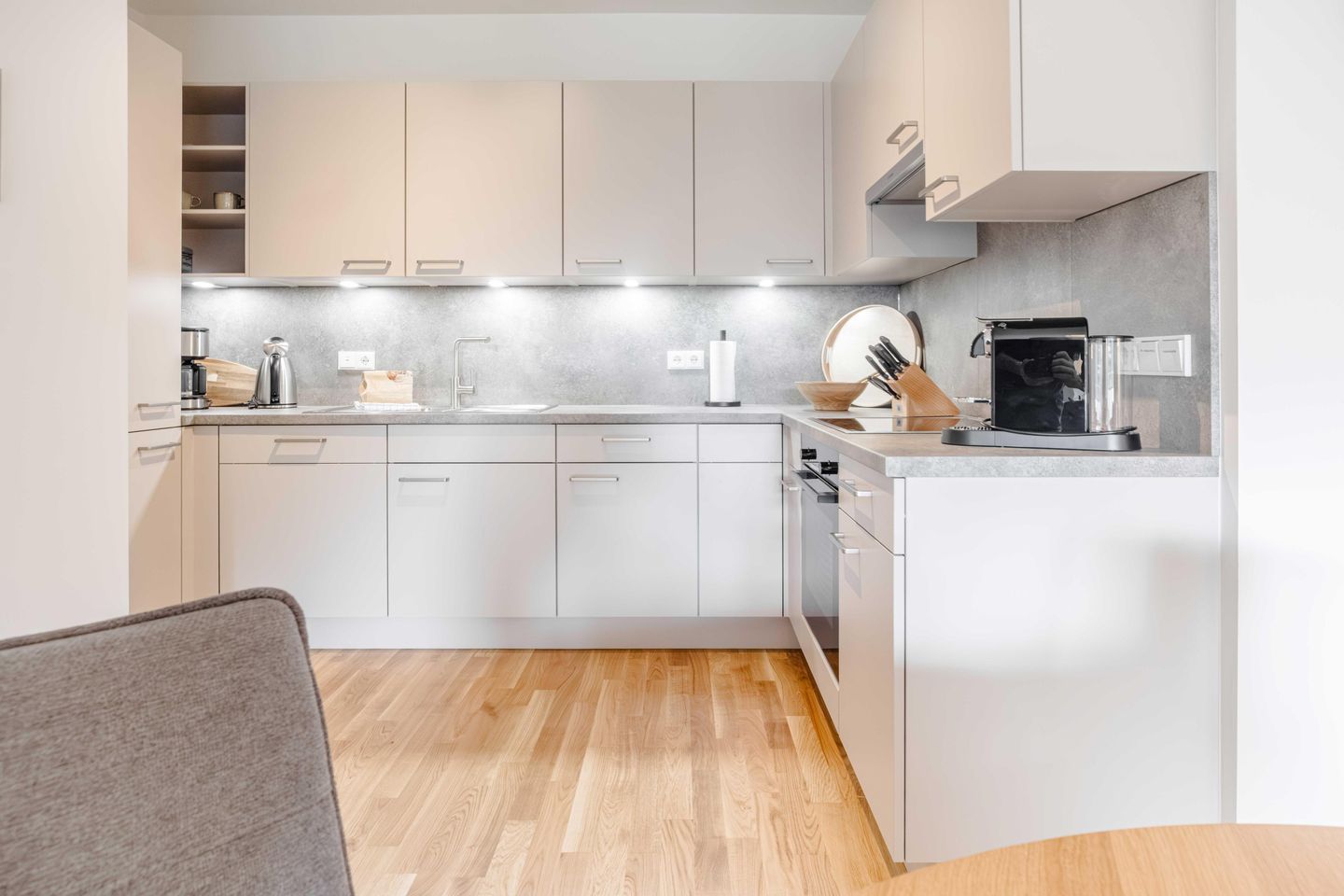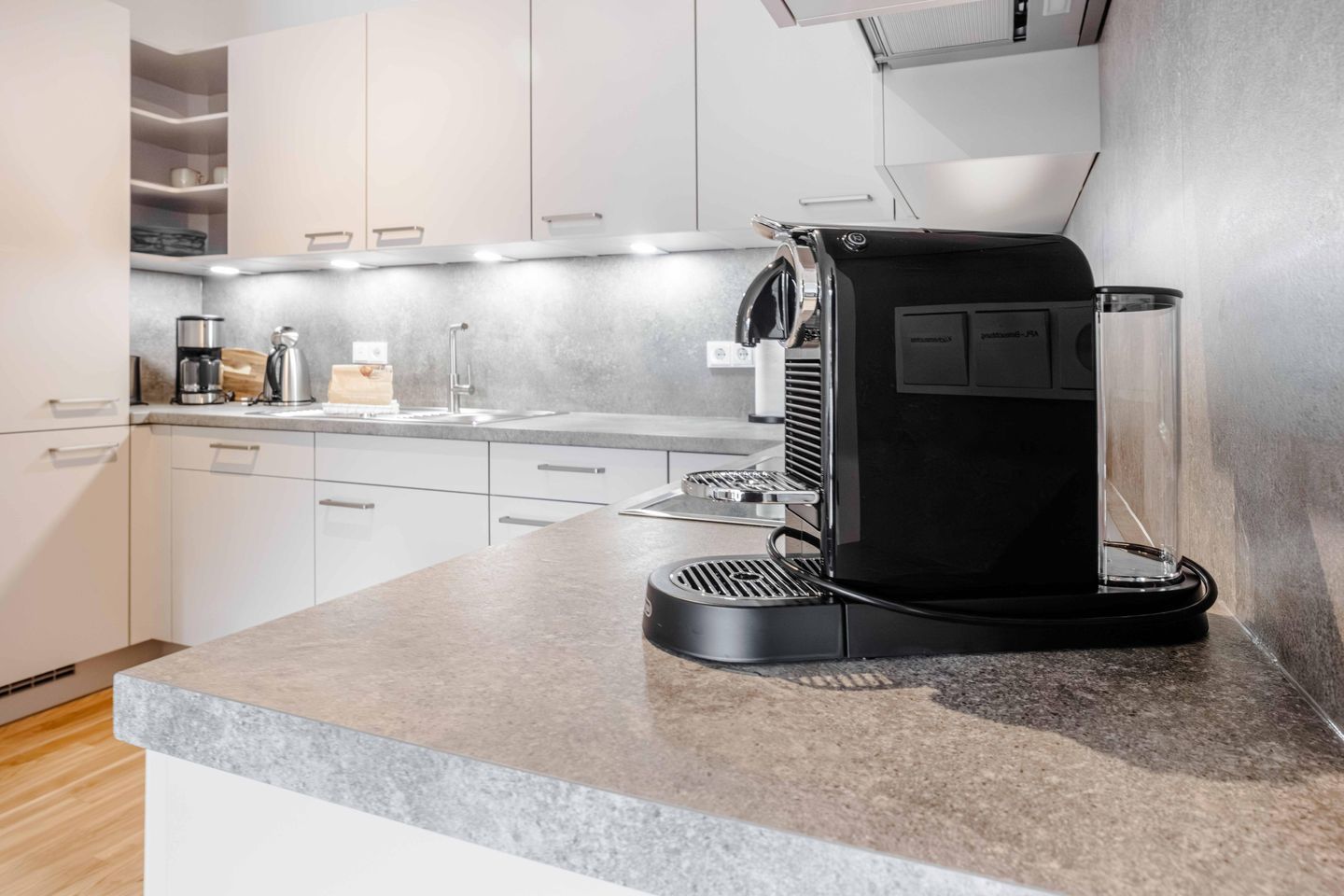 Im Herzen der Wohnung befindet sich der offene Wohn- und Essbereich, der mit einem gemütlichen Sofa, einem Sessel und einem großen Esstisch zum Verweilen einlädt. Die voll ausgestattete Küche lässt keine Wünsche offen: Induktionsherd, Backofen, Kühlschrank mit Gefrierfach, Spülmaschine, Kaffeemaschine sowie eine Nespresso-Espressomaschine stehen bereit, um kulinarische Highlights zuzubereiten. Für zusätzlichen Komfort sorgen Wasserkocher, Toaster, Elektrogrill und Handrührgerät.