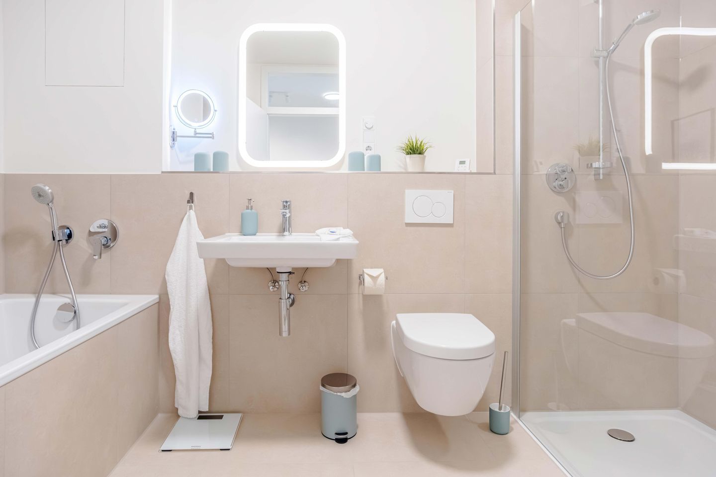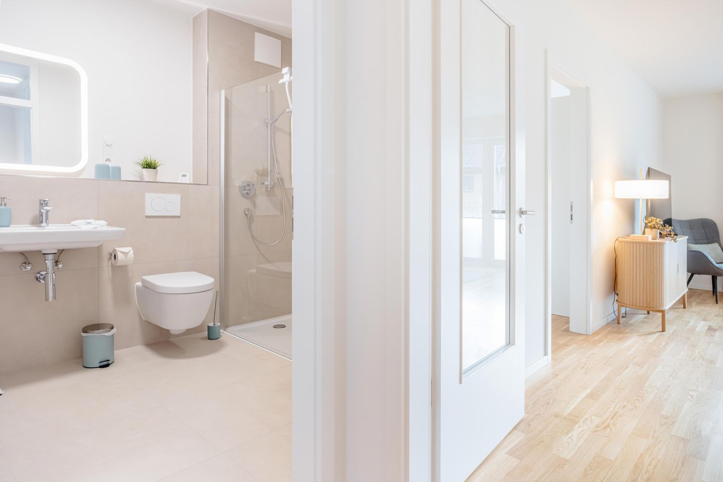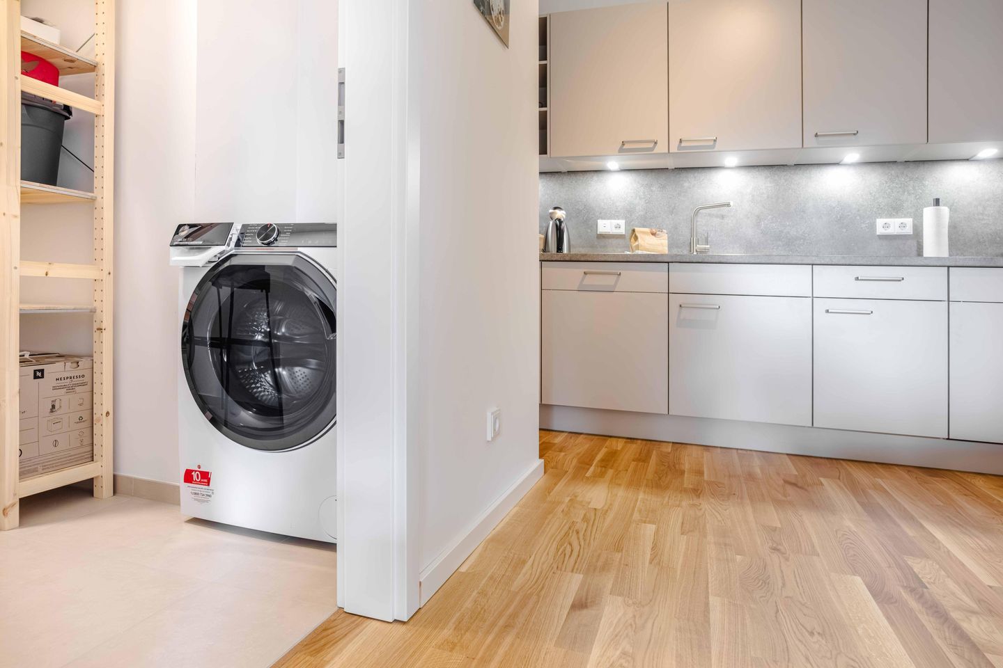 Das Badezimmer besticht durch modernes Design mit bodengleicher Dusche und Badewanne – perfekt für entspannte Momente nach einem erlebnisreichen Tag. Ein Haartrockner, Kosmetikspiegel und Ganzkörperspiegel sind ebenfalls vorhanden. Für Ihre Wäsche steht eine Waschmaschine bereit; Bügelbrett, Bügeleisen, Wäscheständer und Staubsauger sind ebenfalls inklusive.