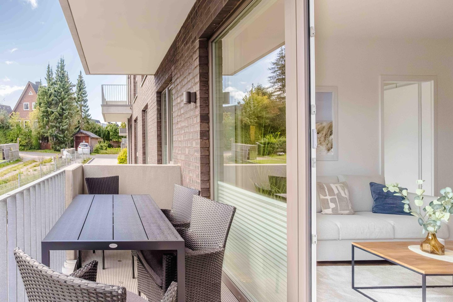 Genießen Sie sonnige Stunden auf dem Balkon mit Gartenmöbeln und Sonnenschirm – hier können Sie die frische Luft in vollen Zügen genießen.