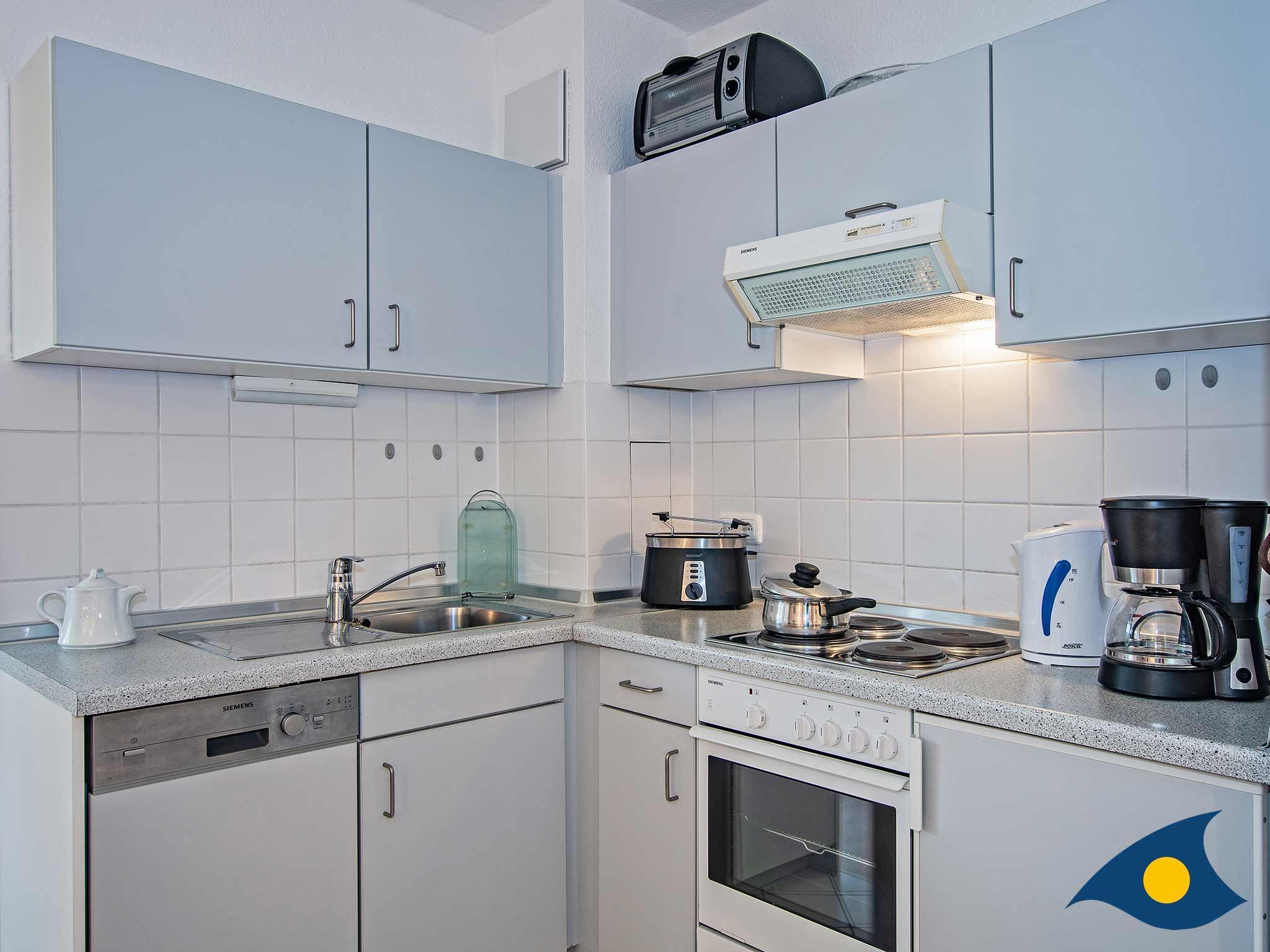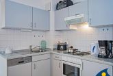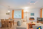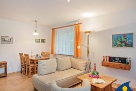 Im Wohnzimmer steht Ihnen eine gut ausgestattete Küchenzeile, ein Essplatz und bequeme Sitzlandschaft zur Verfügung.
