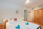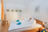Das Schlafzimmer mit dem großen Doppelbett und den Einbauschränken tragen zum Wohlfühlen bei.
