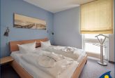Das komfortabel eingerichtete Schlafzimmer im ersten Obergeschoß mit großem Doppelbett (180x200 cm) und einem geräumigen Kleiderschrank erreicht man über die gerade Treppe innerhalb der Wohnung. Das danebengelegene Badezimmer mit Badewanne, Haartrockner und Miele Waschmaschine lässt keine Wünsche offen.