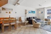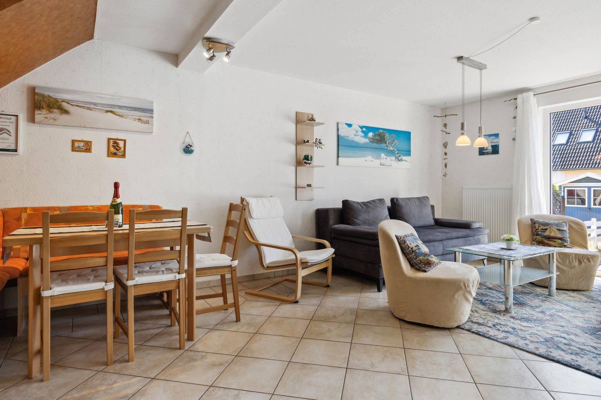 Im Inneren des Ferienhauses erwarten Sie gemütliche und funktionell eingerichtete Räumlichkeiten. Die integrierte Küche und Essecke im Wohnzimmer schaffen eine offene und einladende Atmosphäre. Für Unterhaltung sorgt ein TV-Gerät, und maritime Accessoires unterstreichen das Urlaubsflair. Für Komfort in der Nacht sorgen Schlafzimmer mit Veluxdachfenstern, ausgestattet mit Innenfliegenschutzgittern und Rollos zum Abdunkeln, sowie eine kleine, praktikable Waschküche im Badezimmer.