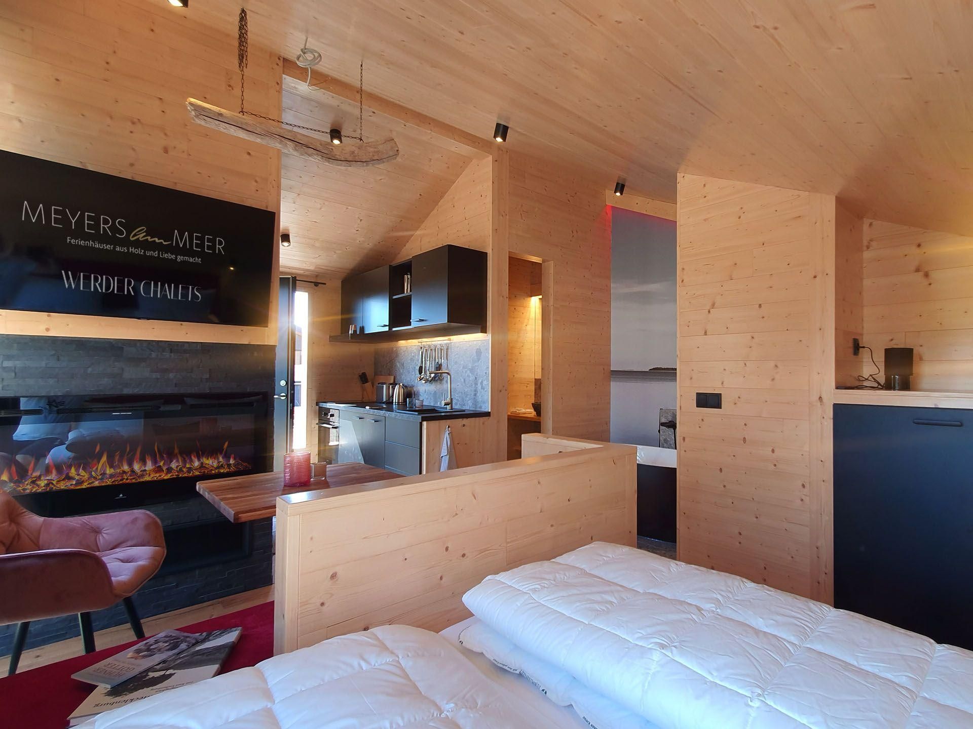 Der Innenraum unseres Ferienhauses verzaubert mit modernem Komfort und liebevollen Details. Ein großes Kingsize-Bett lädt zu kuscheligen Netflix-Nächten ein, während die kleine, fein ausgestattete Küche Selbstversorgung zum Vergnügen macht. Ein absolutes Highlight ist die freistehende Badewanne, die zusammen mit der Walk-In-Dusche für echtes Spa-Feeling sorgt. Abgerundet wird das Angebot durch den Elektrokamin, der an kühlen Abenden für behagliche Wärme und Romantik sorgt.