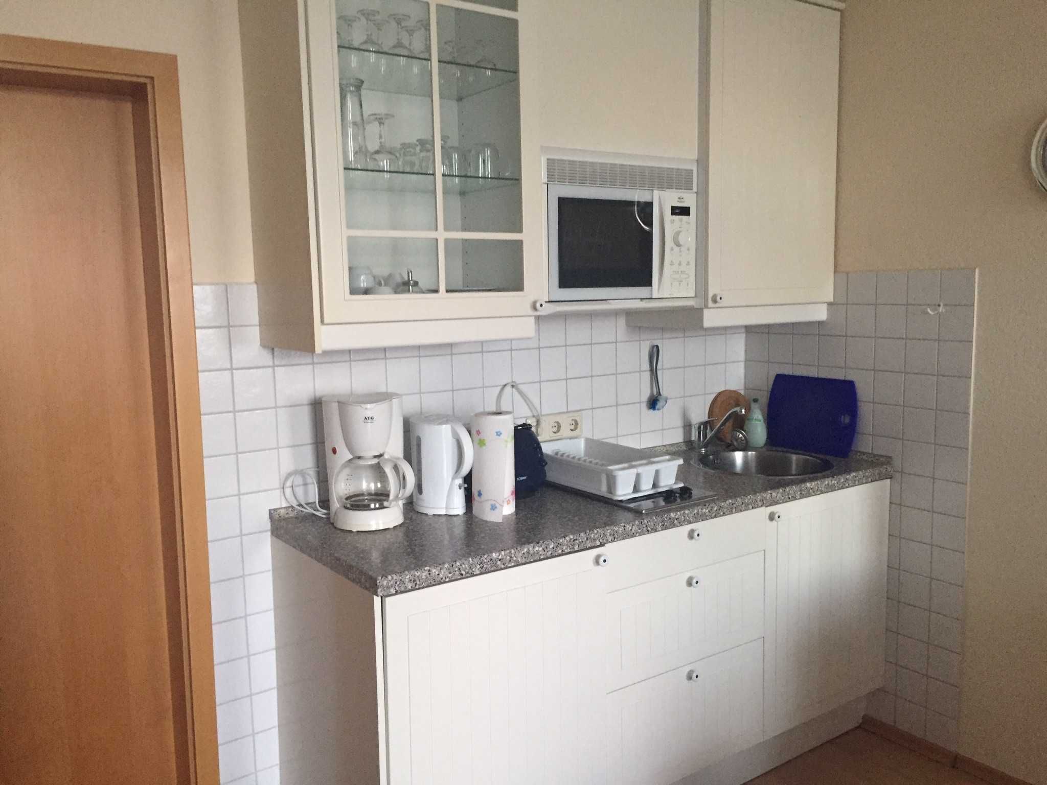 Die Wohnküche verfügt über einen Kühlschrank, 2 Cerankochfelder, Toaster, Wasserkocher und eine Filterkaffeemaschine. Das Apartment kann bequem über einen Fahrstuhl erreicht werden. Ein eigener PkW-Stellplatz auf dem Parkdeck gehört mit zur Ferienwohnung.