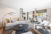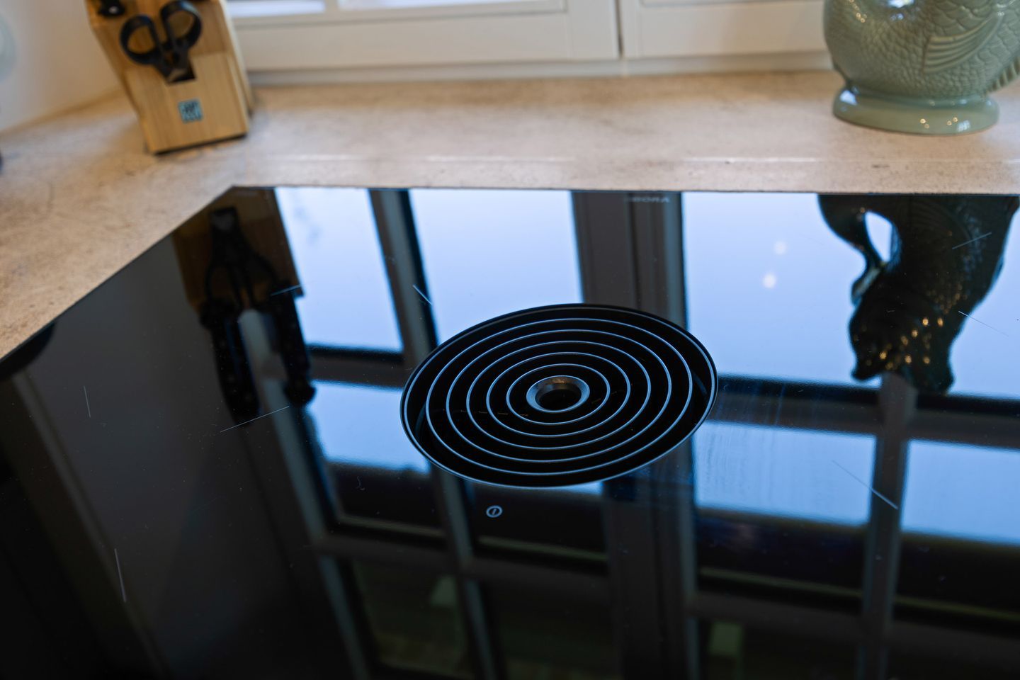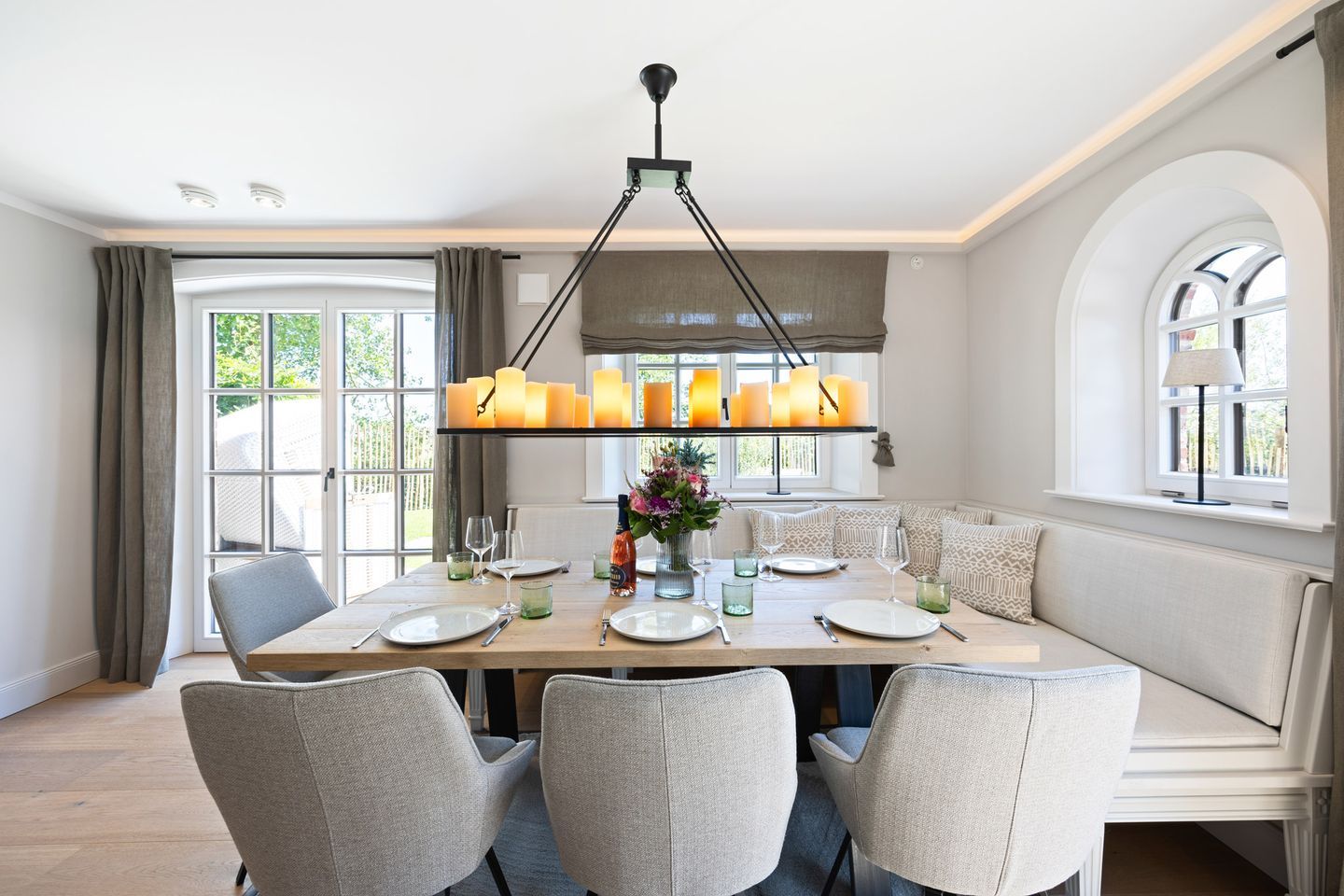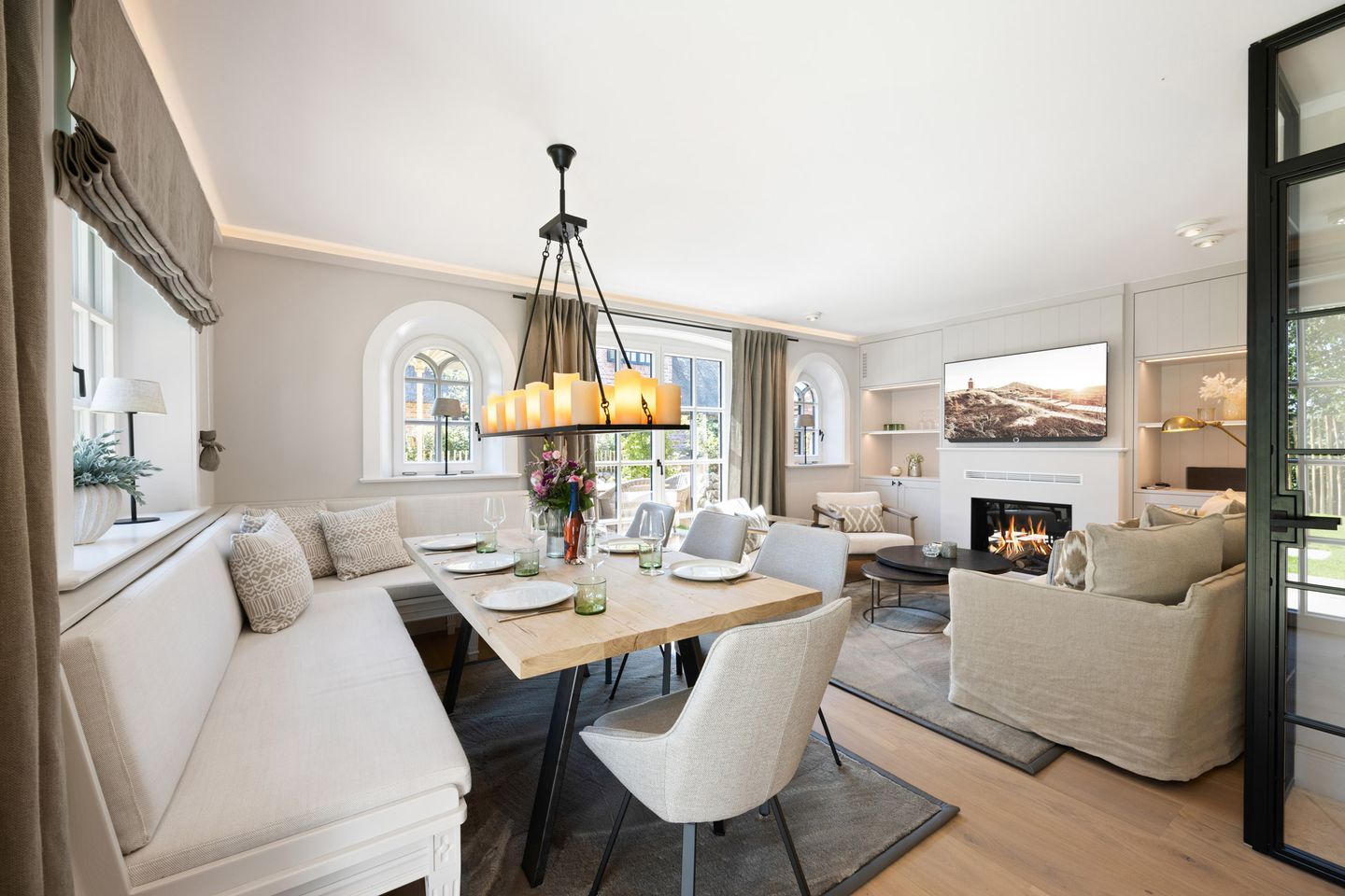 Die in den Wohnbereich integrierte, offene Küche ist mit hochwertigen Miele-Einbaugeräten und einem BORA Kochfeld ausgestattet. Weitere Highlights sind der Dampfgarer, der Weinkühlschrank und die Moccamaster Kaffeemaschine. Am großen Esstisch finden bis zu 6 Personen Platz – perfekt für gesellige Abende.