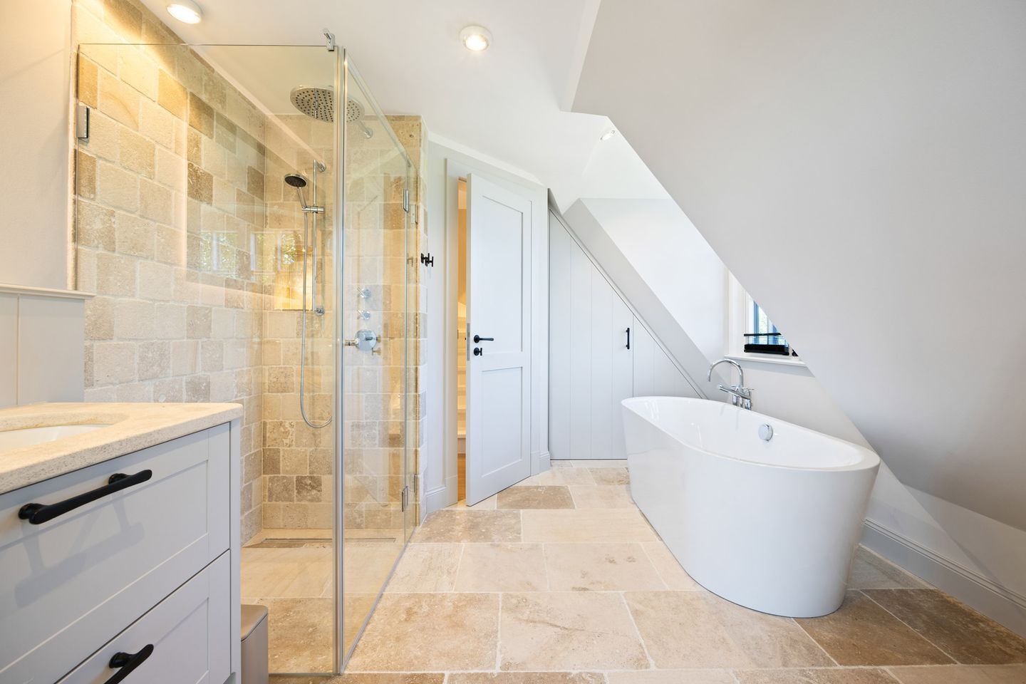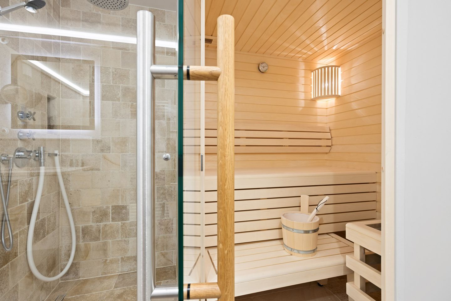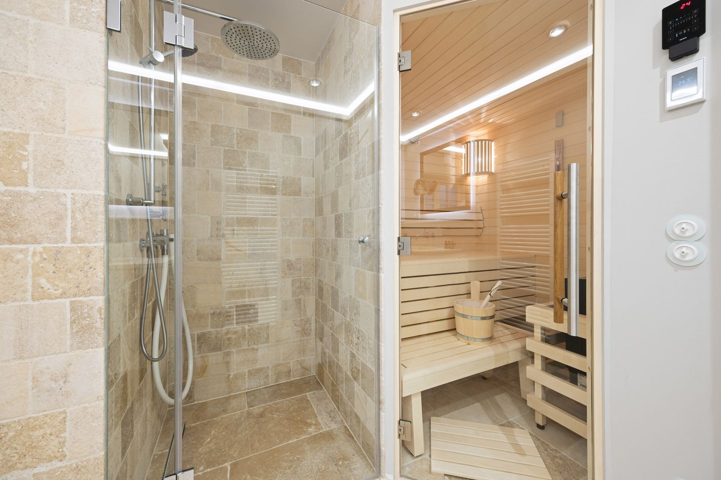 Die Doppelhaushälfte verfügt über zwei luxuriöse Badezimmer. Eines der Badezimmer ist mit einer bodengleichen Dusche, Tageslicht und einem Föhn ausgestattet. Das Wellnessbad besticht durch eine Sauna, eine freistehende Badewanne und eine bodengleiche Dusche – ideal für entspannte Stunden nach einem Tag auf der Insel. Ein separates Gäste-WC rundet das Angebot ab.