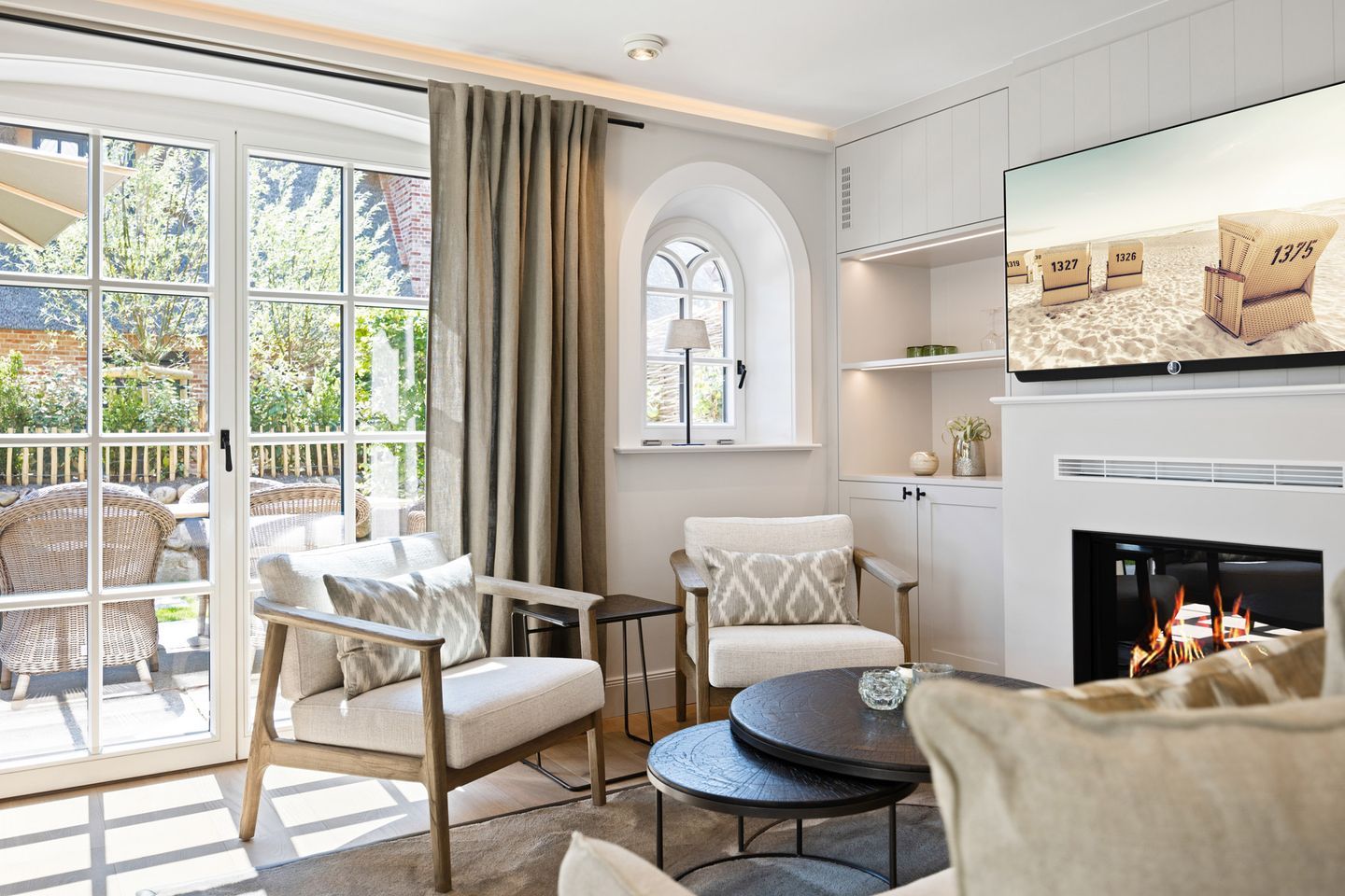 Der offene Wohn- und Essbereich bietet eine einladende Atmosphäre, in der Sie sich sofort wohlfühlen werden. Machen Sie es sich auf dem bequemen Sofa oder in den zwei Sesseln vor dem Kamin gemütlich, während Sie den Blick in den Garten genießen. Die zwei Freisitze in süd-östlicher Ausrichtung laden dazu ein, die frische Nordseeluft und den Sonnenschein zu genießen.