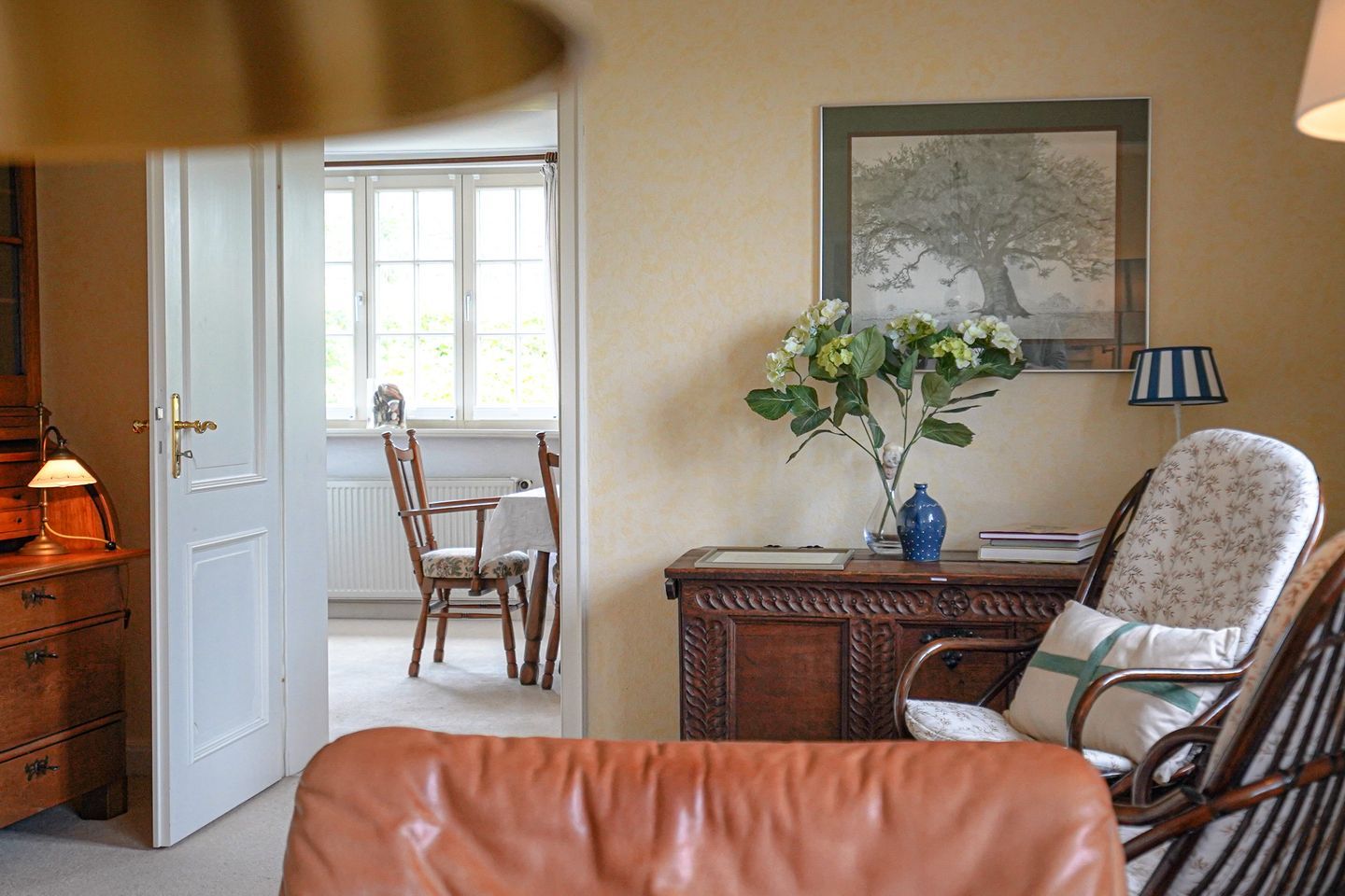 Im Erdgeschoss erwarten Sie ein Wohnzimmer mit Kamin, ein separates Esszimmer, eine gut ausgestattete Küche, zwei Schlafzimmer, ein Badezimmer mit Dusche sowie ein separates WC. Besonders schön ist der helle Wintergarten, von dem Sie direkt auf die Terrasse gelangen – ausgestattet mit zwei Strandkörben, perfekt zum Entspannen.