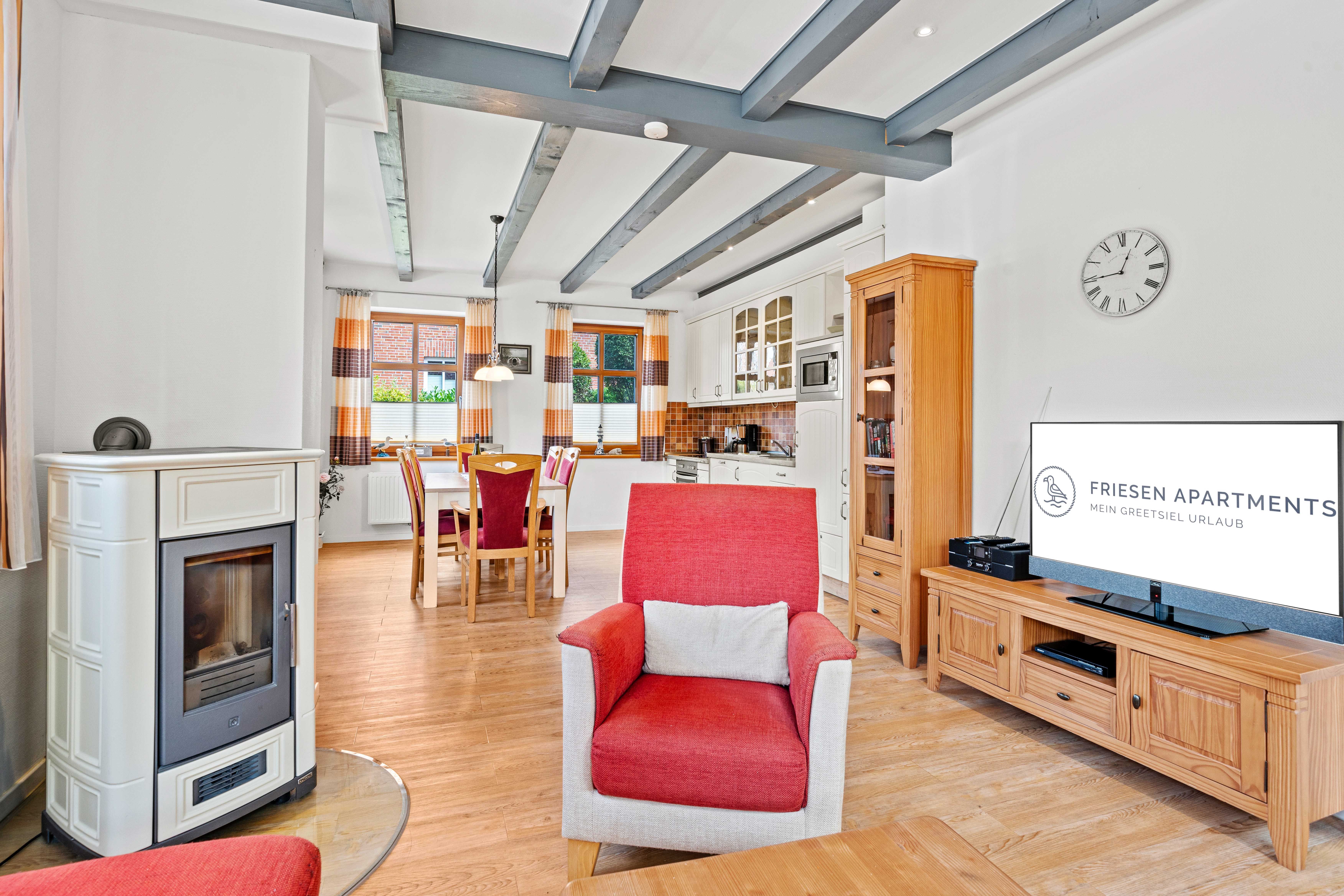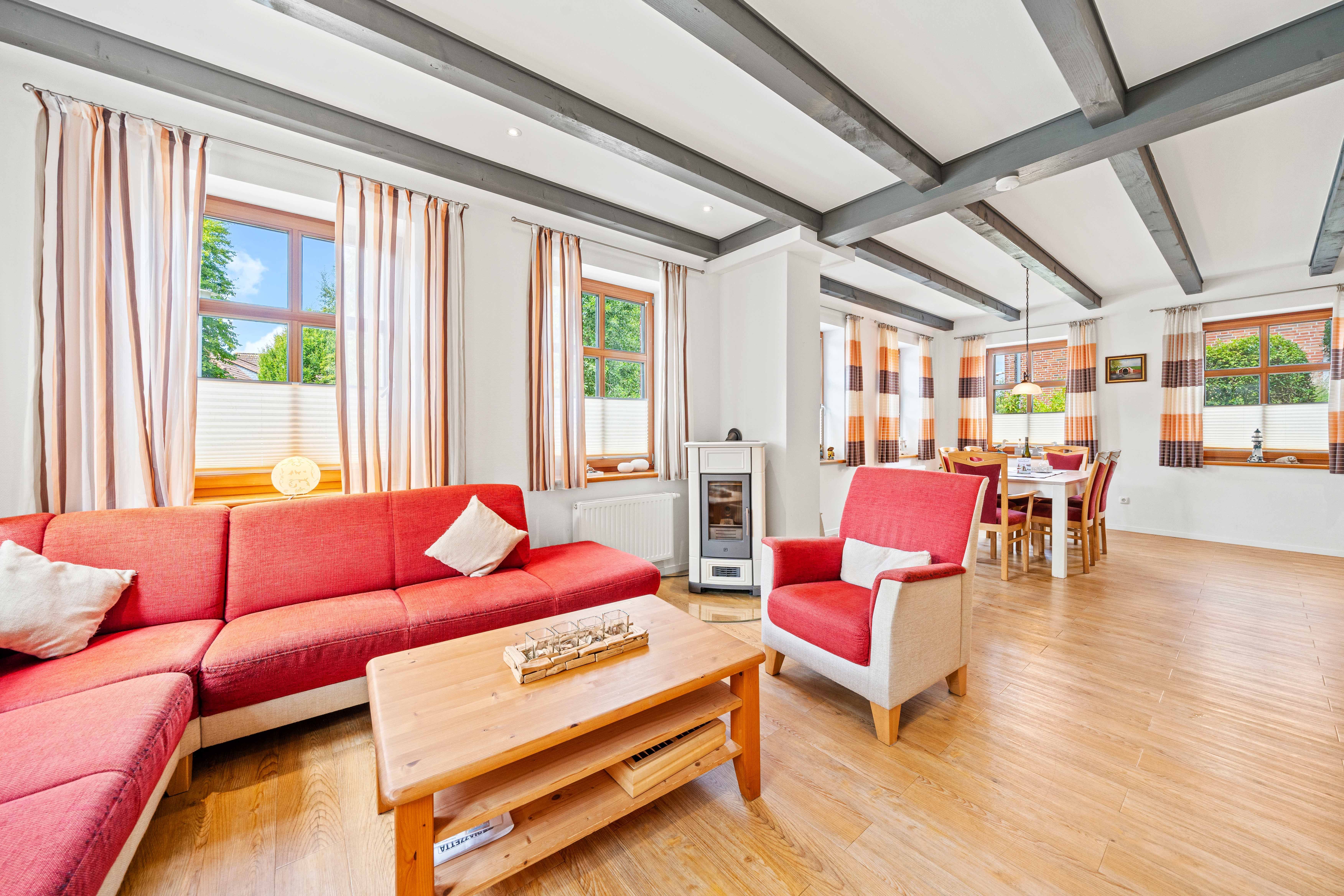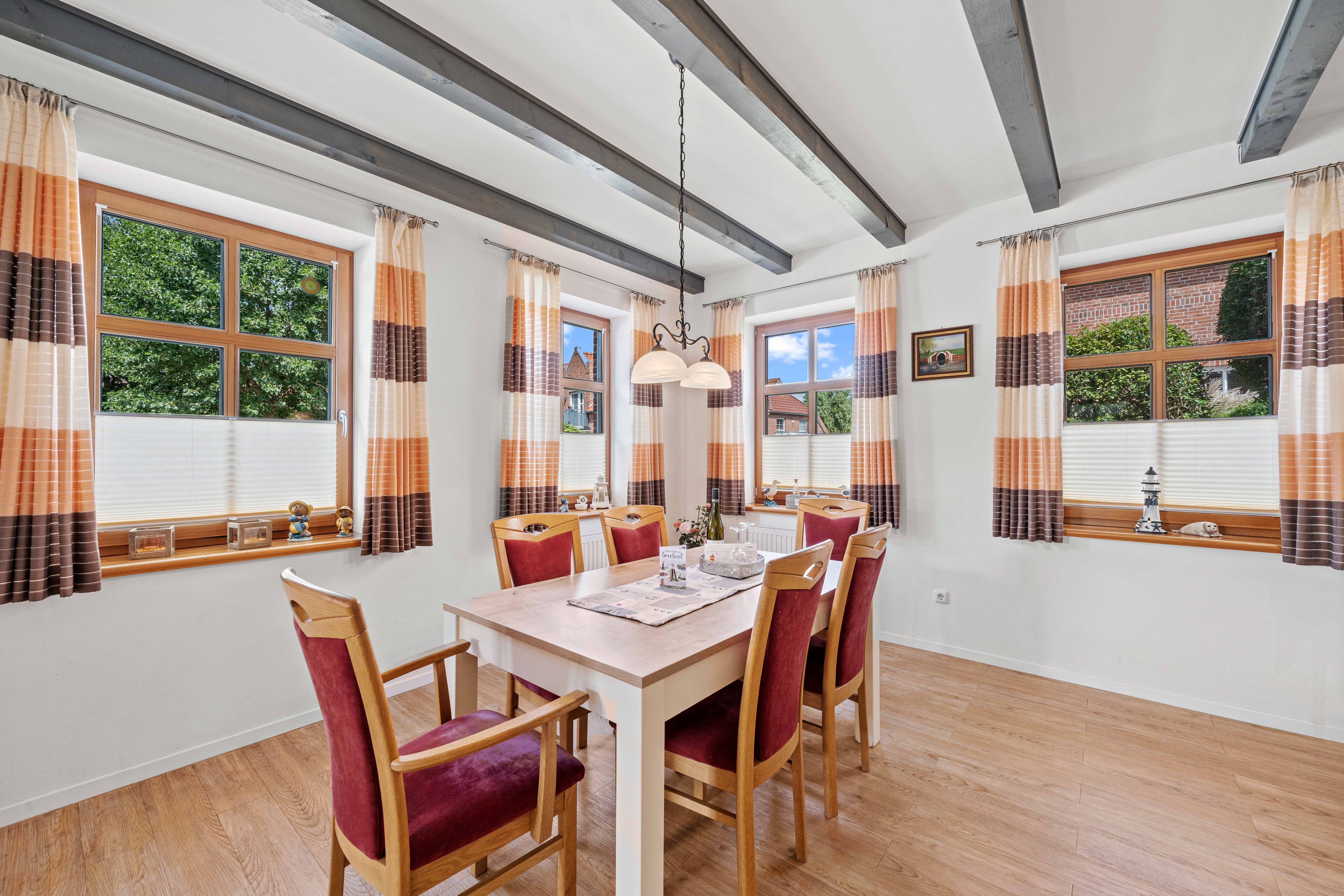 Mitten im historischen Hafen, direkt am Alten Deich 25, liegt die stilvolle Ferienwohnung Bummert am Hafen Nr. 3 eine gemütliche Unterkunft im charmanten Dreigiebelhaus mit nur drei Wohneinheiten. Auf großzügigen 90qm erwartet Sie ein Ort zum Ankommen und Wohlfühlen, ideal für bis zu vier Personen. Die Wohnung besticht durch ihren hellen, offenen Wohnbereich, der mit einem gemütlichen Kamin, einer großen Wohnlandschaft, einem Esstisch und einer modernen Einbauküche ausgestattet und somit das Herzstück der Wohnung ist. Weiterhin bietet die Wohnung im Obergeschoss zwei liebevoll eingerichtete Schlafzimmer mit Doppelbetten. Besonders komfortabel für den gemeinsamen Urlaub mit der Familie oder Freunden sind die beiden Badezimmer, wovon eines mit ebenerdiger Dusche und das andere mit einer Badewanne und einer zusätzlichen Dusche ausgestattet ist. Zur Wohnung gehören außerdem eine überdachte Terrasse, die auch bei norddeutschem Wetter ein geschützter Ort zum Verweilen ist sowie ein PKW-Stellplatz direkt am Haus. Auch ein gemeinschaftlich nutzbarer Waschraum mit Waschmaschine und Trockner ist vorhanden. Somit ist die Wohnung Bummert am Hafen Nr. 3 die perfekte Adresse für alle, die Ruhe, Komfort und die Nähe zum Wasser schätzen.