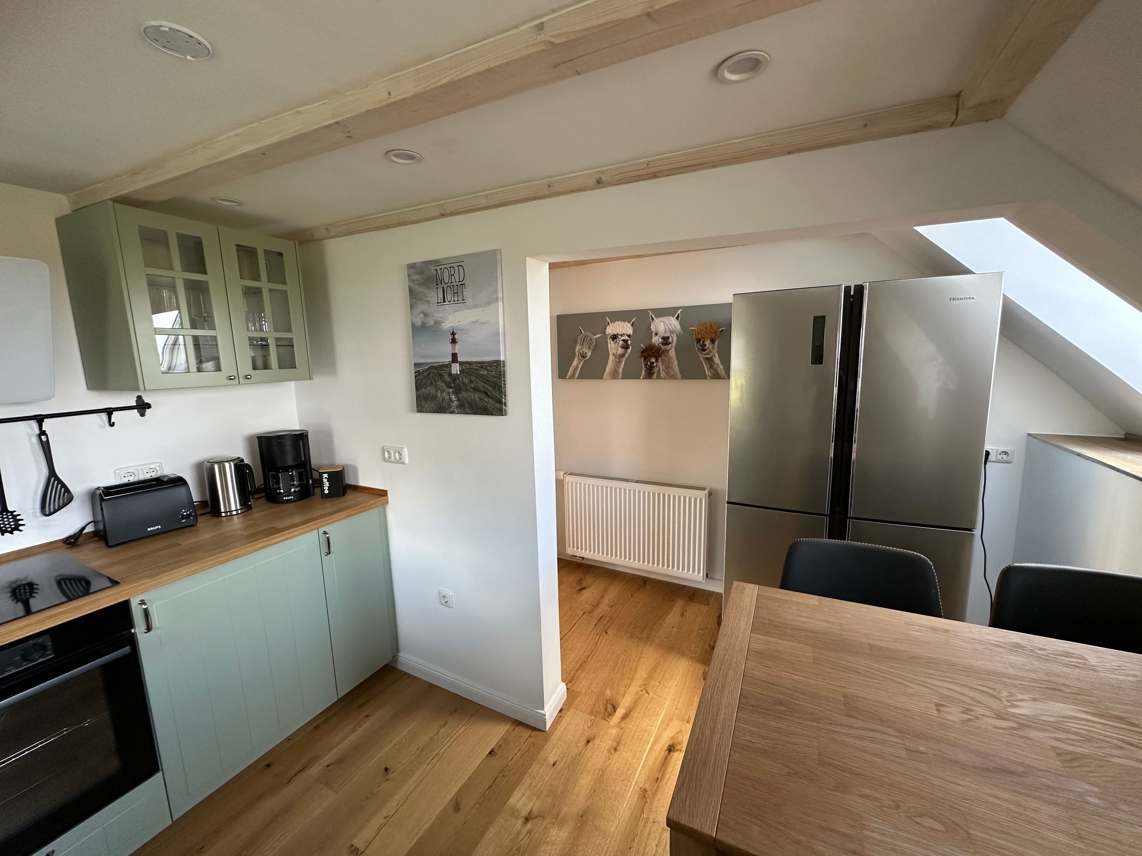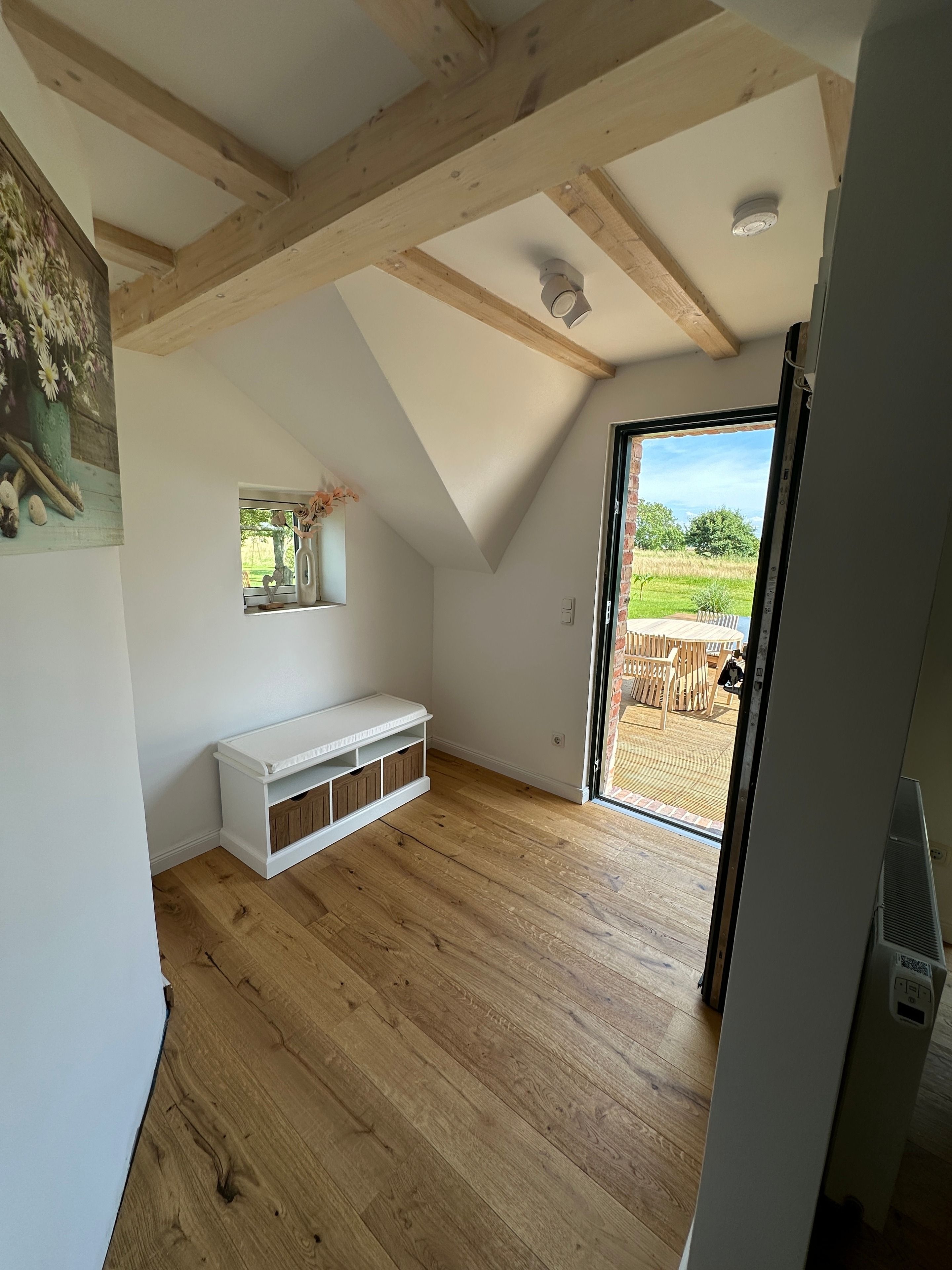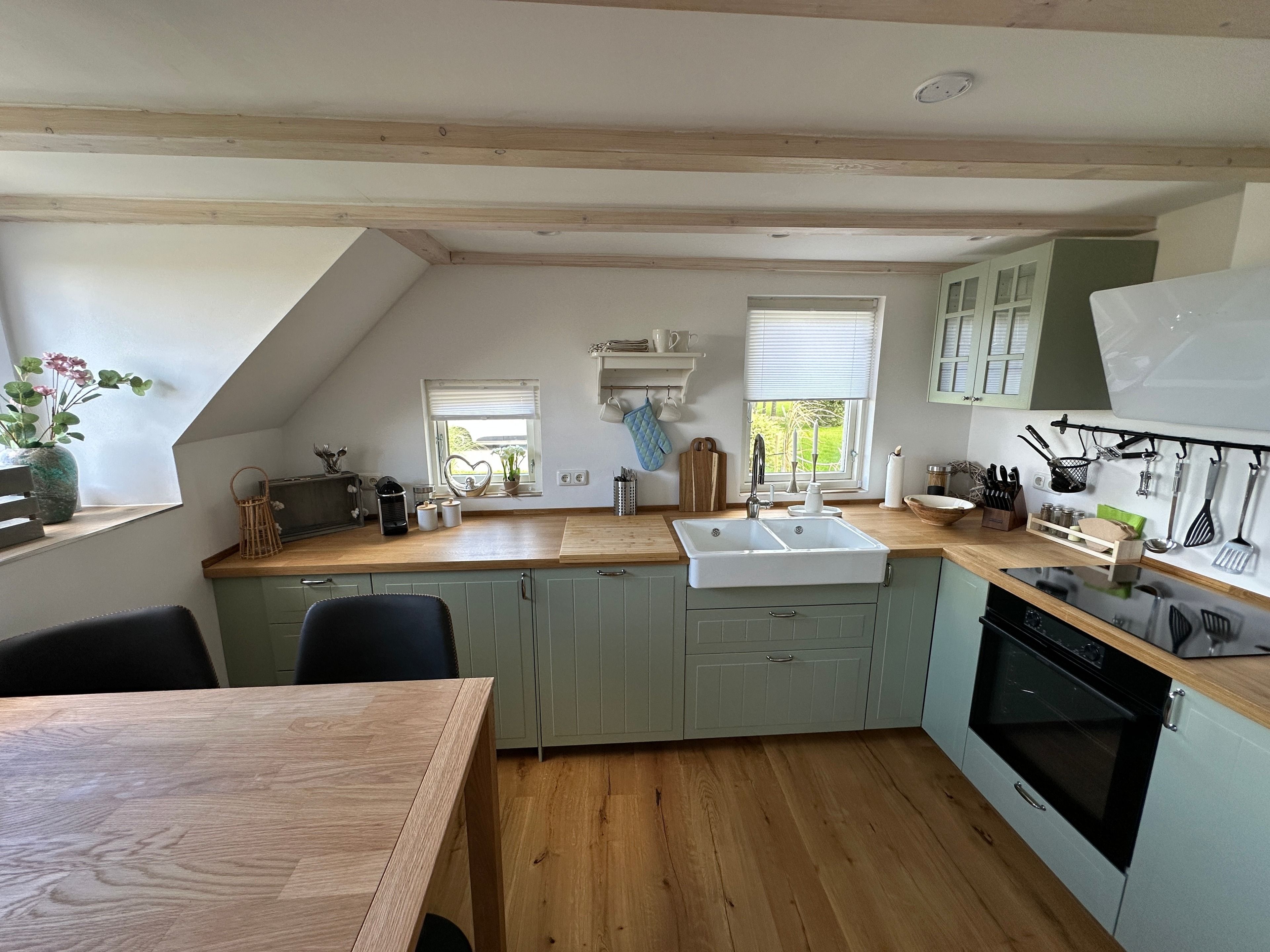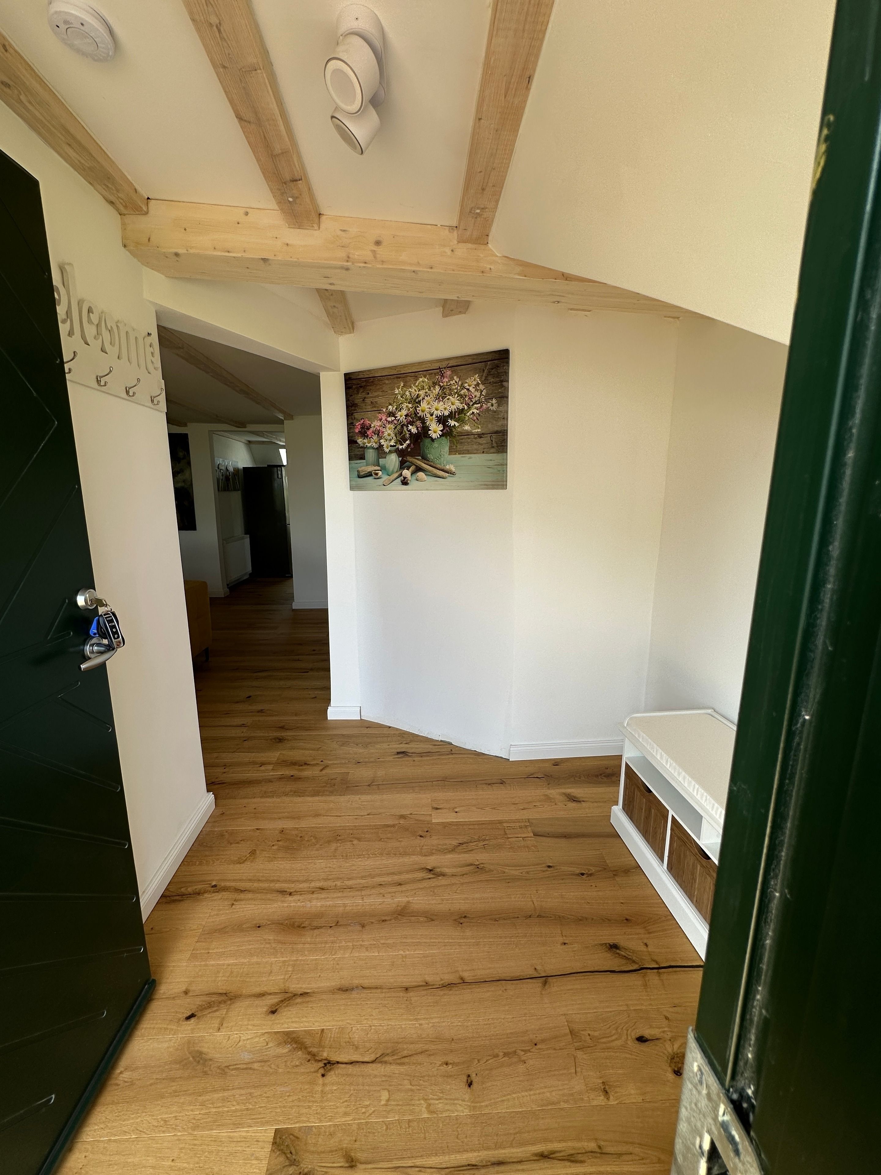 Frisch erstellte Ferienwohnung im Erdgeschoss mit zwei Schlafzimmern, Wohnzimmer, Bad mit Dusche und WC, Küche mit Einbauküche.